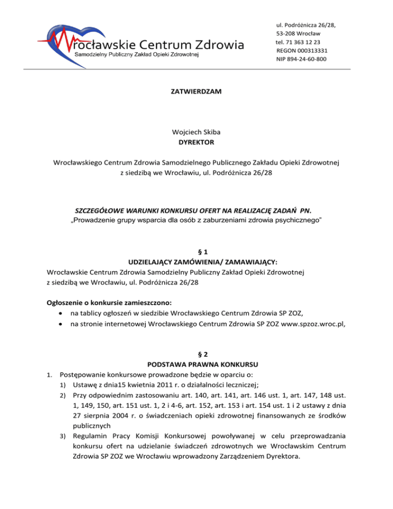 ul. Podróżnicza 26/28, 53-208 Wrocław tel. 71 363 12 23 REGON 000313331 NIP 894-24-60-800 ZATWIERDZAM Wojciech Skiba DYREKTOR Wrocławskiego Centrum Zdrowia Samodzielnego Publicznego Zakładu Opieki Zdrowotnej z siedzibą we Wrocławiu, ul. Podróżnicza 26/28 SZCZEGÓŁOWE WARUNKI KONKURSU OFERT NA REALIZACJĘ ZADAŃ PN. „Prowadzenie grupy wsparcia dla osób z zaburzeniami zdrowia psychicznego” §1 UDZIELAJĄCY ZAMÓWIENIA/ ZAMAWIAJĄCY: Wrocławskie Centrum Zdrowia Samodzielny Publiczny Zakład Opieki Zdrowotnej z siedzibą we Wrocławiu, ul. Podróżnicza 26/28 Ogłoszenie o konkursie zamieszczono: na tablicy ogłoszeń w siedzibie Wrocławskiego Centrum Zdrowia SP ZOZ, na stronie internetowej Wrocławskiego Centrum Zdrowia SP ZOZ www.spzoz.wroc.pl, §2 PODSTAWA PRAWNA KONKURSU 1. Postępowanie konkursowe prowadzone będzie w oparciu o: 1) Ustawę z dnia15 kwietnia 2011 r. o działalności leczniczej; 2) Przy odpowiednim zastosowaniu art. 140, art. 141, art. 146 ust. 1, art. 147, 148 ust. 1, 149, 150, art. 151 ust. 1, 2 i 4-6, art. 152, art. 153 i art. 154 ust. 1 i 2 ustawy z dnia 27 sierpnia 2004 r. o świadczeniach opieki zdrowotnej finansowanych ze środków publicznych 3) Regulamin Pracy Komisji Konkursowej powoływanej w celu przeprowadzania konkursu ofert na udzielanie świadczeń zdrowotnych we Wrocławskim Centrum Zdrowia SP ZOZ we Wrocławiu wprowadzony Zarządzeniem Dyrektora. 4) Postanowienia zawarte we wzorze umowy Udzielającego zamówienia, 5) Regulacje wewnętrzne, z którymi Oferent może zapoznać się w siedzibie zamawiającego. 2. W celu prawidłowego przygotowania i złożenia swojej oferty oferent powinien zapoznać się ze wszystkimi warunkami zawartymi w „Szczegółowych warunkach konkursu ofert”. §3 PRZEDMIOT ZAMÓWIENIA 1.Przedmiot zamówienia obejmuje: „Prowadzenie grupy wsparcia dla osób z zaburzeniami zdrowia psychicznego” 2. Udzielający zamówienia zastrzega sobie prawo wyboru takiej ilości ofert, która pozwoli realizować plan finansowy w danym zakresie na warunkach określonych umową z płatnikami. 3. Przedmiotem finansowania zadania, na które Oferent złożył Ofertę może być: „Prowadzenie grupy wsparcia dla osób z zaburzeniami zdrowia psychicznego” §4 PRZEWIDYWANY CZAS TRWANIA UMOWY Umowa na realizację zadania w zakresie, o którym mowa w § 3 pkt. 1 zostanie zawarta na okres: od podpisania umowy do dnia 30.11.2017r. §5 TERMINY Termin składania ofert: do dnia 25.01.2017r do godz. 09:00. Termin otwarcia ofert: o godz. 10.30 w dniu 25.01.2017r w siedzibie Udzielającego zamówienia. Rozstrzygnięcie konkursu ofert zostanie ogłoszone na stronie internetowej Wrocławskiego Centrum Zdrowia SPZOZ we Wrocławiu www.spzoz.wroc.pl i Tablicy ogłoszeń w siedzibie WCZ SP ZOZ we Wrocławiu 25.01.2017 r. do godz. 15.00 Termin, do którego Oferent będzie związany ofertą: 1) Składający ofertę pozostaje nią związany przez okres 30 dni; 2) Bieg terminu rozpoczyna się wraz z upływem terminu składania ofert. §6 WYMAGANIA W STOSUNKU DO OFERENTÓW 1. Do składania ofert i uczestnictwa w konkursie zaprasza się podmioty wykonujące działalność leczniczą lub osoby legitymujące się nabyciem fachowych kwalifikacji do udzielania świadczeń w określonym zakresie zgodnie z wymaganiami określonymi w § 6 ust 2 2. Wymagania dla Oferenta wymienionego w § 6 stanowią np: Przedmiot Wymagane Oczekiwane Maksymalna zamówienia Miejsce minimalne terminy realizacji liczba sesji w realizacji kwalifikacje trakcie trwania umowy Prowadzenie grupy Wrocław Psycholog, Od poniedziałku 43 sesje wsparcia dla osób z Przychodnia psychiatra do piątku – 1 na jedną zaburzeniami Zdrowia z doświadczeniem dzień w tygodniu, osobę zdrowia psychicznego Psychicznego w pracy można prowadzącą i Leczenia z osobami uwzględnić Grupę Uzależnień z zaburzeniami przerwę wsparcia ul. Podwale 13 zdrowia urlopową 50-043 psychicznego Czas trwania sesji (Grupa Wrocław. W grupy wsparcia wsparcia trakcie roku 1,5 godziny prowadzona miejsce jest realizacji może jednocześnie ulec zmianie przez 2 osoby)* o Udzielający zamówienia zastrzega sobie możliwość zwiększenia liczby godzin rocznie do 50% w przedmiocie zamówienia z zachowaniem warunków określonych w ofercie złożonej w konkursie w przypadku pozyskania większych środków na realizację zadań. o Udzielający zamówienia zastrzega sobie możliwość zmniejszenia liczby godzin rocznie do 50% w przedmiocie zamówienia z zachowaniem warunków określonych w ofercie złożonej w konkursie w przypadku nie pozyskania środków na realizację zadań. o Oferent prowadzi i przechowuje dokumentację zgodnie z zasadami obowiązującymi w w/w Programie oraz udostępnia ją do wglądu osobom upoważnionym. §7 WYMAGANE DOKUMENTY 1. Oferta biorąca udział w konkursie na realizację zadania powinna zawierać wypełniony formularz ofertowy, stanowiący załącznik nr 1 do niniejszych Szczegółowych warunków konkursu ofert. 2. Wraz z formularzem ofertowym należy dołączyć wymagane dokumenty: 1) Kopię dokumentów stwierdzających posiadanie wymaganych kwalifikacji do realizacji oferowanego zadania 2) Kopię zaświadczenia o wpisie do Centralnej Ewidencji i Informacji o Działalności Gospodarczej lub odpis aktualny KRS 3) Kopię zaświadczenia o szkoleniu BHP/ oświadczenie 4) Kopię orzeczenia o stanie zdrowia wydane przez lekarza medycyny pracy lub oświadczenie 5) Kopię dokumentu potwierdzającego uzyskanie nr NIP lub potwierdzony przez Oferenta wydruk CEIDG/KRS; 6) Kopię dokumentu potwierdzającego uzyskanie nr REGON lub potwierdzony przez Oferenta wydruk CEIDG/KRS; 7) Kopię polisy OC lub oświadczenie o zobowiązaniu się do jej przedłożenia przy odpisywaniu umowy z Udzielającym zamówienia; 8) Pełnomocnictwo w przypadku, gdy oferta sporządzona jest przez pełnomocnika. 3. Punkty 2, 5, 6 § 7 ust 2 dotyczą osób prowadzących działalność gospodarczą. 1. 2. 3. 4. 5. 6. §8 ZASAD