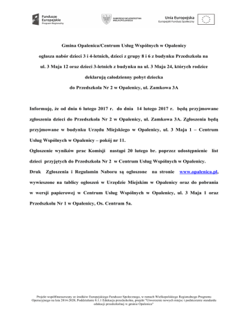 Gmina Opalenica/Centrum Usług Wspólnych w Opalenicy ogłasza nabór dzieci 3 i 4-letnich, dzieci z grupy 8 i 6 z budynku Przedszkola na ul. 3 Maja 12 oraz dzieci 3-letnich z budynku na ul. 3 Maja 24, których rodzice deklarują całodzienny pobyt dziecka do Przedszkola Nr 2 w Opalenicy, ul. Zamkowa 3A Informuję, że od dnia 6 lutego 2017 r. do dnia 14 lutego 2017 r. będą przyjmowane zgłoszenia dzieci do Przedszkola Nr 2 w Opalenicy, ul. Zamkowa 3A. Zgłoszenia będą przyjmowane w budynku Urzędu Miejskiego w Opalenicy, ul. 3 Maja 1 – Centrum Usług Wspólnych w Opalenicy – pokój nr 11. Ogłoszenie wyników prac Komisji nastąpi 20 lutego br. poprzez udostępnienie list dzieci przyjętych do Przedszkola Nr 2 w Centrum Usług Wspólnych w Opalenicy. Druk Zgłoszenia i Regulamin Naboru są ogłoszone na stronie www.opalenica.pl, wywieszone na tablicy ogłoszeń w Urzędzie Miejskim w Opalenicy oraz do pobrania w wersji papierowej w Centrum Usług Wspólnych w Opalenicy, ul. 3 Maja 1 oraz Przedszkolu Nr 1 w Opalenicy, Os. Centrum 5a. Projekt współfinansowany ze środków Europejskiego Fundusze Społecznego, w ramach Wielkopolskiego Regionalnego Programu Operacyjnego na lata 2014-2020, Poddziałanie 8.1.1 Edukacja przedszkolna, projekt "Utworzenie nowych miejsc i podniesienie standardu edukacji przedszkolnej w gminie Opalenica"