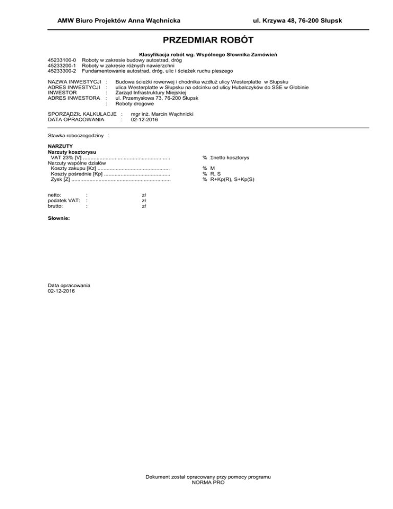 AMW Biuro Projektów Anna Wąchnicka ul. Krzywa 48, 76-200 Słupsk PRZEDMIAR ROBÓT 45233100-0 45233200-1 45233300-2 Klasyfikacja robót wg. Wspólnego Słownika Zamówień Roboty w zakresie budowy autostrad, dróg Roboty w zakresie różnych nawierzchni Fundamentowanie autostrad, dróg, ulic i ścieżek ruchu pieszego NAZWA INWESTYCJI ADRES INWESTYCJI INWESTOR ADRES INWESTORA : : : : : Budowa ścieżki rowerwej i chodnika wzdłuż ulicy Westerplatte w Słupsku ulica Westerplatte w Słupsku na odcinku od ulicy Hubalczyków do SSE w Głobinie Zarząd Infrastruktury Miejskiej ul. Przemysłowa 73, 76-200 Słupsk Roboty drogowe SPORZĄDZIŁ KALKULACJE : DATA OPRACOWANIA : mgr inż. Marcin Wąchnicki 02-12-2016 Stawka roboczogodziny : NARZUTY Narzuty kosztorysu VAT 23% [V] .......................................................... Narzuty wspólne działów Koszty zakupu [Kz] ................................................ Koszty pośrednie [Kp] ............................................ Zysk [Z] .................................................................. netto: podatek VAT: brutto: : : : % Σnetto kosztorys % M % R, S % R+Kp(R), S+Kp(S) zł zł zł Słownie: Data opracowania 02-12-2016 Dokument został opracowany przy pomocy programu NORMA PRO Ścieżka Westerplatte ŚCIEŻKA.kst PRZEDMIAR Lp. Opis i wyliczenia j.m. 1 ROBOTY PRZYGOTOWAWCZE I ZIEMNE 1 Roboty pomiarowe przy liniowych robotach ziemnych - trasa dróg w terenie równinnym. km d.1 2 km 2 Rozebranie nawierzchni z płyt betonowych, kostki betonowej, betonowej wraz z wywod.1 zem na składowisko wykonawcy 200 m2 3 Ścinanie drzew piłą mechaniczną d.1 19 szt. 4 Mechaniczne karczowanie pni wraz z wywozem na składowisko wykonawcy d.1 19 szt. 5 Wykopy oraz przekopy wykonywane koparkami chwytakowymi 0.40 m3 na odkład w d.1 gruncie kat. III 2953+224 m3 6 Roboty ziemne wykonywane koparkami podsiębiernymi o poj.łyżki 0.60 m3 w gr.kat.I-II d.1 z transportem urobku samochodami samowyładowczymi - wykonanie nasypów 6949+1022 m3 7 Kanał technologiczny d.1 8 m m2 szt. szt. m3 m3 m 2 ŚCIEŻKA ROWEROWA 8 Koryta gł. 30 cm wykonywane w gruntach kat. II-IV na poszerzeniach jezdni lub chodni- m2 d.2 ków z wywozem Krotność = 1.13 3112 m2 9 Profilowanie i zagęszczanie podłoża wykonywane mechanicznie w gruncie kat. II-IV pod m2 d.2 warstwy konstrukcyjne nawierzchni 3112 m2 10 Warstwy odcinające zagęszczane mechanicznie o grubości 15 cm d.2 3112 m2 11 Warstwa górna podbudowy z kruszyw łamanych gr. 10 cm d.2 Krotność = 2 3112 m2 m2 m2 12 Nawierzchnie z mieszanek mineralno-bitumicznych asfaltowych o grubości 4 cm (warst- m2 d.2 wa ścieralna) 3112 m2 3 ŚCIEŻKA ROWEROWA NAD S6 13 Koryta gł. 30 cm wykonywane w gruntach kat. II-IV na poszerzeniach jezdni lub chodni- m2 d.3 ków z wywozem Krotność = 1.2 668+275 m2 14 Profilowanie i zagęszczanie podłoża wykonywane mechanicznie w gruncie kat. II-IV pod m2 d.3 warstwy konstrukcyjne nawierzchni 668 m2 15 Warstwy odsączające wykonane i zagęszczane mechanicznie o gr.10 cm d.3 668 m2 16 Warstwa górna podbudowy z kruszyw łamanych gr. 15 cm d.3 275 m2 17 Chodniki z kostki brukowej betonowej grubości 8 cm na podsypce cementowo-piaskod.3 wej z wypełnieniem spoin piaskiem 275+668 m2 m2 4 CIĄG PIESZO ROWEROWY -2- Norma PRO Wersja 4.34 Nr seryjny: 26514 Użytkownik: AMW m2 m2 Poszcz Razem 2.000 RAZEM 2.000 200.000 RAZEM 200.000 19.000 RAZEM 19.000 19.000 RAZEM 19.000 3177.000 RAZEM 3177.000 7971.000 RAZEM 7971.000 8.00 RAZEM 8.00 3112.000 RAZEM 3112.000 3112.000 RAZEM 3112.000 3112.000 RAZEM 3112.000 3112.000 RAZEM 3112.000 3112.000 RAZEM 3112.000 943.000 RAZEM 943.000 668.000 RAZEM 668.000 668.000 RAZEM 668.000 275.000 RAZEM 275.000 943.000 RAZEM 943.000 Ścieżka Westerplatte ŚCIEŻKA.kst PRZEDMIAR Lp. Opis i wyliczenia j.m. 18 Koryta gł. 30 cm wykonywane w gruntach kat. II-IV na poszerzeniach jezdni lub chodni- m2 d.4 ków z wywozem Krotność = 1.13 1168 m2 19 Profilowanie i zagęszczanie podłoża wykonywane mechanicznie w gruncie kat. II-IV pod m2 d.4 warstwy konstrukcyjne nawierzchni 1168 m2 20 Warstwy odcinające zagęszczane mechanicznie o grubości 15 cm d.4 1168 m2 21 Warstwa górna podbudowy z kruszyw łamanych gr. 10 cm d.4 Krotność = 2 1168 m2 m2 m2 22 Nawierzchnie z mieszanek mineralno-bitumicznych asfaltowych o grubości 4 cm (warst- m2 d.4 wa ścieralna) 1168 m2 5 CHODNIK 23 Koryta gł. 30 cm wykonywane w gruntach kat. II-IV na poszerzeniach jezdni lub chodni- m2 d.5 ków z wywozem Krotność = 1.26 126 m2 24 Profilowanie i zagęszczanie podłoża wykonywane mechanicznie w gruncie kat. II-IV pod m2 d.5 warstwy konstrukcyjne nawierzchni 126 m2 25 Warstwy odcinające zagęszczane mechanicznie o grubości 10 cm d.5 126 m2 26 Warstwa górna podbudowy z kruszyw łamanych gr. 15 cm d.5 126 m2 27 Chodniki z kostki brukowej betonowej grubości 8 cm na podsypce cementowo-piaskod.5 wej z wypełnieniem spoin piaskiem 126 m2 m2 m2 m2 6 ZATOKA AUTOBUSOWA 28 Koryta gł. 30 cm wykonywane w gruntach kat. II-IV na poszerzeniach jezdni lub chodni- m2 d.6 ków z wywozem Krotność = 1.7 120 m2 29 Profilowanie i zagęszczanie podłoża wykonywane mechanicznie w gruncie kat. II-IV pod m2 d.6 warstwy konstrukcyjne nawierzchni 120 m2 30 Podbudowy z gruntu stabilizowanego cementem w ilości 25 kg/m2, warstwa gr.15 cm d.6 120 m2 31 Podbudowy betonowe gr.20 cm d.6 Krotność = 2 120 m2 32 Wykonanie nawierzchni betonowej - ulozenie nawierzchni o grubosci 23cm po zageszd.6 czeniu 120 m2 m2 7 OBRZEŻA ŚCIEŻKA 33 Rowki pod krawężniki i ławy krawężnikowe o wymiarach 30x30 cm w gruncie kat.III-IV d.7 3992 m2 Razem 1168.000 RAZEM 1168.000 1168.000 RAZEM 1168.000 1168.000 RAZEM 1168.000 1168.000 RAZEM 1168.000 1168.000 RAZEM 1168.000 126.000 RAZEM 126.000 126.000 RAZEM 126.000 126.000 RAZEM 126.000 126.000 RAZEM 126.000 126.000 RAZEM 126.000 120.000 RAZEM 120.000 120.000 RAZEM 120.000 120.000 RAZEM 120.000 120.000 RAZEM 120.000 120.000 RAZEM 120.000 3992.000 RAZEM 3992.000 159.680 