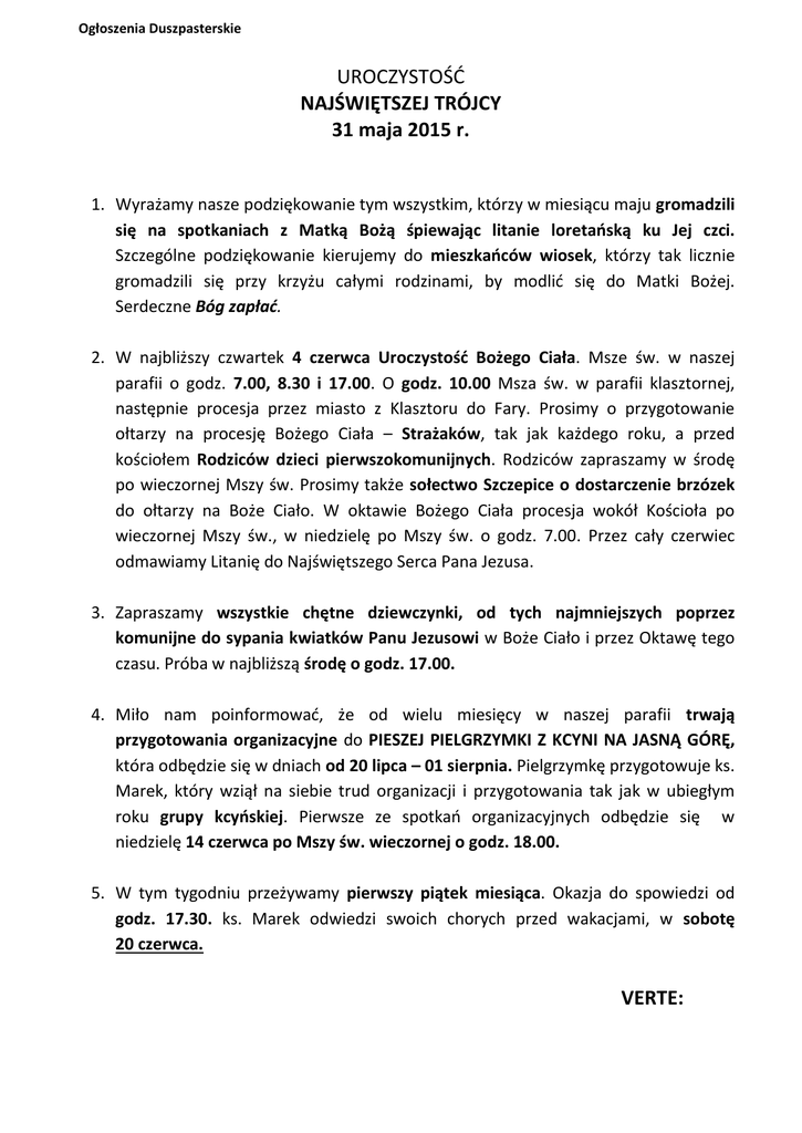 Ogłoszenia Duszpasterskie UROCZYSTOŚĆ NAJŚWIĘTSZEJ TRÓJCY 31 maja 2015 r. 1. Wyrażamy nasze podziękowanie tym wszystkim, którzy w miesiącu maju gromadzili się na spotkaniach z Matką Bożą śpiewając litanie loretańską ku Jej czci. Szczególne podziękowanie kierujemy do mieszkańców wiosek, którzy tak licznie gromadzili się przy krzyżu całymi rodzinami, by modlić się do Matki Bożej. Serdeczne Bóg zapłać. 2. W najbliższy czwartek 4 czerwca Uroczystość Bożego Ciała. Msze św. w naszej parafii o godz. 7.00, 8.30 i 17.00. O godz. 10.00 Msza św. w parafii klasztornej, następnie procesja przez miasto z Klasztoru do Fary. Prosimy o przygotowanie ołtarzy na procesję Bożego Ciała – Strażaków, tak jak każdego roku, a przed kościołem Rodziców dzieci pierwszokomunijnych. Rodziców zapraszamy w środę po wieczornej Mszy św. Prosimy także sołectwo Szczepice o dostarczenie brzózek do ołtarzy na Boże Ciało. W oktawie Bożego Ciała procesja wokół Kościoła po wieczornej Mszy św., w niedzielę po Mszy św. o godz. 7.00. Przez cały czerwiec odmawiamy Litanię do Najświętszego Serca Pana Jezusa. 3. Zapraszamy wszystkie chętne dziewczynki, od tych najmniejszych poprzez komunijne do sypania kwiatków Panu Jezusowi w Boże Ciało i przez Oktawę tego czasu. Próba w najbliższą środę o godz. 17.00. 4. Miło nam poinformować, że od wielu miesięcy w naszej parafii trwają przygotowania organizacyjne do PIESZEJ PIELGRZYMKI Z KCYNI NA JASNĄ GÓRĘ, która odbędzie się w dniach od 20 lipca – 01 sierpnia. Pielgrzymkę przygotowuje ks. Marek, który wziął na siebie trud organizacji i przygotowania tak jak w ubiegłym roku grupy kcyńskiej. Pierwsze ze spotkań organizacyjnych odbędzie się w niedzielę 14 czerwca po Mszy św. wieczornej o godz. 18.00. 5. W tym tygodniu przeżywamy pierwszy piątek miesiąca. Okazja do spowiedzi od godz. 17.30. ks. Marek odwiedzi swoich chorych przed wakacjami, w sobotę 20 czerwca. VERTE: 6. Wielkimi krokami zbliżamy się do kolejnego IX festynu parafialnego „Pomóżmy Farze”. To już w najbliższą niedzielę 7 czerwca będziemy wspólnie świętować, by w dalszym ciągu remontować naszą świątynię. Przypominamy, że celem tegorocznego festynu jest wymiana konfesjonałów na nowe z możliwością rozmowy i spowiadania przy drzwiach zamkniętych. Przedsprzedaż losów od najbliższego poniedziałku jedynie w sklepie u pani Moniki Wołyńskiej. 7. Miło nam poinformować, że nagrodami głównymi tegorocznego festynu są m.in. LAPTOP ufundowany przez BS w Kcyni, KONSOLA PlayStation 4, wyjazd na LITWĘ (4 dni) ufundowany przez firmę EURO-TIM z Bydgoszczy, LODÓWKA, PRALKA AUTOMATYCZNA, ROWER ufundowany przez firmę pana Marka Michalaka z Kcyni, DARMOWY INTERNET ufundowany przez firmę państwa Kant, oraz PROFESJONALNA SESJA ZDJĘCIOWA wykonana przez firmę z Poznania. Przypominamy, że festyn nasz odbędzie się w niedzielę 7 czerwca. Rozpoczynamy Mszą Św. o godz. 7.00 w naszym kościele w intencji Festynu, a następnie o godz. 15.00 spotykamy się na terenie przy naszym kościele farnym. Gościem festynu jest zespół SONETT, który wprowadzi nas w nastrój muzyki z dawnych lat, a także współczesnych aranżacji muzycznych. Ponad to animację muzyczną w trakcie festynu z uczestnikami poprowadzi DJ ZOMBEK z Gniezna. Wystąpią także m.in. DZIECI i MŁODZIEŻ z Gminnego Centrum Kultury i Biblioteki, nasza ORKIESTRA działająca przy OSP, zespół PAŁUKI. Będzie rodzinnie, czeka nas wspólna zabawa oraz wiele niespodzianek… Już dziś serdecznie zapraszamy do wspólnego świętowania! 8. W tym roku przypada setna rocznica urodzin nieżyjącego już wielkiego kapłana i poety ks. Jana Twardowskiego. Z tego względu w dzisiejszym Przewodniku Katolickim znajduje się specjalny dodatek w postaci książeczki z myślami ks. Twardowskiego na cały okres wakacji. Cena Przewodnika 5 zł. Serdecznie zapraszamy do nabywania.