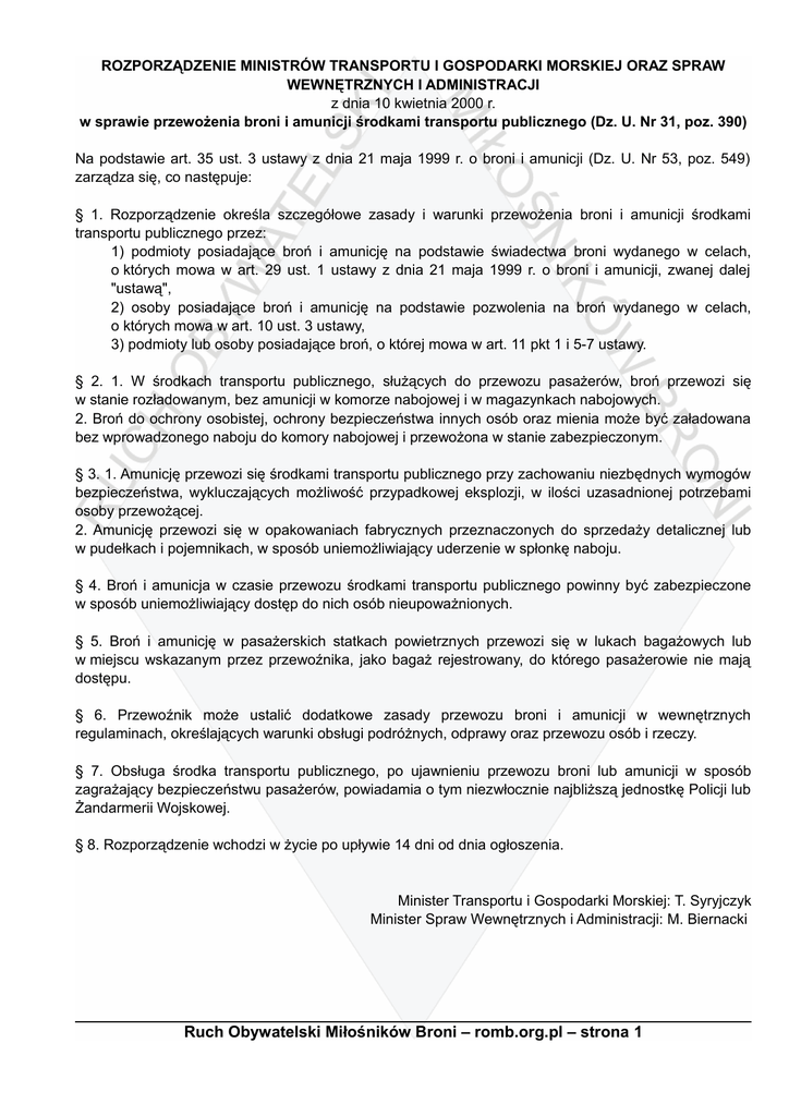 ROZPORZĄDZENIE MINISTRÓW TRANSPORTU I GOSPODARKI MORSKIEJ ORAZ SPRAW WEWNĘTRZNYCH I ADMINISTRACJI z dnia 10 kwietnia 2000 r. w sprawie przewożenia broni i amunicji środkami transportu publicznego (Dz. U. Nr 31, poz. 390) Na podstawie art. 35 ust. 3 ustawy z dnia 21 maja 1999 r. o broni i amunicji (Dz. U. Nr 53, poz. 549) zarządza się, co następuje: § 1. Rozporządzenie określa szczegółowe zasady i warunki przewożenia broni i amunicji środkami transportu publicznego przez: 1) podmioty posiadające broń i amunicję na podstawie świadectwa broni wydanego w celach, o których mowa w art. 29 ust. 1 ustawy z dnia 21 maja 1999 r. o broni i amunicji, zwanej dalej "ustawą", 2) osoby posiadające broń i amunicję na podstawie pozwolenia na broń wydanego w celach, o których mowa w art. 10 ust. 3 ustawy, 3) podmioty lub osoby posiadające broń, o której mowa w art. 11 pkt 1 i 5-7 ustawy. § 2. 1. W środkach transportu publicznego, służących do przewozu pasażerów, broń przewozi się w stanie rozładowanym, bez amunicji w komorze nabojowej i w magazynkach nabojowych. 2. Broń do ochrony osobistej, ochrony bezpieczeństwa innych osób oraz mienia może być załadowana bez wprowadzonego naboju do komory nabojowej i przewożona w stanie zabezpieczonym. § 3. 1. Amunicję przewozi się środkami transportu publicznego przy zachowaniu niezbędnych wymogów bezpieczeństwa, wykluczających możliwość przypadkowej eksplozji, w ilości uzasadnionej potrzebami osoby przewożącej. 2. Amunicję przewozi się w opakowaniach fabrycznych przeznaczonych do sprzedaży detalicznej lub w pudełkach i pojemnikach, w sposób uniemożliwiający uderzenie w spłonkę naboju. § 4. Broń i amunicja w czasie przewozu środkami transportu publicznego powinny być zabezpieczone w sposób uniemożliwiający dostęp do nich osób nieupoważnionych. § 5. Broń i amunicję w pasażerskich statkach powietrznych przewozi się w lukach bagażowych lub w miejscu wskazanym przez przewoźnika, jako bagaż rejestrowany, do którego pasażerowie nie mają dostępu. § 6. Przewoźnik może ustalić dodatkowe zasady przewozu broni i amunicji w wewnętrznych regulaminach, określających warunki obsługi podróżnych, odprawy oraz przewozu osób i rzeczy. § 7. Obsługa środka transportu publicznego, po ujawnieniu przewozu broni lub amunicji w sposób zagrażający bezpieczeństwu pasażerów, powiadamia o tym niezwłocznie najbliższą jednostkę Policji lub Żandarmerii Wojskowej. § 8. Rozporządzenie wchodzi w życie po upływie 14 dni od dnia ogłoszenia. Minister Transportu i Gospodarki Morskiej: T. Syryjczyk Minister Spraw Wewnętrznych i Administracji: M. Biernacki Ruch Obywatelski Miłośników Broni – romb.org.pl – strona 1