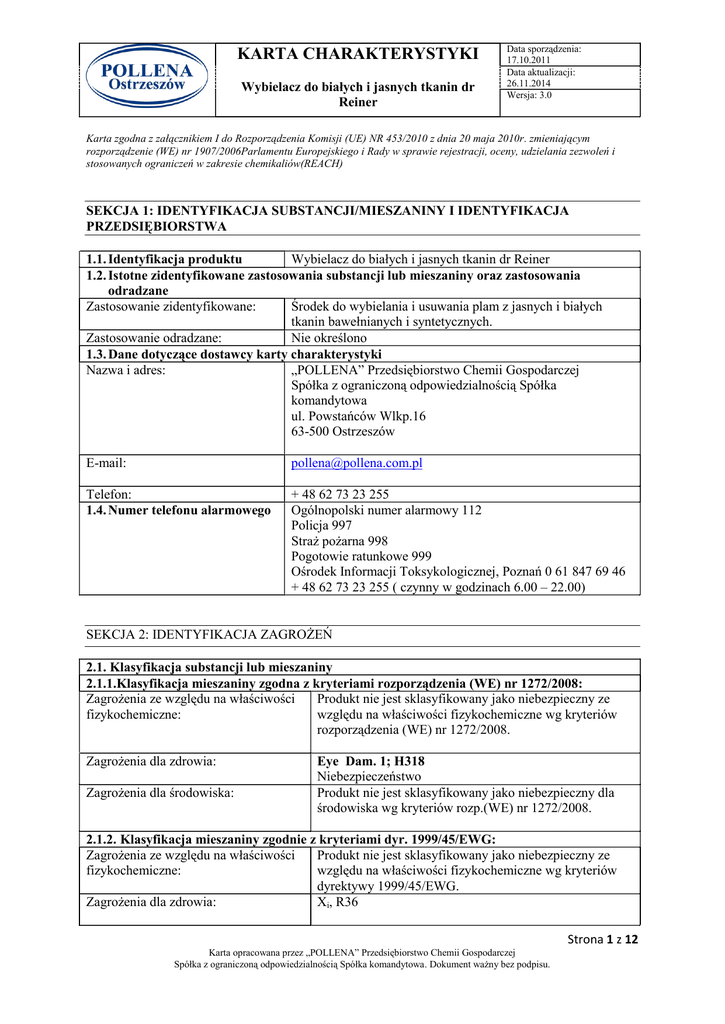 KARTA CHARAKTERYSTYKI Wybielacz do białych i jasnych tkanin dr Reiner Data sporządzenia: 17.10.2011 Data aktualizacji: 26.11.2014 Wersja: 3.0 Karta zgodna z załącznikiem I do Rozporządzenia Komisji (UE) NR 453/2010 z dnia 20 maja 2010r. zmieniającym rozporządzenie (WE) nr 1907/2006Parlamentu Europejskiego i Rady w sprawie rejestracji, oceny, udzielania zezwoleń i stosowanych ograniczeń w zakresie chemikaliów(REACH) SEKCJA 1: IDENTYFIKACJA SUBSTANCJI/MIESZANINY I IDENTYFIKACJA PRZEDSIĘBIORSTWA Wybielacz do białych i jasnych tkanin dr Reiner 1.1. Identyfikacja produktu 1.2. Istotne zidentyfikowane zastosowania substancji lub mieszaniny oraz zastosowania odradzane Zastosowanie zidentyfikowane: Środek do wybielania i usuwania plam z jasnych i białych tkanin bawełnianych i syntetycznych. Zastosowanie odradzane: Nie określono 1.3. Dane dotyczące dostawcy karty charakterystyki Nazwa i adres: „POLLENA” Przedsiębiorstwo Chemii Gospodarczej Spółka z ograniczoną odpowiedzialnością Spółka komandytowa ul. Powstańców Wlkp.16 63-500 Ostrzeszów E-mail: [email protected] Telefon: 1.4. Numer telefonu alarmowego + 48 62 73 23 255 Ogólnopolski numer alarmowy 112 Policja 997 Straż pożarna 998 Pogotowie ratunkowe 999 Ośrodek Informacji Toksykologicznej, Poznań 0 61 847 69 46 + 48 62 73 23 255 ( czynny w godzinach 6.00 – 22.00) SEKCJA 2: IDENTYFIKACJA ZAGROŻEŃ 2.1. Klasyfikacja substancji lub mieszaniny 2.1.1.Klasyfikacja mieszaniny zgodna z kryteriami rozporządzenia (WE) nr 1272/2008: Zagrożenia ze względu na właściwości Produkt nie jest sklasyfikowany jako niebezpieczny ze fizykochemiczne: względu na właściwości fizykochemiczne wg kryteriów rozporządzenia (WE) nr 1272/2008. Zagrożenia dla zdrowia: Zagrożenia dla środowiska: Eye Dam. 1; H318 Niebezpieczeństwo Produkt nie jest sklasyfikowany jako niebezpieczny dla środowiska wg kryteriów rozp.(WE) nr 1272/2008. 2.1.2. Klasyfikacja mieszaniny zgodnie z kryteriami dyr. 1999/45/EWG: Zagrożenia ze względu na właściwości Produkt nie jest sklasyfikowany jako niebezpieczny ze fizykochemiczne: względu na właściwości fizykochemiczne wg kryteriów dyrektywy 1999/45/EWG. Zagrożenia dla zdrowia: Xi, R36 Strona 1 z 12 Karta opracowana przez „POLLENA” Przedsiębiorstwo Chemii Gospodarczej Spółka z ograniczoną odpowiedzialnością Spółka komandytowa. Dokument ważny bez podpisu. KARTA CHARAKTERYSTYKI Wybielacz do białych i jasnych tkanin dr Reiner Zagrożenia dla środowiska: Data sporządzenia: 17.10.2011 Data aktualizacji: 26.11.2014 Wersja: 3.0 Produkt nie jest sklasyfikowany jako niebezpieczny dla środowiska wg kryteriów dyrektywy 1999/45/EWG. 2.2. Elementy oznakowania wg rozporządzenia (WE) nr 1272/2008 Piktogramy: Hasło ostrzegawcze: Zwroty wskazujące rodzaj zagrożenia (zwroty H): Zwroty wskazujący środki ostrożności: (zwroty P): Dodatkowe informacje: Zawiera: 2.3. Rezultaty oceny PBT i vPvB. Niebezpieczeństwo H318 – Powoduje poważne uszkodzenie oczu. P102: Chronić przed dziećmi P280: Stosować okulary ochronne. P305+351+338: W PRZYPADKU DOSTANIA SIĘ DO OCZU: Ostrożnie płukać wodą przez kilka minut. Wyjąć soczewki kontaktowe, jeżeli są i można je łatwo usunąć. Nadal płukać P310: Natychmiast skontaktować się z lekarzem P103: Przed użyciem przeczytać etykietę P401: Przechowywać w pozycji pionowej w chłodnym i ciemnym miejscu Skład: 5-15 % niejonowe środki powierzchniowo czynne; < 5% związki wybielające na bazie tlenu, polikarboksylany, fosfoniany, EDTA i jego sole; Inne: kompozycja zapachowa, Butylphenyl Methylpropional, Alpha-Methyl Ionone, Hexyl Cinnamal Etoksylowany alkohol tłuszczowy C12-C15 Nie ma danych SEKCJA 3: SKŁAD / INFORMACJA O SKŁADNIKACH 3.1. Substancje Nie ma zastosowania, produkt jest mieszaniną. 3.2. Mieszaniny Nazwa substancji/ numer indeksowy Alkohole, C12-15, etoksylowane Nadtlenek wodoru Nr rejestracji WE CAS Polimer 6813139-5 Stężenie Klasyfikacja Dyr.67/548/E WG < 10% Xi; R41 N; R50 Klasyfikacja Rozp. 1272/2008 Eye Dam.1, H 318 Aquatic Acute 1, H400 Aquatic Chronic 3, H412 Niebezpieczeństwo Acute Tox.4, H302 Eye Dam.1, H318 012317722< 5% Xn; R22 2119485845765-0 84-1 Xi; R41 22-xxxx Uwaga: Substancje bez numeru indeksowego nie mają oficjalnej klasyfikacji. Klasyfikacja wykonana przez producenta. Strona 2 z 12 Karta opracowana przez „POLLENA” Przedsiębiorstwo Chemii Gospodarczej Spółka z ograniczoną odpowiedzialnością Spółka komandytowa. Dokument ważny bez podpisu. KARTA CHARAKTERYSTYKI Wybielacz do białych i jasnych tkanin dr Reiner Data sporządzenia: 17.10.2011 Data aktualizacji: 26.11.2014 Wersja: 3.0 SEKCJA 4: ŚRODKI PIERWSZEJ POMOCY 4.1. Opis środków pierwszej pomocy Wdychanie: Osobę poszkodowaną wyprowadzić na świeże powietrze, zapewnić ciepło, spokój i warunki do odpoczynku. Zasięgnąć porady lekarza w przypadku utrzymywania się jakichkolwiek dolegliwości. Kontakt ze skórą: Zdjąć zanieczyszczoną odzież. Skórę zanieczyszczoną produktem umyć dużą ilością wody z mydłem i starannie spłukać. Zasięgnąć porady lekarza w przypadku utrzymywania się jakichkolwiek dolegliwości, np. cech podrażnienia lub uszkodzenia skóry. Kontakt z oczami: Przy podwiniętych powiekach niezwłocznie przemyć oczy dużą ilością czystej bieżącej wody lub roztworem soli fizjologicznej (przemywać przez co najmniej 15 minut). W międzyczasie usunąć soczewki kontaktowe, jeśli są i można je łatwo usunąć. Zasięgnąć porady lekarza - okulisty w przypadku utrzymywania się jakichkolwiek dolegliwości. Połknięcie: Przepłukać usta wodą. Nie wywoływać wymiotów bez uprzedniego zalecenia przez lekarza. Zasięgnąć porady lekarza pokazać kartę charakterystyki. Osobie nieprzytomnej nie podawać żadnych środków doustnie. 4.2. Najważniejsze ostre i opóźnione objawy oraz skutki narażenia: Nie ma danych. Drogi wchłaniania do organizmu: Skutki narażenia ostrego: Działa drażni