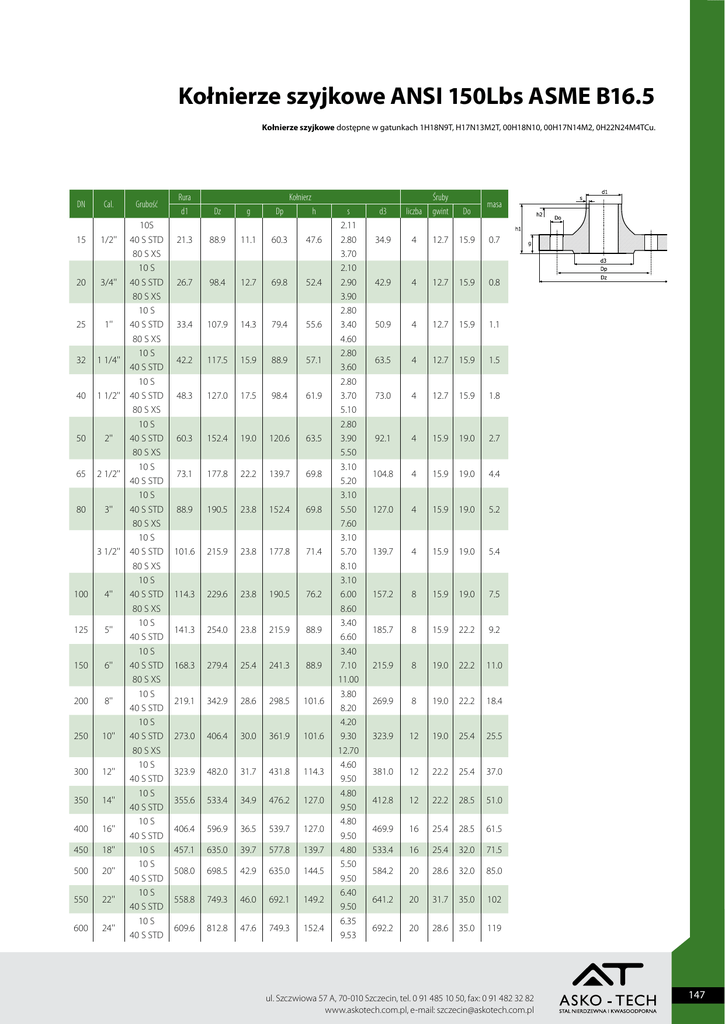 Kołnierze szyjkowe ANSI 150Lbs ASME B16.5 - Asko-Tech