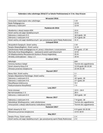 Kalendarz roku szkolnego 2016/17 w Szkole Podstawowej nr 2 im. Ewy Krauze Wrzesień 2016 Uroczyste rozpoczęcie roku szkolnego Rada Pedagogiczna Zebranie z rodzicami 1 IX 13 IX 13 IX Październik 2016 Akademia z okazji święta KEN Dzień wolny od zajęć dydaktycznych Zebrania z rodzicami 0-3 Zebrania z rodzicami 4-6 Dzień wolny od zajęć dydaktycznych (po pozytywnej opinii Rady Rodziców) Listopad 2016 Wszystkich Świętych. Dzień wolny Święto Niepodległości. Dzień wolny Szkoleniowa Rada pedagogiczna nt. pracy z dzieckiem z orzeczeniem Obchody Dnia Niepodległości – śpiewanie pieśni patriotycznych VII Międzyszkolny Recytatorski Konkurs Poezji Angielskiej Wróżby andrzejkowe – klasy 1-3 Grudzień 2016 Mikołajki Gminny konkurs kolęd Dzień otwarty klasy 0-6 Zimowa przerwa świąteczna Styczeń 2017 Nowy Rok. Dzień wolny Święto Objawienia Pańskiego. Dzień wolny Zebrania z rodzicami 0-3 Zebrania z rodzicami 4-6 Klasyfikacja śródroczna Podsumowanie Klasyfikacji Luty 2017 Ferie zimowe Bal karnawałowy 1-3 Zebrania z rodzicami 0-3 Marzec 2017 Zebrania z rodzicami 4-6 Rekolekcje Wielkopostne, rada szkoleniowa Uroczystość z okazji zakończenia rozbudowy szkoły Kwiecień 2017 Dzień otwarty kl. 0-6 Wiosenna przerwa świąteczna Maj 2017 Święto Pracy. Dzień wolny Dzień wolny od zajęć dydaktycznych (po pozytywnej opinii Rady Rodziców) 13 X 14 X 18 X godz. 18 25 X godz.18 31 X 1 XI 11 XI 8 XI godz. 17.30 14 XI 25 XI 29 XI 6XII Termin do uzgodnienia 13 XII godz.18-19.30 23 XII-31 XII 1I 6I 10 I godz. 18 17 I godz.18 31 I 7 II 13 II – 26 II 28 II 28 II godz. 18 7 III godz. 18 Termin do uzgodnienia Termin do uzgodnienia 4 IV godz 18-19.30 13 IV-18 IV 1V 2V Święto Konstytucji. Dzień wolny Akademia z okazji 3 Maja Gminny konkurs szachowy Zebrania z rodzicami 4-6 Zebrania z rodzicami 0-3 Czerwiec 2017 Festyn rodzinny. Dzień Europejski – projekt międzyprzedmiotowy Rada klasyfikacyjna Boże Ciało. Dzień wolny Dzień wolny od zajęć dydaktycznych (po pozytywnej opinii Rady Rodziców) Rada podsumowująca Uroczyste zakończenie roku szkolnego 3V 5V Termin do uzgodnienia 23 V godz. 18 30 V godz. 18 Termin do uzgodnienia 13 VI 15 VI 16 VI 30 VI lub 23 VI (po uchwaleniu przez Sejm) 30 VI lub 23 VI (po uchwaleniu przez Sejm)