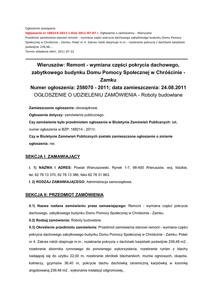 Ogłoszenie powiązane: Ogłoszenie nr 189214-2011 z dnia 2011-07-07 r. Ogłoszenie o zamówieniu - Wieruszów Przedmiot zamówienia stanowi remont - wymiana części pokrycia dachowego zabytkowego budynku Domu Pomocy Społecznej w Chróścinie - Zamku. Połać nr 4. Zakres robót obejmuje m.in.: rozebranie pokrycia z dachówki karpiówki podwójnie 239,48... Termin składania ofert: 2011-07-22 Wieruszów: Remont - wymiana części pokrycia dachowego, zabytkowego budynku Domu Pomocy Społecznej w Chróścinie Zamku Numer ogłoszenia: 258070 - 2011; data zamieszczenia: 24.08.2011 OGŁOSZENIE O UDZIELENIU ZAMÓWIENIA - Roboty budowlane Zamieszczanie ogłoszenia: obowiązkowe. Ogłoszenie dotyczy: zamówienia publicznego. Czy zamówienie było przedmiotem ogłoszenia w Biuletynie Zamówień Publicznych: tak, numer ogłoszenia w BZP: 189214 - 2011r. Czy w Biuletynie Zamówień Publicznych zostało zamieszczone ogłoszenie o zmianie ogłoszenia: nie. SEKCJA I: ZAMAWIAJĄCY I. 1) NAZWA I ADRES: Powiat Wieruszowski, Rynek 1-7, 98-400 Wieruszów, woj. łódzkie, tel. 62 78 13 370, 62 78 13 386, faks 62 78 31 963. I. 2) RODZAJ ZAMAWIAJĄCEGO: Administracja samorządowa. SEKCJA II: PRZEDMIOT ZAMÓWIENIA II.1) Nazwa nadana zamówieniu przez zamawiającego: Remont - wymiana części pokrycia dachowego, zabytkowego budynku Domu Pomocy Społecznej w Chróścinie - Zamku. II.2) Rodzaj zamówienia: Roboty budowlane. II.3) Określenie przedmiotu zamówienia: Przedmiot zamówienia stanowi remont - wymiana części pokrycia dachowego zabytkowego budynku Domu Pomocy Społecznej w Chróścinie - Zamku. Połać nr 4. Zakres robót obejmuje m.in.: rozebranie pokrycia z dachówki karpiówki podwójnie 239,48 m2 , rozebranie zbiornika rynnowego do ponownego wykorzystania, rozebranie rynien z blachy nadającej się do użytku 22,00 m, rozebranie obróbek blacharskich, murów ogniowych, okapów, kołnierzy, gzymsów 36,40 m, pokrycie dachu dachówką ceramiczną karpiówką w koronkę angobowaną 239,48 m2 , wykonanie instalacji odgromowej.. II.4) Wspólny Słownik Zamówień (CPV): 45.21.23.53-5, 45.26.19.00-3. SEKCJA III: PROCEDURA III.1) TRYB UDZIELENIA ZAMÓWIENIA: Przetarg nieograniczony III.2) INFORMACJE ADMINISTRACYJNE • Zamówienie dotyczy projektu/programu finansowanego ze środków Unii Europejskiej: nie SEKCJA IV: UDZIELENIE ZAMÓWIENIA IV.1) DATA UDZIELENIA ZAMÓWIENIA: 19.08.2011. IV.2) LICZBA OTRZYMANYCH OFERT: 1. IV.3) LICZBA ODRZUCONYCH OFERT: 0. IV.4) NAZWA I ADRES WYKONAWCY, KTÓREMU UDZIELONO ZAMÓWIENIA: • Marian Ćwięczek ANTIS Przedsiębiorstwo Budowlano - Konserwatorskie, Al. Generała Skrzyneckiego 17, 30-363 Kraków, kraj/woj. małopolskie. IV.5) Szacunkowa wartość zamówienia (bez VAT): 96374,98 PLN. IV.6) INFORMACJA O CENIE WYBRANEJ OFERTY ORAZ O OFERTACH Z NAJNIŻSZĄ I NAJWYŻSZĄ CENĄ • Cena wybranej oferty: 117815,51 • Oferta z najniższą ceną: 117815,51 / Oferta z najwyższą ceną: 117815,51 • Waluta: PLN.