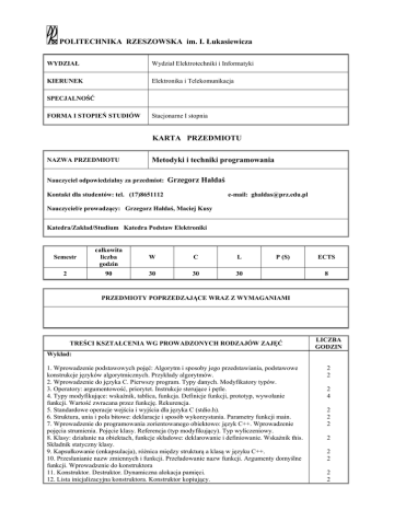 POLITECHNIKA RZESZOWSKA im. I. Łukasiewicza KARTA