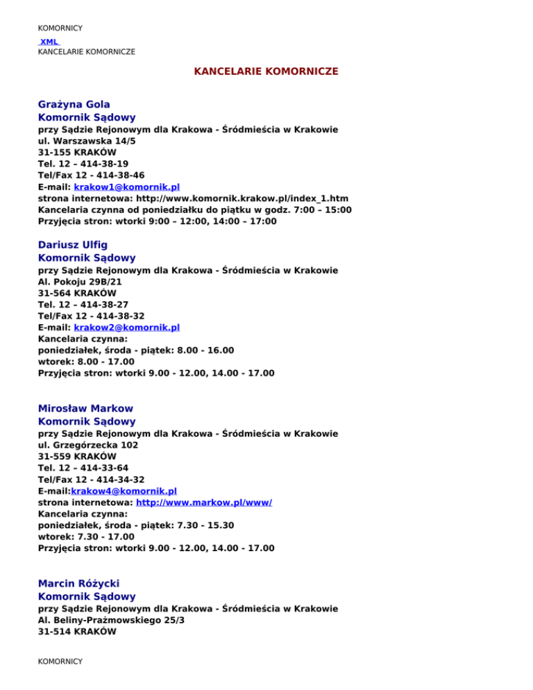 KOMORNICY XML KANCELARIE KOMORNICZE KANCELARIE KOMORNICZE Grażyna Gola Komornik Sądowy przy Sądzie Rejonowym dla Krakowa - Śródmieścia w Krakowie ul. Warszawska 14/5 31-155 KRAKÓW Tel. 12 – 414-38-19 Tel/Fax 12 - 414-38-46 E-mail: [email protected] strona internetowa: http://www.komornik.krakow.pl/index_1.htm Kancelaria czynna od poniedziałku do piątku w godz. 7:00 – 15:00 Przyjęcia stron: wtorki 9:00 – 12:00, 14:00 – 17:00 Dariusz Ulfig Komornik Sądowy przy Sądzie Rejonowym dla Krakowa - Śródmieścia w Krakowie Al. Pokoju 29B/21 31-564 KRAKÓW Tel. 12 – 414-38-27 Tel/Fax 12 - 414-38-32 E-mail: [email protected] Kancelaria czynna: poniedziałek, środa - piątek: 8.00 - 16.00 wtorek: 8.00 - 17.00 Przyjęcia stron: wtorki 9.00 - 12.00, 14.00 - 17.00 Mirosław Markow Komornik Sądowy przy Sądzie Rejonowym dla Krakowa - Śródmieścia w Krakowie ul. Grzegórzecka 102 31-559 KRAKÓW Tel. 12 – 414-33-64 Tel/Fax 12 - 414-34-32 E-mail:[email protected] strona internetowa: http://www.markow.pl/www/ Kancelaria czynna: poniedziałek, środa - piątek: 7.30 - 15.30 wtorek: 7.30 - 17.00 Przyjęcia stron: wtorki 9.00 - 12.00, 14.00 - 17.00 Marcin Różycki Komornik Sądowy przy Sądzie Rejonowym dla Krakowa - Śródmieścia w Krakowie Al. Beliny-Prażmowskiego 25/3 31-514 KRAKÓW KOMORNICY KOMORNICY Tel. 12 – 410-59-65 E-mail: [email protected] Kancelaria czynna: poniedziałek - piątek od 8:00 do 16:00, we wtorki do 17:00 Przyjęcia stron: wtorki od 14:00 do 17:00 oraz w piątki od 9:00 do 12:00 Szymon Herda Komornik Sądowy przy Sądzie Rejonowym dla Krakowa - Śródmieścia w Krakowie ul. Grzegórzecka 105/11 31-559 KRAKÓW Tel./fax 12 292 01 39 E-mail: [email protected] strona internetowa: http://www.komornikherda.pl/ Kancelaria czynna od poniedziałku do piątku w godz. od 8.00 do 16.00 Komornik przyjmuje strony we wtorek od 14.00 do 17.00 oraz w piątek od 9.00 do 12.00 Przemysław Rak Komornik Sądowy przy Sądzie Rejonowym dla Krakowa - Śródmieścia w Krakowie ul. Bandurskiego 8/2 31-515 Kraków tel./fax: 12 256-37-01 E-mail: [email protected] Strona internetowa: www.rak.komornik.pl Kancelaria czynna od poniedziałku do piątku w godz. 8:00 – 16:00 Przyjęcia stron: środy 9.00 – 12.00, 14.00 - 17.00 Jarosław Ziętara Komornik Sądowy przy Sądzie Rejonowym dla Krakowa - Śródmieścia w Krakowie ul. Kordylewskiego 11/223 31-542 Kraków tel./fax: 12 413 93 85 E-mail: [email protected] strona internetowa: http://www.komornik-zietara.pl Kancelaria czynna: poniedziałek, środa - piątek: 8.00 - 15.00, wtorek: 8.00 - 17.00 Przyjęcia stron: wtorki 11.00 - 17.00 Aleksandra Korczyk Komornik Sądowy przy Sądzie Rejonowym dla Krakowa - Śródmieścia w Krakowie ul. Kielecka 2/12; 31-526 Kraków tel. 692 324 292 e-mail: [email protected] Kancelaria Komornicza czynna od poniedziałku do piątku w godz. od 9.30 do 15.30 Komornik przyjmuje strony w środę w godz. od 9.30 do 17.00. Karolina Dziedzic KOMORNICY KOMORNICY Komornik Sądowy przy Sądzie Rejonowym dla Krakowa - Śródmieścia w Krakowie ul. Mogilska 40 lok. 17 31-546 Kraków tel. 12-307-19-99 tel. 793-711-311 fax. 12-413-86-83 e-mail: [email protected] [email protected] strona internetowa: www.komornikdziedzic.pl Kancelaria czynna: poniedziałek, środa - piątek w godz. od 9.00 do 14.00 wtorek w godz. od 12.00 do 18.00 Komornik przyjmuje strony we wtorki w godz. od 12.00 do 18.00. Podmiot publikujący Sąd Rejonowy dla Krakowa-Śródmieścia w Krakowie Wytworzył Karolina Włodarczyk-Całus - Oddział Administracyjny 2016-02-01 Publikujący Tomasz Błaut - Administrator 2016-02-01 11:36 Modyfikacja Tomasz Błaut - Administrator 2016-11-29 06:21 KOMORNICY