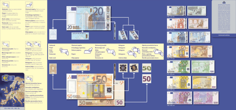 BCE ECB... Vodoznak: Objeví se neostrý obrázek a hodnota bankovky. Vízjel: Árnyalatos képet és a bankjegy értékét jelző számot mutatja. Znak wodny: widać prześwituja˛cy obraz i oznaczenie nominału. Vodoznak: objaví sa matný obraz a hodnota bankovky. BCE ECB BCE ECB Vodni znak: vidni sta temnejša podoba in prosojna številka vrednosti. Vlastnosti papíru: Papír je na omak pevný, tuhý a na některých místech silnější. A bankjegy tapintása: A bankjegypapír ropogós, kemény, néhol vastagabb tapintású. 120 x 62 mm Faktura papieru: papier banknotu jest sztywny i szeleszczący, a miejscami grubszy. BCE ECB BCE ECB BCE ECB BCE ECB Papier: papier bankovky je na dotyk pevný, pružný a v niektorých častiach hrubší. 127 x 67 mm Otip papirja: papir je na otip čvrst in gladek ter na nekaterih mestih hrapav. Ochranný proužek: Objeví se tmavý proužek. Hologram: Objeví se hodnota a symbol „€“ nebo okno či portál. Biztonsági szál: Sötét vonalként látható. Hologram: A bankjegy értéke, egy „€” vagy egy ablak képe jelenik meg rajta. Nitka zabezpieczająca: widać ciemna˛ linie˛. Ochranný prúžok: objaví sa tmavá čiara. BCE ECB BCE ECB Varnostna nit: vidna je kot temna črta. Hologram: widać oznaczenie nominału i znak „€“ lub okno. Hologram: objaví sa hodnota bankovky a znak „€“ alebo okno. BCE ECB BCE ECB www.euro.ecb.eu Vodoznak Vlastnosti papíru Ochranný proužek Hologram Opticky proměnlivá barva Vízjel A bankjegy tapintása Biztonsági szál Hologram Színváltó értékjelzés Znak wodny Faktura papieru Hologram Nominał zmieniaja˛cy kolor Vodoznak Papier Hologram Vodni znak Otip papirja Nitka zabezpieczająca Ochranný prúžok Varnostna nit Číslo s opticky premenlivou farbou Številka spremenljive barve BCE ECB... Srebrna folija 133 x 72 mm 140 x 77 mm BCE ECB Srebrna folija: prikazuje številko vrednosti in znak „€“ ali arhitekturni motiv. 147 x 82 mm BCE ECB BCE ECB BCE ECB BCE ECB BCE ECB BCE ECB NAŠE MĚNA A MI PéNZÜNK NASZ PIENIA˛DZ NAŠA MENA NAŠ DENAR Opticky proměnlivá barva: Hodnotové číslo mění barvu. Színváltó értékjelzés: Az értékjelzés színe megváltozik. Nominał zmieniaja˛cy kolor: zmienia się kolor cyfr. BCE ECB BCE ECB BCE ECB BCE ECB BCE ECB BCE ECB 153 x 82 mm Číslo s opticky premenlivou farbou: číslo nominálnej hodnoty bankovky mení farbu. Številka spremenljive barve: številka vrednosti spreminja barvo. 160 x 82 mm CS HU PL SK SL Belgique/België Deutschland France Malta Кύπρος/Kιbrιs Italia Österreich Éire/Ireland Eesti Portugal Eda Luxembourg Slovenija España Nederland Slovensko Suomi/Finland