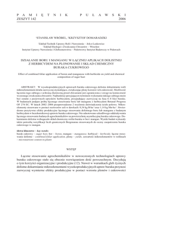 P A M I ZESZYT 142 1 Ę T N I K P U Ł A W S K I 2006 STANISŁAW WRÓBEL, 2KRZYSZTOF DOMARADZKI 1 Zakład Technik Uprawy Roli i Nawożenia – Jelcz-Laskowice 2 Zakład Ekologii i Zwalczania Chwastów – Wrocław Instytut Uprawy Nawożenia i Gleboznawstwa – Państwowy Instytut Badawczy w Puławach DZIAŁANIE BORU I MANGANU W ŁĄCZNEJ APLIKACJI DOLISTNEJ Z HERBICYDEM NA PLONOWANIE I SKŁAD CHEMICZNY BURAKA CUKROWEGO Effect of combined foliar application of boron and manganese with herbicide on yield and chemical composition of sugar beet ABSTRAKT: W wysokoprodukcyjnych uprawach buraka cukrowego dolistne dokarmianie rośli mikroelementami działa zazwyczaj stymulująco, zwiększając plony korzeni i ich cukrowość. Możliwość łączenia tego zabiegu z ochroną chemiczną przed chwastami jest ograniczona z uwagi na konieczność wczesnego zwalczania chwastów. Najbardziej sprzyjającym terminem wykonania takiego zabiegu może być ostatni z posiewnych oprysków herbicydem, przypadający zazwyczaj na fazę 6–8 liści buraka. W badaniach podjęto próbę łącznego stosowania boru lub manganu z herbicydem Betanal Progress OF 274 EC. W latach 2002–2004 przeprowadzono 2 trzyletnie doświadczenia ścisłe polowe. Mikroelementy stosowano w postaci roztworów soli w dawkach: 0,34 kg B·ha-1 oraz 1,14 kg Mn·ha-1. Stwierdzono pozytywne efekty produkcyjne łącznego stosowania dolistnego boru lub manganu z badanym herbicydem w bezobornikowej uprawie buraka cukrowego. Nie odnotowano szkodliwego oddziaływania łącznego stosowania badanych agrochemikaliów na powierzchnię asymilacyjną buraka cukrowego. Dokarmianie dolistne wzbogacało skład chemiczny roślin buraka w bor i mangan. Wyniki badań wykazały także potrzebę weryfikacji liczb granicznych Bergmanna stosowanych do oceny zaopatrzenia buraka cukrowego w mangan. słowa kluczowe – key words: burak cukrowy – sugar beet, bor – boron, mangan – manganese, herbicyd – herbicide, łączne stosowanie dolistne – combined foliar application, plony – yields, zawartość mikroelementów w roślinach – micronutrient content in plants WSTĘP Łączne stosowanie agrochemikaliów w nowoczesnych technologiach uprawy buraka cukrowego stało się obecnie rozwiązaniem dość powszechnym. Decydują o tym korzyści organizacyjne i produkcyjne (12). Nawet w warunkach gleb żyznych dolistne dokarmianie mikroelementami wysokoprodukcyjnych upraw buraka przynosi zazwyczaj wymierne efekty produkcyjne w postaci wzrostu plonów i cukrowości 586 Zakład Technik Uprawy Roli IUNG – Jelcz-Laskowice [2] korzeni (2, 3, 10, 14, 18). Przyczyną jest zbieżność okresowego deficytu składników z fazami największego zapotrzebowania roślin. Spośród głównych mikroelementów najważniejszą rolę odgrywają bor i mangan, które w warunkach uregulowanego odczynu, wymaganego w uprawie buraka, łatwo ulegają immobilizacji, a ich dostępność dla roślin wyraźnie maleje (6, 17). Łączenie agrochemikaliów nie poprzedzone odpowiednimi badaniami może być jednak przyczyną nieskuteczności lub nawet szkodliwości zabiegu (12). Możliwość i skuteczność łącznego stosowania boru i manganu z herbicydami nie zostały dotychczas w Polsce rozpoznane. Celem niniejszej pracy jest określenie wpływu łącznego stosowania tych mikroelementów z herbicydem Betanal Progress OF 274 EC na rozwój, plonowanie i skład chemiczny buraka cukrowego. MATERIAŁ I METODY W latach 2002–2004 przeprowadzono dwa trzyletnie ścisłe doświadczenia polowe, metodą losowanych bloków w czterech powtórzeniach, w dwóch punktach doświadczalnych zlokalizowanych w obrębie pól produkcyjnych na czarnych ziemiach wrocławskich. Gleby te zaliczane są do pszennego dobrego kompleksu przydatności rolniczej i klasy bonitacyjnej II i IIIa. Gleby w obu punktach doświadczalnych były zbliżone pod względem składu granulometrycznego (gliny średnie pylaste), zasobności w składniki pokarmowe (wysoka zawartość makroelementów – P, K, Mg, i średnia mikroelementów – B, Cu, Mn, Zn), oraz odczynu (lekko kwaśny i obojętny); (23). Analizy chemiczne gleby wykonano metodami stosowanymi w stacjach chemicznorolniczych (21, 22). Mimo podobieństwa gleb, warunki wegetacji roślin w punktach doświadczalnych nie były identyczne ze względu na różnice poziomu kultury gleby, zaopatrzenia w wodę w okresach krytycznych, a także w występowaniu konkurencyjnych gatunków chwastów (szarłat szorstki, komosa). Czynniki te miały wpływ na poziom plonowania buraka. Schemat doświadczeń: 1. Obiekt kontrolny – pełna ochrona chemiczna (4-krotne opryskiwanie herbicydem Betanal Progress OF 274 EC); 2. Pełna ochrona chemiczna jw. w tym czwarte opryskiwanie herbicydem łącznie z borem – 0,34 kg B·ha-1; 3. 3-krotne opryskiwanie herbicydem, w terminie czwartego zabiegu – opryskiwanie borem w dawce jw.; 4. Pełna ochrona chemiczna jw. w tym czwarte opryskiwanie herbicydem łącznie z manganem – 1,14 kg Mn·ha-1; 5. 3-krotne opryskiwanie herbicydem, w terminie czwartego zabiegu – opryskiwanie manganem w dawce jw. W doświadczeniach uprawiano wyłącznie odmiany buraka cukrowego o dużym potencjale plonotwórczym (Polko, Khazar, Nabucco), stosując zasady racjonalnej agrotechniki uwzględniającej warunki glebowo-klimatyczne, stanowisko, przedplon, rodzaj i zasobność gleby itd. Nawożenie podstawowe ustalano corocznie posługując [3] Działanie boru i manganu w łącznej aplikacji dolistnej z herbicydem... – S. Wróbel i in. 587 się komputerowym programem doradztwa nawozowego NAW-3 (8). Nawożenia obornikiem nie stosowano. Pierwszy zabieg herbicydowy wykonywano w fazie liścieni chwastów, a następne w odstępach 7–10 dni, w momencie pojawiania się kiełkujących chwastów (faza liścieni). Czwarty zabieg, w którym stosowano mikroelementy, przypadał w fazie 6–8 liści buraka. Bor stosowano w formie H3BO3, a mangan jako MnSO4·5H2O. Powierzchnia poletek wynosiła