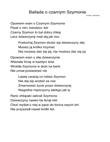 Ballada o czarnym Szymonie sł./muz. nieznane Opowiem wam o Czarnym Szymonie Pisali o nim: bandzior, łotr Czarny Szymon to był dobry chłop Lecz dziewczynę miał złą jak noc. Posłuchaj Szymon strzeż się dziewczyny złej Musisz ją krótko trzymać Nie możesz dać się jej, nie możesz dać się jej Opowiem wam o złej dziewczynie Widziała forsę w każdym śnie Wrobiła Szymona w skok na bank Nie umiał powiedzieć nie Lepiej uważaj co robisz Szymon Nie daj się wodzić za nos Zmarnować życie przez dziewczynę Niegodne mężczyzny takiego jak ty Rano chłopaki zabrali Szymona Dziewczyny nawet nie tknął nikt Choć myślał o niej w pace do końca swych dni Nie przyszedł nawet krótki list.