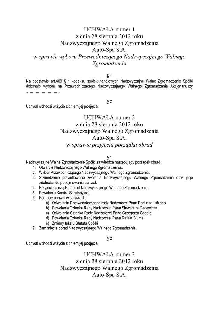 UCHWAŁA numer 1 z dnia 28 sierpnia 2012 roku Nadzwyczajnego Walnego Zgromadzenia Auto-Spa S.A. w sprawie wyboru Przewodniczącego Nadzwyczajnego Walnego Zgromadzenia §1 Na podstawie art.409 § 1 kodeksu spółek handlowych Nadzwyczajne Walne Zgromadzenie Spółki dokonało wyboru na Przewodniczącego Nadzwyczajnego Walnego Zgromadzenia Akcjonariuszy ………………………. §2 Uchwał wchodzi w życie z dniem jej podjęcia. UCHWAŁA numer 2 z dnia 28 sierpnia 2012 roku Nadzwyczajnego Walnego Zgromadzenia Auto-Spa S.A. w sprawie przyjęcia porządku obrad §1 Nadzwyczajne Walne Zgromadzenie Spółki zatwierdza następujący porządek obrad. 1. Otwarcie Nadzwyczajnego Walnego Zgromadzenia.. 2. Wybór Przewodniczącego Nadzwyczajnego Walnego Zgromadzenia. 3. Stwierdzenie prawidłowości zwołania Nadzwyczajnego Walnego Zgromadzenia oraz jego zdolności do podejmowania uchwał. 4. Przyjęcie porządku obrad Nadzwyczajnego Walnego Zgromadzenia. 5. Powołanie Komisji Skrutacyjnej. 6. Podjęcie uchwał w sprawach: a) Odwołania Przewodniczącego rady Nadzorczej Pana Dariusza Ilskiego. b) Powołania Członka Rady Nadzorczej Pana Sławomira Decewicza. c) Odwołania Członka Rady Nadzorczej Pana Grzegorza Czaplę. d) Powołania Członka Rady Nadzorczej Pana Rafała Bluma. e) Zmiany tekstu Statutu Spółki 7. Zamknięcie obrad Nadzwyczajnego Walnego Zgromadzenia. §2 Uchwał wchodzi w życie z dniem jej podjęcia. UCHWAŁA numer 3 z dnia 28 sierpnia 2012 roku Nadzwyczajnego Walnego Zgromadzenia Auto-Spa S.A. w sprawie uchylenia tajności głosowania w sprawie wyboru Komisji Skrutacyjnej §1 Działając na podstawie art. 420 § 3 kodeksu spółek handlowych Nadzwyczajne Walne Zgromadzenie uchyla tajność głosowania nad wyborem Komisji Skrutacyjnej. §2 Uchwała wchodzi w życie z dniem podjęcia. UCHWAŁA numer 4 z dnia 28 sierpnia 2012 roku Nadzwyczajnego Walnego Zgromadzenia Auto-Spa S.A. w sprawie powołania komisji skrutacyjnej §1 Nadzwyczajne Walne Zgromadzenie Spółki wybiera Komisję Skrutacyjną w składzie: 1. ………………………….. 2. ………………………….. 3. ………………………….. §2 Uchwała wchodzi w życie z dniem jej podjęcia. UCHWAŁA numer 5 z dnia 28 sierpnia 2012 roku Nadzwyczajnego Walnego Zgromadzenia Auto-Spa S.A. w sprawie odwołania Przewodniczącego Rady Nadzorczej §1 Nadzwyczajne Walne Zgromadzenie postanawia odwołać z dniem 28 sierpnia roku ze stanowiska Przewodniczącego Rady Nadzorczej Pana Dariusza Ilskiego. §2 Uchwała wchodzi w życie z dniem podjęcia. UCHWAŁA numer 6 z dnia 28 sierpnia 2012 roku Nadzwyczajnego Walnego Zgromadzenia Auto-Spa S.A. w sprawie powołania na Członka Rady Nadzorczej §1 Nadzwyczajne Walne Zgromadzenie postanawia powołać z dniem 28 sierpnia roku na stanowisko Członka Rady Nadzorczej Pana Sławomira Decewicza. §2 Uchwał wchodzi w życie z dniem podjęcia. UCHWAŁA numer 7 z dnia 28 sierpnia 2012 roku Nadzwyczajnego Walnego Zgromadzenia Auto-Spa S.A. w sprawie odwołania Członka Rady Nadzorczej §1 Nadzwyczajne Walne Zgromadzenie postanawia odwołać z dniem 28 sierpnia ze stanowiska Członka Rady Nadzorczej Pana Grzegorza Czaplę. Uchwała wchodzi w życie z dniem podjęcia. §2 UCHWAŁA numer 8 z dnia 28 sierpnia 2012 roku Nadzwyczajnego Walnego Zgromadzenia Auto-Spa S.A. w sprawie powołania Członka Rady Nadzorczej §1 Nadzwyczajne Walne Zgromadzenie postanawia powołać z dniem 28 sierpnia na stanowisko Członka Rady Nadzorczej Pana Rafała Bluma. §2 Uchwała wchodzi w życie z dniem podjęcia. UCHWAŁA numer 9 z dnia 28 sierpnia 2012 roku Nadzwyczajnego Walnego Zgromadzenia Auto-Spa S.A. w sprawie zmiany Artykułu 13, ust. 4 Statutu Spółki. §1 Nadzwyczajne Walne Zgromadzenie Spółki postanawia, że dotychczasowy Artykuł 13, ust. 4 Statutu Spółki, otrzymuje nowe, następujące brzmienie: „Artykuł 13, ust. 4 W przypadku śmierci lub rezygnacji członka rady Nadzorczej powołanego przez Walne Zgromadzenie, pozostali członkowie Rady Nadzorczej mogą w drodze podjęcia jednomyślnej uchwały powołać nowego Członka Rady Nadzorczej, który będzie pełnił swoją funkcję do czasu wyboru przez Walne Zgromadzenie nowego członka rady Nadzorczej w miejsce dokooptowanego.” §2 Uchwała wchodzi w życie z dniem podjęcia. UCHWAŁA numer 10 z dnia 28 sierpnia 2012 roku Nadzwyczajnego Walnego Zgromadzenia Auto-Spa S.A. w sprawie dodania Artykułu 5b i zmiany Statutu Spółki. §1 Nadzwyczajne Walne Zgromadzenie Spółki postanawia, że po Artykule 5a Statutu Spółki, dodaje się Artykuł 5b o następującym brzmieniu: „Artykuł 5b Zarząd Auto-Spa S.A. jest upoważniony do dokonania jednego lub kilku podwyższeń kapitału zakładowego Spółki o kwotę nie większą niż 1.900.000,00 zł (słownie: jeden milion dziewięćset tysięcy złotych) poprzez emisję nie więcej niż 3.800.000 (słownie: trzy miliony osiemset tysięcy) akcji zwykłych na okaziciela (dalej: „Kapitał Docelowy”), na następujących zasadach: 1) upoważnienie określone w niniejszym artykule 5b, zostało udzielone dla Zarządu na okres do dnia 31 lipca 2015 r.; 2) Akcje wydawane w ramach Kapitału Docelowego mogą być obejmowane w zamian za wkłady pieniężne lub niepieniężne. Uchwała Zarządu w sprawie wydania Akcji za wkłady niepieniężne wymaga zgody Rady Nadzorczej. 3) cenę emisyjną Akcji wydawanych w ramach Kapitału Docelowego ustali Zarząd w uchwale o podwyższeniu Kapitału Docelowego w ramach niniejszego upoważnienia, z zastrzeżeniem że cena emisyjna Akcji nie może być niższa niż 7,5 zł (słownie: siedem złotych i pięćdziesiąt groszy) za jedną Akcję. Uchwała Zarządu w tej sprawie wymaga zgody Rady Nadzorczej; 4) Uchwała Zarządu podjęta w ramach upoważnienia udzielonego w niniejszym artykule zastępuje uchwalę Walnego Zgromadzenia w sprawie podwyższenia kapitału zakładowego; 5) Zarząd jest upoważniony do wyłączenia prawa poboru dotychczasowych akcjonari