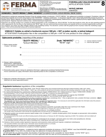 DLG AgroFood Sp. z o.o. ul. Obornicka 229 , 60-650 Poznań POLAND tel. +48 61/ 639 01 17/18, fax 61/ 858 48 48 e-mail: [email protected] www.targiferma.com.pl FORMULARZ ZGŁOSZENIOWY APPLICATION FORM Bank: Pekao S.A. I O/POZNAŃ wystawcy krajowi: 21 1240 1747 1111 0010 0700 2525 foregin exhibitors: PL 41 1240 1747 1978 0010 0878 8332 SWIFT: PKOPPLPW WYRÓŻNIENIA AWARDS 8 KONKURS - “ZŁOTY MEDAL”, ZNAK "NOWOŚĆ" / COMPETITION - GOLD MEDAL “NEW” SIGN Organizatorzy serdecznie zapraszają Państwa Firmę do wzięcia udziału w konkursie o “ZŁOTY MEDAL” dla najlepszych produktów na targach. Produktom, które po raz pierwszy pojawiły się na rynku przyznajemy Znak "NOWOŚĆ". Jesteśmy przekonani, że otrzymane nagrody i wyróżnienia będą doskonałą okazją do promocji Państwa firmy. Nasze nagrody są często chętnie wykorzystywane w działalności marketingowej. Elektroniczne nośniki z graficzną formą nagród ułatwią Państwu ich wykorzystanie. Nagrody wręczone zostaną wraz z okolicznościowymi dyplomami. Organizers are warmly inviting Your company to taking participation in the competition for “GOLD MEDAL” for the best products at fair. We are also granting products which appeared for the first time on the market by the “NEW” sign. We are convinced that received prizes and awards will be an excellent opportunity to promote Your company. Our prizes are often willingly utilized in the marketing activity. The electronic carriers with the graphical form of prizes make the marketing usage easier. Prizes will be presented along with occasional diplomas. UWAGA!!! Opłata za udział w konkursie wynosi 500 pln + VAT za jeden wyrób, w jednej kategorii ATTENTION!!! Participation fee in the competition is 500 pln + VAT for one product in one category Zgłoszenie produktu / reporting of the product "ZŁOTY MEDAL" "GOLD MEDAL" Znak "NOWOŚĆ" "NEW" sign “x” - zaznacz właściwy kwadrat “x” - mark the right square 1. Pełna nazwa wyrobu Product - full name 1) 2) 2. Nazwa i adres producenta, dystrybutora / zgłaszającego Name and address of producer distributor / reporter 3. Personalia osoby upoważnionej do udzielania informacji o zgłoszonym produkcie Komisji Konkursowej. Person authorized to supply information about reported product to the Competitive Commission. 4. Załączone materiały informacyjne o produkcie Attached info about appointed product Regulamin konkursu/ regulations of the competition 1. Przedmiotem przyznawania nagród "Złoty Medal” / Znak “Nowość” będą wyroby oraz innowacje techniczne dotyczące hodowli produkcji, bydła, świń i drobiu. The object of granting prizes “GOLD MEDAL” / “NEW” sign, will be products and technical innovations referring to the breeding, production of cattle, pigs and poultry. 2. Do nagród pretendują tylko firmy uczestniczące w Międzynarodowych Targach "FERMA BYDŁA" 2017 i Międzynarodowych Targach “FERMA ŚWIŃ I DROBIU” 2017 Only participating in "CATTLE FARM” 2017 and “PIGS & POULTRY FARM” 2017 companies are pretending to prizes . 3. Firma biorąca udział w konkursie może zgłosić tylko jeden produkt do nagrody "ZŁOTY MEDAL" oraz jeden produkt do nagrody Znak “NOWOŚĆ" Participant may report in each category one product to the award “GOLD MEDAL” and one product to the “NEW” sign only. 4. Zgłoszenie produktów oraz innowacji odbywa się tylko na podstawie wypełnionego i przesłanego druku *. Wraz ze zgłoszeniem należy przesłać informacje o produkcie - zdjęcie (format jpg, png) opis produktu (format .doc do 720 znaków bez spacji) The application of products and innovations is based on filled in and delivered registration form *. It is necessary to send with the application the information about the products photo (format .jpg, .png) product description (format .doc until 720 signs without space) 5. Zgłoszone wyroby oraz innowacje będą oceniane przez Komisję Konkursową. Reported products and innovations will be evaluated by the Awarding Commission. 6. Komisja przyznająca nagrody będzie obradowała na zamkniętym posiedzeniu dwukrotnie: na początku lutego 2017 oraz w pierwszym dniu Targów. The Awarding Commission will have a closed session twice: at the beginning of February 2017 and in first day of the fair. 7. Wyniki pracy Komisji oraz lista przyznanych przez nią nagród są ostateczne i nie podlegają weryfikacji. The results of the Commission's work and the list of granted prizes are final and are not undergoing any verification. 8. Ogłoszenie wyników oraz uroczyste wręczenie nagród nastąpi w dniu 18 lutego 2017 r. (sobota), początek godzina 18.00. Szczegóły na zaproszeniach, które prześlemy w terminie późniejszym. The announcement of the results and official handing awards will take place on February 18, 2017 (Saturday), beginning at 18:00. The invitations with more details will be send later. 9. W uroczystości wręczenia nagród wezmą udział szefowie firm wystawiających się na targach, zaproszeni goście oraz media: prasa specjalistyczna, telewizja. In the awarding ceremony will take part: heads of exhibiting firms, invited guests and media: press, television. . 10. Wystawcy, których produkty zostały nagrodzone mają prawo wykorzystywania znaków graficznych nagrody w działalności marketingowej. The rewarded exhibitors have right to place information about rewarded products in all media. 11. Przesłanie zgłoszenia jest równoznaczne z akceptacją niniejszego regulaminu. Sending the application is tantamount to acceptance of exhibiton regulations. * UWAGA! Uprzejmie informujemy, że ostateczny termin zgłaszania produktów do konkursu o “ZŁOTY MEDAL” oraz Znak NOWOŚĆ upływa w dniu 31 grudnia 2016 r. Firmy, które nie prześlą do tego dnia zgłoszenia nie będą pretendowały do nagród. * ATTNETION! We are informing politely, that deadline of reporting products to the competition for “GOLD MEDAL” and the "NEW"