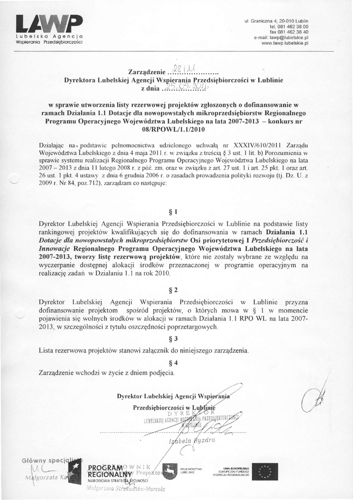 1IWP ul. Graniczna4, 20-010Lublin tet.081 462 38 00 fax 081 .16238 40 e-mail: [email protected] www.lawp.lubelskie.pl l-ubelsko Agencjo wsFieronio Przedsiębiorczości w sprawieutworzeniaIistyrezerwowejprojektówzg|oszonych o dofinansowanie w ramachDzia|anial.l Dotacjedla nowopowstaĘch mikroprzedsiębiorstw Regiona|nego Programu operacyjnego Województwa Lube|skiegona |^t^2007-2ol3 - konkurs nr oE/RPOWL/l.l/2010 pelnomocnictwa Dzialając na-podsta\Ą'ie udziclonegouchwaląnr XXxIv/6|0/f0|| Zarządu Wojerł'ódfwa Lubclskiego z dnia 4 maja20| l r' w zrviązku z trcścią$ 3 ust. l lit. b) Porozumienia w sprawie systemu realizacji Regionalnego Programu operac1jnego Wojervódalva Lube|skiego na lata fo07 _20|3 zdnia l | |utego2008 r. zpói. zm. oraz w zlt'iązkuzart. f7 uŚ' | |alt.25 pkt. l oraz ań. 26 ust. I pkt. 4 ustawl z dnia 6 grudnia 2006 r. o zasadachprowadzenia polityki rozwoju {tj. Dz. U. z 2009 r. Nr 84. poz.1|2\. zarządzzmco następuje: sr DyrektorLube|skiejAgencji WspieraniaPrzedsiębiorczości w Lublinie na podstawielisty rankingowejprojektów kwalifikującychsię do dofinansowaniaw ramach Działania l.l Dotacje dla nowopowstaĘchmikroprzedsiębiorstwOsi priorytetowej I Przedsiębiorczośći Innowacje Regionalnego Programu operacyjnego Województwa Lubelskiego na lata 2007-fo|3, tworzy |istę rezerwowąprojektów, które nie zostaływybraneze względu na wyczerpanie dostępnejalokacji środków przeznaczonejw programie operacyjnym na realizaclezadańw Działaniul.l narok2010. s2 Dyrektor Lube|skiej Agencji Wspierania Przedsiębiorczościw Lublinie przyzna dofinansowanieprojektom spośródprojektów, o których mowa w $ l w momencie pojawieniasię wolnych środkóww alokacjiw ramachDziałanial.l RPo WL na |ata2001poprzetargowych' 20|3, w szczególności z tytufuoszczędności s3 Lista rezerwowa projektów stanowi załącznikdo niniejszego zarządzenia. s4 Zarządzenie wchodzi w życie z dniem podjęcia. DyrektorLubelskiejAgencjiW Przedsirbiorgll;Sc*i ; . ' B i l ' s i !łt C l i\Cll e l a a zdr Li. (-:, Główny spe \t/ t_ ;v1\fP.orzata r\ilr lĘl"****ffi! /-1J /łt \ .,u