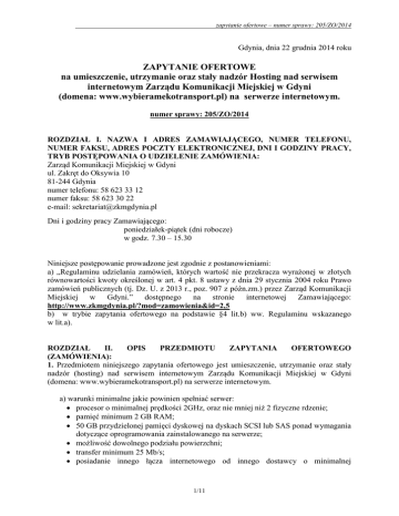 zapytanie ofertowe – numer sprawy: 205/ZO/2014 Gdynia, dnia 22 grudnia 2014 roku ZAPYTANIE OFERTOWE na umieszczenie, utrzymanie oraz stały nadzór Hosting nad serwisem internetowym Zarządu Komunikacji Miejskiej w Gdyni (domena: www.wybieramekotransport.pl) na serwerze internetowym. numer sprawy: 205/ZO/2014 ROZDZIAŁ I. NAZWA I ADRES ZAMAWIAJĄCEGO, NUMER TELEFONU, NUMER FAKSU, ADRES POCZTY ELEKTRONICZNEJ, DNI I GODZINY PRACY, TRYB POSTĘPOWANIA O UDZIELENIE ZAMÓWIENIA: Zarząd Komunikacji Miejskiej w Gdyni ul. Zakręt do Oksywia 10 81-244 Gdynia numer telefonu: 58 623 33 12 numer faksu: 58 623 30 22 e-mail: [email protected] Dni i godziny pracy Zamawiającego: poniedziałek-piątek (dni robocze) w godz. 7.30 – 15.30 Niniejsze postępowanie prowadzone jest zgodnie z postanowieniami: a) „Regulaminu udzielania zamówień, których wartość nie przekracza wyrażonej w złotych równowartości kwoty określonej w art. 4 pkt. 8 ustawy z dnia 29 stycznia 2004 roku Prawo zamówień publicznych (tj. Dz. U. z 2013 r., poz. 907 z późn.zm.) przez Zarząd Komunikacji Miejskiej w Gdyni.” dostępnego na stronie internetowej Zamawiającego: http://www.zkmgdynia.pl/?mod=zamowienia&id=2,5 b) w trybie zapytania ofertowego na podstawie §4 lit.b) ww. Regulaminu wskazanego w lit.a). ROZDZIAŁ II. OPIS PRZEDMIOTU ZAPYTANIA OFERTOWEGO (ZAMÓWIENIA): 1. Przedmiotem niniejszego zapytania ofertowego jest umieszczenie, utrzymanie oraz stały nadzór (hosting) nad serwisem internetowym Zarządu Komunikacji Miejskiej w Gdyni (domena: www.wybieramekotransport.pl) na serwerze internetowym. a) warunki minimalne jakie powinien spełniać serwer: procesor o minimalnej prędkości 2GHz, oraz nie mniej niż 2 fizyczne rdzenie; pamięć minimum 2 GB RAM; 50 GB przydzielonej pamięci dyskowej na dyskach SCSI lub SAS ponad wymagania dotyczące oprogramowania zainstalowanego na serwerze; możliwość dowolnego podziału powierzchni; transfer minimum 25 Mb/s; posiadanie innego łącza internetowego od innego dostawcy o minimalnej 1/11 zapytanie ofertowe – numer sprawy: 205/ZO/2014 przepustowości 2 Mb/s, które będzie uruchamiane na wypadek awarii łącza podstawowego miesięczny limit ruchu z/do serwisu – 600 GB; własny unikalny adres IP; zasilanie awaryjne min. 4 godziny; Zamawiający dopuszcza serwer wirtualny spełniający warunki opisane w lit.a); b) oprogramowanie i specyfikacja serwera: system operacyjny Linux; PHP 5.3.x; PostgreSQL 9.0 serwer MySQL 5.1.x; dostęp SSH do konta administratora; obsługa szyfrowanych połączeń (SSL); Image Magic; CGI; Perl 5.8.x; dostęp do wybranych stron przy użyciu haseł; statystyki użytkowania serwisu www; konta na serwerze FTP – bez ograniczeń liczby kont; dostęp do logów serwera WWW i FTP; panel administracyjny - istnieje już gotowy panel administracyjny do zarządzania serwisem www.wybieramekotransport.pl. Funkcjonalność panelu polega na możliwości wgrywania plików, zamieszczania i edycji aktualności itd. Zadaniem Wykonawcy będzie umieścić panel, który został wcześniej utworzony na serwerze, zachowując jego funkcjonalność, Zamawiający nie musi mieć pełnego dostępu do serwera na poziomie Administratora. 2. WYKONAWCA będzie zobowiązany do: a) Utrzymywania gotowości przyjęcia zgłoszenia od Zamawiającego dotyczącego awarii serwisu: telefonicznie: 24 h na dobę przez 7 dni w tygodniu elektronicznie: poniedziałek – piątek od 8.00 do 16.00 b) Zapewnienia pełnego dostępu do serwisu (modyfikacja, kopiowanie, kasowanie, tworzenie nowych plików i katalogów wraz z udostępnieniem wszelkich niezbędnych do tego celu loginów i haseł). c) Zapewnienia dostępu do serwisu oraz wszelkiej pomocy w zakresie prawidłowego funkcjonowania serwisu podmiotom wskazanym przez Zamawiającego w zakresie ustalonym przez Zamawiającego. UWAGA: Zamawiający nie dopuszcza składania ofert częściowych. 3. Zamawiający nie dopuszcza składania ofert częściowych. Zamawiający nie dopuszcza składania ofert wariantowych. Wykonawca może złożyć tylko jedną ofertę. Zamawiający nie przewiduje udzielenia zamówień uzupełniających. Wykonawca może powierzyć wykonanie przedmiotu zamówienia podwykonawcom. 2/11 zapytanie ofertowe – numer sprawy: 205/ZO/2014 4. Zamawiający wymaga, aby przedmiot zamówienia był wykonany zgodnie z postanowieniami zawartymi we WZORZE UMOWY (stanowiącym załącznik numer 2 do niniejszego zapytania ofertowego). ROZDZIAŁ III. WARUNKI PŁATNOŚCI: wskazane we WZORZE UMOWY stanowiącym załącznik numer 2 do niniejszego zapytania ofertowego. ROZDZIAŁ IV. TERMIN REALIZACJI PRZEDMIOTU OFERTOWEGO: od dnia 1 stycznia 2015 roku do dnia 31 grudnia 2015 roku. ZAPYTANIA ROZDZIAŁ V. FORMA ZŁOŻENIA OFERTY: 1. Ofertę (na FORMULARZU OFERTY stanowiącym załącznik numer 1 do zapytania ofertowego) wraz z załącznikami należy złożyć w formie pisemnej (osobiście, listownie) na adres: Zarząd Komunikacji Miejskiej w Gdyni ul. Zakręt do Oksywia 10 81-244 Gdynia pok. nr 8 (Sekretariat) 2. Ofertę należy sporządzić w języku polskim, czytelnie. 3. Oferta musi być podpisana przez Wykonawcę (osobę uprawnioną do reprezentowania Wykonawcy zgodnie z dokumentami potwierdzającymi dopuszczenie do obrotu prawnego) lub jego upełnomocnionego przedstawiciela (pełnomocnictwo winno zostać złożone wraz z ofertą – w formie oryginału, kopii poświadczonej za zgodność z oryginałem przez Wykonawcę lub kopii poświadczonej notarialnie). 4. Ofertę wraz ze wszystkimi załącznikami należy umieścić w zamkniętej kopercie opatrzonej następującymi danymi: ZAPYTANIE OFERTOWE – numer sprawy: 205/ZO/2014 Oferta – HOSTING STRONY WWW.WYBIERAMEKOTRANSPORT.PL Nazwa i siedziba Wykonawcy Nie otwierać przed: 30 GRUDNIA 2014 ROKU GODZ. 09.30 0 W PRZYPADKU UMIESZCZENIA OFERTY W KOPERCIE NIE ZAWIERAJĄCEJ WYŻEJ WYMIENIONYCH OZNACZEŃ – ZAMAWIAJACY NIE BĘDZIE PONOSIŁ ŻADNEJ ODPOWIEDZIALNOŚCI Z TYTUŁU OTWARCIA KOPERTY PRZE