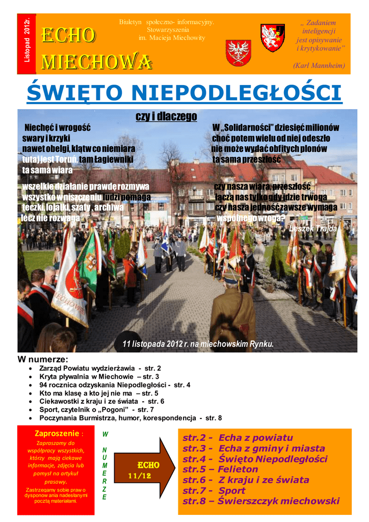 Listopad 2012r. Biuletyn społeczno- informacyjny. Stowarzyszenia im. Macieja Miechowity „ Zadaniem inteligencji jest opisywanie i krytykowanie” Echo Miechowa (Karl Mannheim) ŚWIĘTO NIEPODLEGŁOŚCI czy i dlaczego Niechęć i wrogość swary i krzyki nawet obelgi, klątw co niemiara tutaj jest Toruń, tam Łagiewniki ta sama wiara W „Solidarności” dziesięć milionów choć potem wielu od niej odeszło nie może wydać obfitych plonów ta sama przeszłość wszelkie działanie prawdę rozmywa wszystko w niszczeniu ludzi pomaga teczki, lojalki, szafy , archiwa lecz nie rozwaga czy nasza wiara, przeszłość łączą nas tylko gdy idzie trwoga czy nasza jedność zawsze wymaga wspólnego wroga? Leszek Trajda 11 listopada 2012 r. na miechowskim Rynku. W numerze: Zarząd Powiatu wydzierżawia - str. 2 Kryta pływalnia w Miechowie – str. 3 94 rocznica odzyskania Niepodległości - str. 4 Kto ma klasę a kto jej nie ma – str. 5 Ciekawostki z kraju i ze świata - str. 6 Sport, czytelnik o „Pogoni” - str. 7 Poczynania Burmistrza, humor, korespondencja - str. 8 Zaproszenie : Zapraszamy do współpracy wszystkich, którzy mają ciekawe informacje, zdjęcia lub pomysł na artykuł prasowy. Zastrzegamy sobie praw o dysponow ania nadesłanymi pocztą materiałami. W N U M E R Z E ECHO 11/12 (72) str.2 str.3 str.4 str.5 – str.6 str.7 str.8 – Echa z powiatu Echa z gminy i miasta Święto Niepodległości Felieton Z kraju i ze świata Sport Świerszczyk miechowski ECHA Z POWIATU Zarząd Powiatu wydzierżawia „swoim” rolnikom. 12 listopada odbył się w Starostwie Powiatowym w Miechowie przeta rg na dzierżawę nieruchomości rolnych, stanowiących własność powiatu, w gminie Książ Wielki. Zarząd wydzierżawił powiatowe grunty na okres 3 lat. Przetarg miał charakter ograniczony; mogli wziąć w nim udział wyłącznie rolnicy z terenu naszego powiatu. Do przetargu Zarząd Powiatu przeznaczył 77 działek zgrupowanych w 7 tzw. kompleksach o łącznej powierzchni ok. 86ha. Wywoławcza wysokość rocznego czynszu dzierżawnego wynosiła 6,0 dt (0,6t = 600kg) pszenicy za 1ha a postąpienie w przetargu - 0,5 dt (50kg) pszenicy za 1ha. Ku zaskoczeniu obserwatorów walka o dzierżawę była bezpardonowa. Ostatecznie za najbardziej „brane” kompleksy wylicytowano zapłatę za 1 ha prawie 8-krotnie przewyższającą ustaloną przez powiat stawkę! 2 kompleksy wydzierżawił rolnik miechowski, 3 kompleksy wywalczył syn przewodniczącego Rady Powiatu Miechowskiego a pozostałe dwa wylicytował pewien rolnik z Zastowa, powiat krakowski, gmina Kocmyrzów-Luborzyca. Okazało się, że ten ostatni miał prawo stanąć do przetargu ponieważ kupił już od naszego powiatu ziemię w gminie Książ Wielki. Analizując na chłodno wyniki tego przetargu cisną się na usta podstawowe pytania o ekonomiczny sens przedsięwzięcia. Według danych statystycznych za rok 2011, średnia ilość pszenicy ozimej zebranej z 1-go hektara to 4,24 tony. Natomiast te same dane dla zboża jarego to 3,24 tony z hektara. Jaki więc sens ma dzierżawa i uprawa pola, z którego zbiory nie pokryją nawet kosztów dzierżawy?! A gdzie zbiorcze koszty uprawy tejże roli?! Pytania te są tym bardziej zasadne, że trudno przecież podejrzewać normalnego rolnika o brak podstawowych wiadomości z rachunków czy filantropię. Chyba, iż nowi dzierżawcy są skłonni wyłożyć niemałe pieniądze za luksus pojeżdżenia sobie ciągnikiem po wydzierżawionym tere nie. Na tym świecie zdarzają się różne dziwactwa. Jednak zakładając, że nowi dzierżawcy są przy zdrowych zmysłach i będą wywiązywać się z przyjętych na siebie zobowiązań, ta dzierżawa to niewątpliwie złoty interes dla powiatu. Obecna cena 1 tony ziarna psze nicy konsumpcyjnej wynosi średnio 950zł/t. Tak więc tylko syn pana przewodniczącego powinien płacić do kasy powiatu ponad 4 tys. zł rocznie za jeden wydzierżawiony hektar!!! Natomiast ogólnie wszystkie wypuszczone w dzierżawę grunty powinny zaowocować wzbogaceniem powiatowego budżetu kwotą ok. 350 tys. zł. Wygląda na to, że zrobił pan świetny interes Panie Starosto! Tak trzymać! Teraz tylko będziemy się uważnie przyglądać czy te planowane kwoty będą faktycznie wpływać do kasy starostwa. Komentarz: Znajomy rolnik, znający niuanse gospodarki gruntami oraz miechowskie standardy i realia podejrzewa w tym wszystkim jakieś drugie dno i snuje różne hipotezy. Nie wyklucza m.in. takich oto scenariuszy: 1. Dzierżawcy użytkują wydzierżawione gr unty ale nie płacą za dzierżawę i występują do starosty o umorzenie należności z tego tytułu. Jeśli starosta przychyli się do ich prośby to zrobi z siebie durnia bo podważy cały sens i wyniki odbytego 12 listopada przetargu. Jeśli zachowa się normalnie i nie umorzy należności narazi się m.in. samem u Przewodniczącemu Rady Powiatu. Decyzja będzie należała do Pana panie Gamrat. 2. Dzierżawcy za wszelką cenę chcieli użytkować powiatowe grunty bo mogą liczyć na prawo pierwokupu tychże. Teoretyczne za jakiś czas Zarząd Powiatu może podjąć decyzję o sprzedaży teraz wydzierżawionej ziemi. Rada Powiatu może zaakceptować taki krok bo pieniądze mogą być potrzebne na jakąś ważną inwestycję czy inny szczytny cel. Aktualni dzierżawcy przeznaczonych do sprzedaży gruntów b yć może liczą na znaczące preferencje w tej transakcji. 3. Jest jeszcze trzeci scenariusz. Zdolni i kreatywni dzierżawcy razem czy osobno wpadli na jakąś nietuzinkową koncepcję niezwykle intratnego wykorzystania wynajętych terenów. Oczywiście za zgodą i wiedzą wł adz powiatowych. Na przykład będą hodować na wydzierżawionych gruntach jakieś cenne zwierzęta lub będą sadzić np. orzechy laskowe czy banany. Czy ziści się któryś z implikowanych scenariuszy czy też jakiś inny, o którym nam się teraz nawet nie śni, pokaże czas. Cała historia jest niewątpliwie intrygująca dlatego 