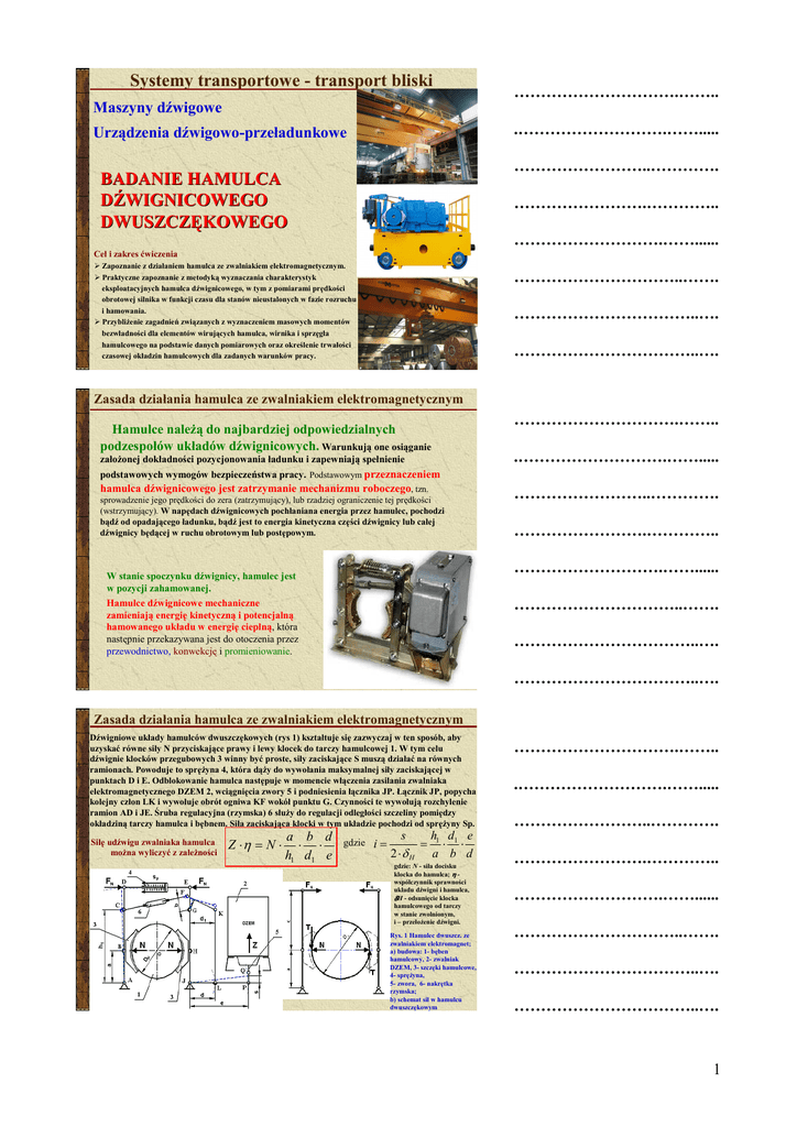 Systemy transportowe - transport bliski ………………………….…….. Maszyny dźwigowe .……………………….……..... Urządzenia dźwigowo-przeładunkowe ……………………..…………. BADANIE HAMULCA DŹWIGNICOWEGO DWUSZCZĘKOWEGO …………………….………….. ……………………….……...... Cel i zakres ćwiczenia Zapoznanie z działaniem hamulca ze zwalniakiem elektromagnetycznym. Praktyczne zapoznanie z metodyką wyznaczania charakterystyk eksploatacyjnych hamulca dźwignicowego, w tym z pomiarami prędkości obrotowej silnika w funkcji czasu dla stanów nieustalonych w fazie rozruchu i hamowania. PrzybliŜenie zagadnień związanych z wyznaczeniem masowych momentów bezwładności dla elementów wirujących hamulca, wirnika i sprzęgła hamulcowego na podstawie danych pomiarowych oraz określenie trwałości czasowej okładzin hamulcowych dla zadanych warunków pracy. …………………………..……. ……………………………..…. ……………………………..…. Zasada działania hamulca ze zwalniakiem elektromagnetycznym Hamulce naleŜą do najbardziej odpowiedzialnych podzespołów układów dźwignicowych. Warunkują one osiąganie załoŜonej dokładności pozycjonowania ładunku i zapewniają spełnienie ………………………….…….. .……………………….……..... podstawowych wymogów bezpieczeństwa pracy. Podstawowym przeznaczeniem hamulca dźwignicowego jest zatrzymanie mechanizmu roboczego, tzn. sprowadzenie jego prędkości do zera (zatrzymujący), lub rzadziej ograniczenie tej prędkości (wstrzymujący). W napędach dźwignicowych pochłaniana energia przez hamulec, pochodzi bądź od opadającego ładunku, bądź jest to energia kinetyczna części dźwignicy lub całej dźwignicy będącej w ruchu obrotowym lub postępowym. ……………………..…………. …………………….………….. ……………………….……...... W stanie spoczynku dźwignicy, hamulec jest w pozycji zahamowanej. Hamulce dźwignicowe mechaniczne zamieniają energię kinetyczną i potencjalną hamowanego układu w energię cieplną, która następnie przekazywana jest do otoczenia przez przewodnictwo, konwekcję i promieniowanie. …………………………..……. ……………………………..…. ……………………………..…. Zasada działania hamulca ze zwalniakiem elektromagnetycznym Dźwigniowe układy hamulców dwuszczękowych (rys 1) kształtuje się zazwyczaj w ten sposób, aby uzyskać równe siły N przyciskające prawy i lewy klocek do tarczy hamulcowej 1. W tym celu dźwignie klocków przegubowych 3 winny być proste, siły zaciskające S muszą działać na równych ramionach. Powoduje to spręŜyna 4, która dąŜy do wywołania maksymalnej siły zaciskającej w punktach D i E. Odblokowanie hamulca następuje w momencie włączenia zasilania zwalniaka elektromagnetycznego DZEM 2, wciągnięcia zwory 5 i podniesienia łącznika JP. Łącznik JP, popycha kolejny człon LK i wywołuje obrót ogniwa KF wokół punktu G. Czynności te wywołują rozchylenie ramion AD i JE. Śruba regulacyjna (rzymska) 6 słuŜy do regulacji odległości szczeliny pomiędzy okładziną tarczy hamulca i bębnem. Siła zaciskająca klocki w tym układzie pochodzi od spręŜyny Sp. Siłę udźwigu zwalniaka hamulca moŜna wyliczyć z zaleŜności a b d Z ⋅η = N ⋅ ⋅ ⋅ h1 d1 e s h d e gdzie i = = 1⋅ 1⋅ 2 ⋅δ H a b d gdzie: N - siła docisku klocka do hamulca; η współczynnik sprawności układu dźwigni i hamulca, δH - odsunięcie klocka hamulcowego od tarczy w stanie zwolnionym, i – przełoŜenie dźwigni. Rys. 1 Hamulec dwuszcz. ze zwalniakiem elektromagnet; a) budowa: 1- bęben hamulcowy, 2- zwalniak DZEM, 3- szczęki hamulcowe, 4- spręŜyna, 5- zwora, 6- nakrętka rzymska; b) schemat sił w hamulcu dwuszczękowym ………………………….…….. .……………………….……..... ……………………..…………. …………………….………….. ……………………….……...... …………………………..……. ……………………………..…. ……………………………..…. 1 Hamulec dźwignicowy ze zwalniakiem elektromagnetycznym Przyjmując z praktyki inŜynierskiej, Ŝe MH≈µ0NDH, zaleŜność na siłę udźwigu zwalniaka hamulca moŜna podać w postaci: MH Z= µ ⋅ DH ⋅ i ⋅ η gdzie: MH - moment hamujący hamulca; DH - średnica tarczy hamulcowej; µ - współczynnik tarcia klocków o tarczę. 2 ⋅ N ⋅δH η = .……………………….……..... ……………………..…………. Pracę, którą wykonuje zwalniak podczas luzowania hamulca (odsuwania klocków hamulcowych od tarczy na odległość δH), moŜna obliczyć przy pomocy wzoru L= ………………………….…….. 2 ⋅ MH ⋅ δ H µ ⋅ DH ⋅ η …………………….………….. ……………………….……...... Jako materiał na okładziny klocków hamulcowych stosuje się najczęściej: tkaninę bawełnianą, na osnowie z siatki metalowej o nazwie ferrodo-fibra, (współczynnik tarcia dla tego materiału przyjmowany jest µ= 0,45), tkaninę azbestową, na osnowie z siatki metalowej, o nazwie ferrodo-azbest (współczynnik tarcia dla tego materiału przyjmowany jest µ= 0,30) masę metalowo-kauczukową, sprasowaną, o współczynniku tarcia µ= 0,25. …………………………..……. ……………………………..…. ……………………………..…. Hamulec dźwignicowy ze zwalniakiem elektromagnetycznym W mechanizmie podnoszenia hamulec musi zapewnić skuteczne zatrzymanie i późniejsze utrzymanie w stanie spoczynku, masy ładunku Q oraz zbocza G0 przy określonym współczynniku pewności z. Moment hamujący hamulca jest określany nierównością: M H ≥ z ⋅ M uh gdzie M uh = ( Q + G0 ) ⋅ DH ⋅ ηh 2 ⋅ ic …………………….………….. ……………
