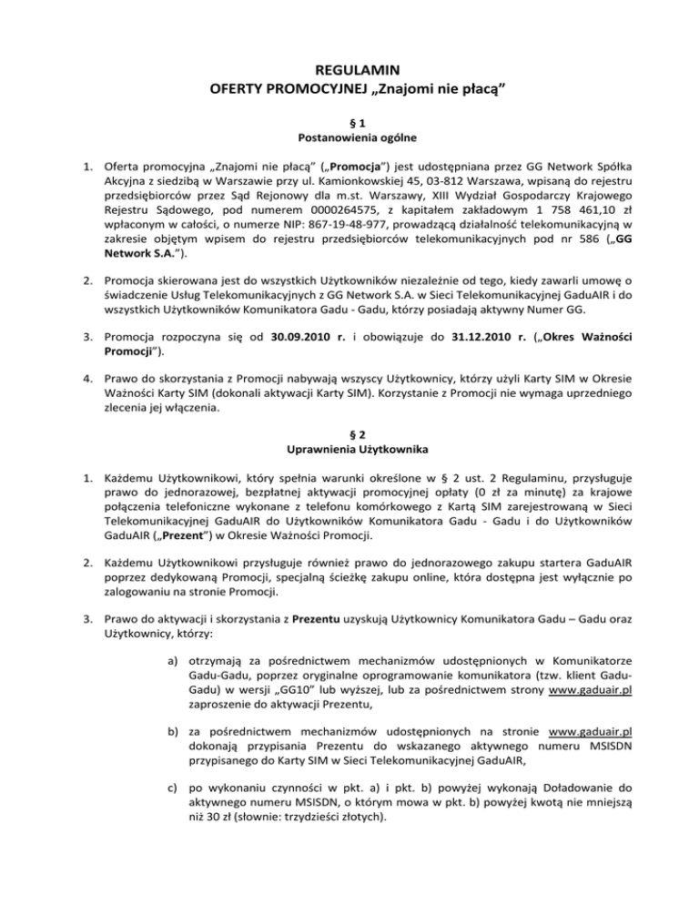 REGULAMIN OFERTY PROMOCYJNEJ „Znajomi nie płacą” §1 Postanowienia ogólne 1. Oferta promocyjna „Znajomi nie płacą” („Promocja”) jest udostępniana przez GG Network Spółka Akcyjna z siedzibą w Warszawie przy ul. Kamionkowskiej 45, 03-812 Warszawa, wpisaną do rejestru przedsiębiorców przez Sąd Rejonowy dla m.st. Warszawy, XIII Wydział Gospodarczy Krajowego Rejestru Sądowego, pod numerem 0000264575, z kapitałem zakładowym 1 758 461,10 zł wpłaconym w całości, o numerze NIP: 867-19-48-977, prowadzącą działalnośd telekomunikacyjną w zakresie objętym wpisem do rejestru przedsiębiorców telekomunikacyjnych pod nr 586 („GG Network S.A.”). 2. Promocja skierowana jest do wszystkich Użytkowników niezależnie od tego, kiedy zawarli umowę o świadczenie Usług Telekomunikacyjnych z GG Network S.A. w Sieci Telekomunikacyjnej GaduAIR i do wszystkich Użytkowników Komunikatora Gadu - Gadu, którzy posiadają aktywny Numer GG. 3. Promocja rozpoczyna się od 30.09.2010 r. i obowiązuje do 31.12.2010 r. („Okres Ważności Promocji”). 4. Prawo do skorzystania z Promocji nabywają wszyscy Użytkownicy, którzy użyli Karty SIM w Okresie Ważności Karty SIM (dokonali aktywacji Karty SIM). Korzystanie z Promocji nie wymaga uprzedniego zlecenia jej włączenia. §2 Uprawnienia Użytkownika 1. Każdemu Użytkownikowi, który spełnia warunki określone w § 2 ust. 2 Regulaminu, przysługuje prawo do jednorazowej, bezpłatnej aktywacji promocyjnej opłaty (0 zł za minutę) za krajowe połączenia telefoniczne wykonane z telefonu komórkowego z Kartą SIM zarejestrowaną w Sieci Telekomunikacyjnej GaduAIR do Użytkowników Komunikatora Gadu - Gadu i do Użytkowników GaduAIR („Prezent”) w Okresie Ważności Promocji. 2. Każdemu Użytkownikowi przysługuje również prawo do jednorazowego zakupu startera GaduAIR poprzez dedykowaną Promocji, specjalną ścieżkę zakupu online, która dostępna jest wyłącznie po zalogowaniu na stronie Promocji. 3. Prawo do aktywacji i skorzystania z Prezentu uzyskują Użytkownicy Komunikatora Gadu – Gadu oraz Użytkownicy, którzy: a) otrzymają za pośrednictwem mechanizmów udostępnionych w Komunikatorze Gadu-Gadu, poprzez oryginalne oprogramowanie komunikatora (tzw. klient GaduGadu) w wersji „GG10” lub wyższej, lub za pośrednictwem strony www.gaduair.pl zaproszenie do aktywacji Prezentu, b) za pośrednictwem mechanizmów udostępnionych na stronie www.gaduair.pl dokonają przypisania Prezentu do wskazanego aktywnego numeru MSISDN przypisanego do Karty SIM w Sieci Telekomunikacyjnej GaduAIR, c) po wykonaniu czynności w pkt. a) i pkt. b) powyżej wykonają Doładowanie do aktywnego numeru MSISDN, o którym mowa w pkt. b) powyżej kwotą nie mniejszą niż 30 zł (słownie: trzydzieści złotych). 4. Aktywacja Promocji następuje w sposób określony przez GG Network S.A. w innych regulaminach świadczenia usług elektronicznych lub w Pomocy. 5. Skorzystanie z Promocji wyklucza w okresie jej trwania możliwośd skorzystania przez Abonenta z promocji udostępnianej Abonentom pod nazwą „Wszechdostępni w GaduAIR” znajdującej się w ofercie GG Network S.A. §3 Reklamacje 1. Reklamacje związane z korzystaniem z Promocji, Użytkownik przesyła za pośrednictwem e-mail na adres: [email protected] lub na adres GG Network S.A. O wyniku postępowania reklamacyjnego Użytkownik jest informowany pisemnie lub za pośrednictwem poczty internetowej w terminie 30 dni od daty doręczenia GG Network S.A. reklamacji. 2. Decyzja GG Network S.A. w przedmiocie reklamacji jest decyzją ostateczną. Nie pozbawia to Użytkownika możliwości dochodzenia swoich praw na podstawie powszechnie obowiązujących przepisów prawa w drodze postępowania sądowego. §4 Postanowienia koocowe 1. Dokonanie aktywacji Promocji jest równoznaczne z akceptacją postanowieo niniejszego Regulaminu. 2. Wszelkie terminy pisane w niniejszym Regulaminie dużą literą – jeśli nie zostały zdefiniowane w niniejszym Regulaminie – mają znaczenie nadane im w Regulaminie Świadczenia Usług Telekomunikacyjnych lub w Cenniku. 3. GG Network S.A. zastrzega sobie prawo ograniczenia lub zablokowania korzystania z Promocji w przypadku gdy Użytkownik swoimi działaniami wpływa na pogorszenie jakości świadczonych usług przez GG Network S.A., zagraża stabilności systemów teleinformatycznych lub podejmuje jakiekolwiek czynności, które w sposób pośredni lub bezpośredni mogą narazid GG Network S.A. na szkody. 4. GG Network S.A. zastrzega sobie prawo zmiany niniejszego Regulaminu w każdym czasie bez konieczności podawania przyczyn. Informacja o zmianie niniejszego Regulaminu, zawieszeniu lub zakooczeniu Promocji zostanie podana do wiadomości Użytkowników na stronie www.gaduair.pl, co nie wpływa na prawa nabyte przez Użytkowników do czasu ogłoszenia zmiany zawieszenia lub zakooczenia Promocji. 5. W zakresie nieuregulowanym niniejszym Regulaminem znajdują zastosowanie postanowienia Regulaminu Świadczenia Usług Telekomunikacyjnych, Regulaminu korzystania z Komunikatora Gadu – Gadu, Cennika oraz obowiązujące przepisy prawa. 2