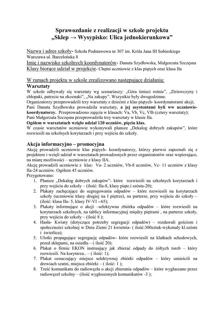 Sprawozdanie z realizacji w szkole projektu „Sklep → Wysypisko: Ulica jednokierunkowa” Nazwa i adres szkoły- Szkoła Podstawowa nr 307 im. Króla Jana III Sobieskiego Warszawa ul. Barcelońska 8 Imię i nazwisko szkolnych koordynatorów- Danuta Szydłowska, Małgorzata Szczęsna Klasy biorące udział w projekcie- Chętni uczniowie z klas piątych oraz klasa IIa W ramach projektu w szkole zrealizowano następujące działania: Warsztaty W szkole odbywały się warsztaty wg scenariuszy: „Góra śmieci rośnie”, „Dziewczyny i chłopaki, patrzcie na ekoznaki”, „Na zakupy”. Wszystkie były dwugodzinne. Organizatorzy przeprowadzili trzy warsztaty z dziećmi z klas piątych- koordynatorami akcji; Pani Danuta Szydłowska prowadziła warsztaty, a jej asystentami byli ww uczniowiekoordynatorzy. Przeprowadzono zajęcia w klasach: Va, Vb, Vc, VIb (cztery warsztaty); Pani Małgorzata Szczęsna przeprowadziła trzy warsztaty w klasie IIa. Ogółem w warsztatach wzięło udział 120 uczniów, pięciu klas. W czasie warsztatów uczniowie wykonywali plansze „Dekalog dobrych zakupów”, które rozwiesili na szkolnych korytarzach i przy wejściu do szkoły. Akcja informacyjno – promocyjna Akcję prowadzili uczniowie klas piątych- koordynatorzy, którzy pierwsi zapoznali się z projektem i wzięli udział w warsztatach prowadzonych przez organizatorów oraz wspierająco, na miarę moŜliwości – uczniowie z klasy IIA. Akcję prowadzili uczniowie z klas: Va- 2 uczniów, Vb-8 uczniów, Vc- 11 uczniów z klasy IIa-24 uczniów. Ogółem 45 uczniów. Przygotowano: 1. Plansze „Dekalog dobrych zakupów”- które rozwiesili na szkolnych korytarzach i przy wejściu do szkoły – (ilość: IIa-8, klasy piąte.i szósta-20); 2. Plakaty zachęcające do segregowania odpadów – które rozwiesili na korytarzach szkoły (uczniowie klasy drugiej na I piętrze), na parterze, przy wejściu do szkoły – (ilość: klasa IIa- 5, klasy IV-VI --65); 3. Plakaty informujące o akcji –selektywna zbiórka odpadów – które rozwiesili na korytarzach szkolnych, na tablicy informacyjnej między piętrami , na parterze szkoły, przy wejściu do szkoły – (ilość 8 ); 4. Hasła- Kwiaty (dotyczące potrzeby segregacji odpadów) – rozdawali gościom i społeczności szkolnej w Dniu Ziemi 21 kwietnia- ( ilość:300sztuk-wykonały kl.szóste i świetlica); 5. Ulotki propagujące segregację odpadów- które rozwiesili na klatkach schodowych, przed sklepami, na osiedlu – ( ilość 20); 6. Plakat o firmie EKON instruujący jak zbierać odpady do Ŝółtych toreb – który rozwiesili. Na korytarzu.. – ( ilość: 1); 7. Plakat oznaczający miejsce selektywnej zbiórki odpadów – który umieścili na drzwiach szatni, miejsca zbiórki – ( ilość: 1 ); 8. Treść komunikatu do radiowęzła o akcji zbierania odpadów – które wygłaszano przez radiowęzeł szkolny – (ilość wygłoszonych komunikatów -3 ); 9. Treść komunikatów o akcji – które wygłaszano we wszystkich klasach, zachęcając osobiście do udziału w akcji i w razie potrzeby instruując – ( ilość wygłoszonych komunikatów: 19 klas x 3); 10. Scenki dramowe według własnych pomysłów uczniów koordynatorów, uczące jak segregować odpady w klasach, do toreb EKON – które przedstawiono we wszystkich klasach – (ilość 19);Ten pomysł spodobał się szczególnie młodszym klasom i lepiej do nich trafił niŜ słowny przekaz. 11. Apel ogólnoszkolny - dnia 31 maja 2007 roku odbył się apel podsumowujący akcje ekologiczne przeprowadzone w naszej szkole w bieŜącym roku szkolnym. Część dotyczącą projektu „Sklep...” prowadzili uczniowie –koordynatorzy projektu z klas piątych. Oprócz grupy uczniów- koordynatorów akcji do promocji idei projektu dołączyli ze swoimi działaniami: 1. Uczniowie klas IV- VI- którzy wzięli udział w konkursie na plakat propagujący segregację śmieci- wykonali 200 plakatów, rozwiesili najciekawsze; 2. Nauczyciele koordynujący akcję w szkole i zastępca dyrektora – którzy stworzyli na szkolnej stronie internetowej (www. sp307.wawa.edupage.org ) miejsce na informacje o projekcie „Sklep → Wysypisko : Ulica jednokierunkowa” i zamieszczają aktualności z tej akcji oraz zdjęcia. 3. Nauczyciele koordynujący akcję w szkole przygotowali sprawozdanie , załączyli zdjęcia i umieścili na korytarzach obu pięter szkoły (umoŜliwiając społeczności szkolnej i rodzicom rozszerzenie wiedzy na temat realizacji projektu). 4. Uczniowie z klasy Ic z wychowawczynią w czasie festynu sprzedawali torby materiałowe na zakupy z adresem szkoły i hasłami ekologicznymi: „Kochamy nasza planetę”, „Kupując torby ekologiczne pomagasz naszej planecie”; 5. Dyrekcja Szkoły w czasie festynu włączyła się do akcji jako pierwsza kupując materiałowe torby na zakupy i propagując akcję wśród uczestników i organizatorów naszego festynu; 6. Uczniowie klasy „0” i klasy IIa brali udział w warsztatach w sklepie ekologicznym „śółty cesarz” przy ulicy Rakowieckiej, i rozmawiali o opakowaniach towarów i pakowaniu ich klientom w papierowe torby. Akcja informacyjno- promocyjna trwała od 19.02 do 21. 04.07 Zbiórka Zbiórka trwała: - w klasach w dniach 23.04 – 27.04, - ogólnoszkolna akcja 7,8,9 maja (9 maja surowce odebrała firma EKON); Szkoła współpracuje z firmą EKON i segregujemy odpady na bieŜąco do Ŝółtych toreb: makulaturę, plastik, aluminium, kartony po sokach. Segregacja odbywa się zarówno w klasach jak i pomieszczeniach administracyjnych. Od dwóch lat zbieramy i oddajemy baterie odpowiednim słuŜbom. W związku z tym, aby akcja przy realizacji projektu, była bardziej zauwaŜalna , do codziennej segregacji odpadów w salach dodaliśmy konkurs na ilość zebranych butelek plastikowych pt. „Odpady do sortowni, a nie na wysypisko” . Uczniowie nie tylko sami zbierali butelki, ale włączyli do akcji swoje rodziny, sąsiadów, rodzice