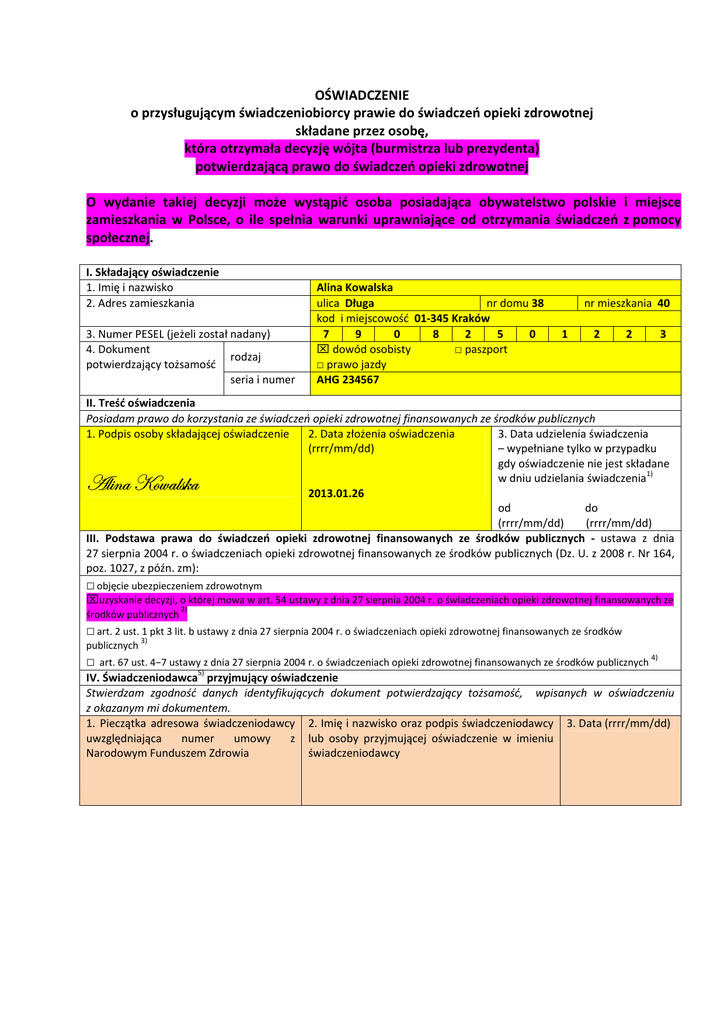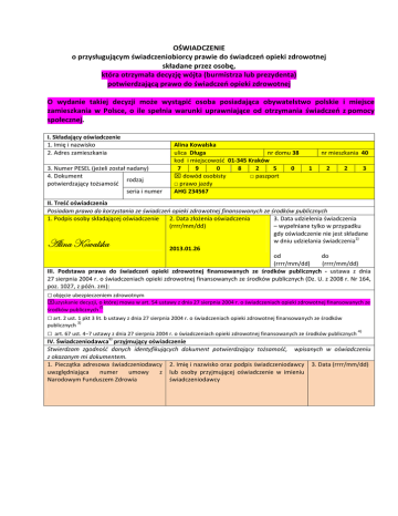 OŚWIADCZENIE o przysługującym świadczeniobiorcy prawie do świadczeń opieki zdrowotnej składane przez osobę, która otrzymała decyzję wójta (burmistrza lub prezydenta) potwierdzającą prawo do świadczeń opieki zdrowotnej O wydanie takiej decyzji może wystąpić osoba posiadająca obywatelstwo polskie i miejsce zamieszkania w Polsce, o ile spełnia warunki uprawniające od otrzymania świadczeń z pomocy społecznej. I. Składający oświadczenie 1. Imię i nazwisko 2. Adres zamieszkania 3. Numer PESEL (jeżeli został nadany) 4. Dokument rodzaj potwierdzający tożsamość seria i numer Alina Kowalska ulica Długa nr domu 38 kod i miejscowość 01‐345 Kraków 7 9 0 8 2 5 0 ⌧ dowód osobisty □ paszport □ prawo jazdy AHG 234567 nr mieszkania 40 1 2 2 3 II. Treść oświadczenia Posiadam prawo do korzystania ze świadczeń opieki zdrowotnej finansowanych ze środków publicznych 3. Data udzielenia świadczenia 1. Podpis osoby składającej oświadczenie 2. Data złożenia oświadczenia – wypełniane tylko w przypadku (rrrr/mm/dd) gdy oświadczenie nie jest składane w dniu udzielania świadczenia1) 2013.01.26 od do (rrrr/mm/dd) (rrrr/mm/dd) III. Podstawa prawa do świadczeń opieki zdrowotnej finansowanych ze środków publicznych ‐ ustawa z dnia 27 sierpnia 2004 r. o świadczeniach opieki zdrowotnej finansowanych ze środków publicznych (Dz. U. z 2008 r. Nr 164, poz. 1027, z późn. zm): TÄ|Çt ^ÉãtÄá~t □ objęcie ubezpieczeniem zdrowotnym ⌧uzyskanie decyzji, o której mowa w art. 54 ustawy z dnia 27 sierpnia 2004 r. o świadczeniach opieki zdrowotnej finansowanych ze środków publicznych 2) □ art. 2 ust. 1 pkt 3 lit. b ustawy z dnia 27 sierpnia 2004 r. o świadczeniach opieki zdrowotnej finansowanych ze środków 3) publicznych □ art. 67 ust. 4−7 ustawy z dnia 27 sierpnia 2004 r. o świadczeniach opieki zdrowotnej finansowanych ze środków publicznych 5) 4) IV. Świadczeniodawca przyjmujący oświadczenie Stwierdzam zgodność danych identyfikujących dokument potwierdzający tożsamość, wpisanych w oświadczeniu z okazanym mi dokumentem. 1. Pieczątka adresowa świadczeniodawcy 2. Imię i nazwisko oraz podpis świadczeniodawcy 3. Data (rrrr/mm/dd) uwzględniająca numer umowy z lub osoby przyjmującej oświadczenie w imieniu Narodowym Funduszem Zdrowia świadczeniodawcy
