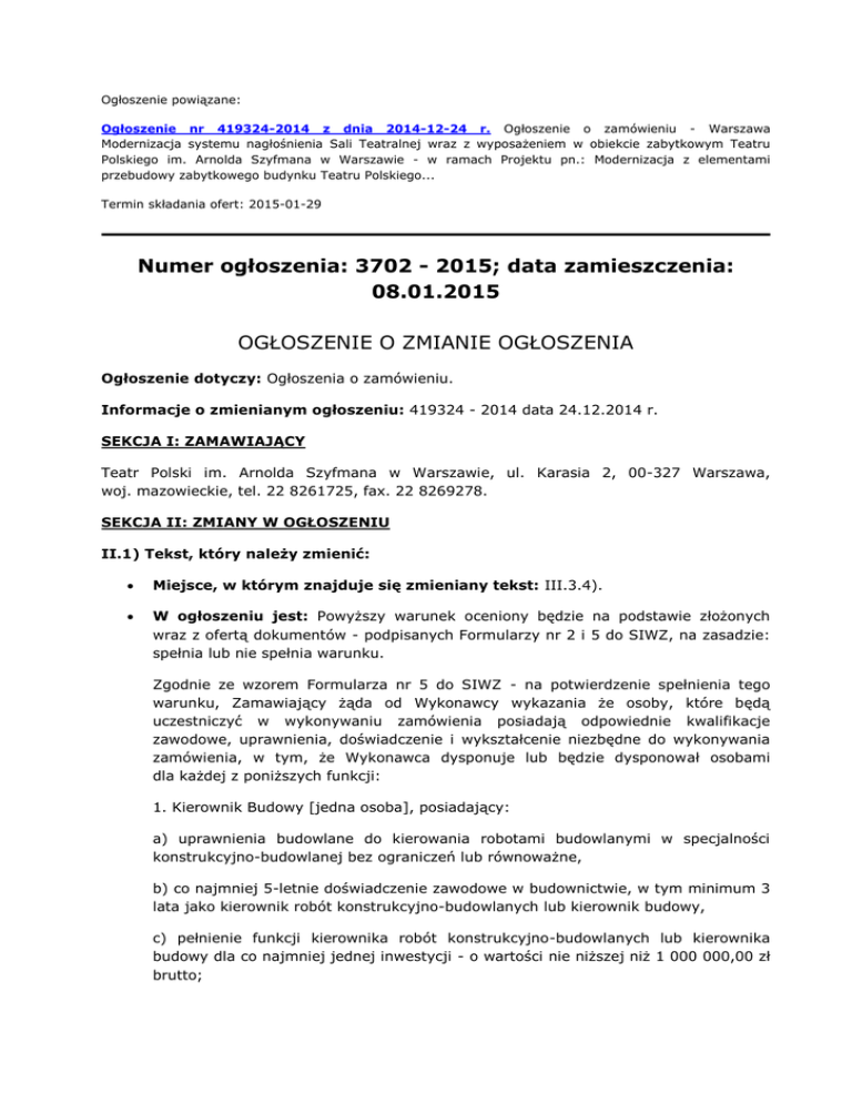 Ogłoszenie powiązane: Ogłoszenie nr 419324-2014 z dnia 2014-12-24 r. Ogłoszenie o zamówieniu - Warszawa Modernizacja systemu nagłośnienia Sali Teatralnej wraz z wyposażeniem w obiekcie zabytkowym Teatru Polskiego im. Arnolda Szyfmana w Warszawie - w ramach Projektu pn.: Modernizacja z elementami przebudowy zabytkowego budynku Teatru Polskiego... Termin składania ofert: 2015-01-29 Numer ogłoszenia: 3702 - 2015; data zamieszczenia: 08.01.2015 OGŁOSZENIE O ZMIANIE OGŁOSZENIA Ogłoszenie dotyczy: Ogłoszenia o zamówieniu. Informacje o zmienianym ogłoszeniu: 419324 - 2014 data 24.12.2014 r. SEKCJA I: ZAMAWIAJĄCY Teatr Polski im. Arnolda Szyfmana w Warszawie, ul. Karasia 2, 00-327 Warszawa, woj. mazowieckie, tel. 22 8261725, fax. 22 8269278. SEKCJA II: ZMIANY W OGŁOSZENIU II.1) Tekst, który należy zmienić: Miejsce, w którym znajduje się zmieniany tekst: III.3.4). W ogłoszeniu jest: Powyższy warunek oceniony będzie na podstawie złożonych wraz z ofertą dokumentów - podpisanych Formularzy nr 2 i 5 do SIWZ, na zasadzie: spełnia lub nie spełnia warunku. Zgodnie ze wzorem Formularza nr 5 do SIWZ - na potwierdzenie spełnienia tego warunku, Zamawiający żąda od Wykonawcy wykazania że osoby, które będą uczestniczyć w wykonywaniu zamówienia posiadają odpowiednie kwalifikacje zawodowe, uprawnienia, doświadczenie i wykształcenie niezbędne do wykonywania zamówienia, w tym, że Wykonawca dysponuje lub będzie dysponował osobami dla każdej z poniższych funkcji: 1. Kierownik Budowy [jedna osoba], posiadający: a) uprawnienia budowlane do kierowania robotami budowlanymi w specjalności konstrukcyjno-budowlanej bez ograniczeń lub równoważne, b) co najmniej 5-letnie doświadczenie zawodowe w budownictwie, w tym minimum 3 lata jako kierownik robót konstrukcyjno-budowlanych lub kierownik budowy, c) pełnienie funkcji kierownika robót konstrukcyjno-budowlanych lub kierownika budowy dla co najmniej jednej inwestycji - o wartości nie niższej niż 1 000 000,00 zł brutto; 2. Kierownik posiadający: robót w specjalności konstrukcyjno-budowlanej [jedna osoba], a) uprawnienia budowlane bez ograniczeń do kierowana robotami budowlanymi w specjalności konstrukcyjno-budowlanej lub równoważne, b) co najmniej 5-letnie doświadczenie zawodowe w budownictwie, w tym minimum 3 lata jako kierownik robót konstrukcyjno-budowlanych lub kierownik budowy, c) pełnienie funkcji kierownika robót konstrukcyjno-budowlanych lub kierownika budowy dla co najmniej jednej inwestycji w obiektach o funkcji teatralnej lub koncertowej, tj. zaliczanych do klasy 1261 według Polskiej Klasyfikacji Obiektów Budowlanych/PKOB - o wartości inwestycji nie niższej niż 1 000 000,00 zł brutto, d) co najmniej 2-letnia praktyka zawodowa na budowie przy zabytkach nieruchomych (zgodnie z § 24 ust. 1 i 2 Rozporządzenie Ministra Kultury i Dziedzictwa Narodowego z dnia 27 lipca 2011 roku w sprawie prowadzenia prac konserwatorskich, restauratorskich, robót budowlanych, badań konserwatorskich, badań architektonicznych i innych działań przy zabytku wpisanych do rejestru zabytków oraz badań archeologicznych (Dz.U. Nr 165, poz. 987); 3. Kierownik robót w specjalności robót instalacyjnych w zakresie sieci, instalacji i urządzeń elektrycznych i elektroenergetycznych [jedna osoba], posiadający: a) uprawnienia budowlane bez ograniczeń do kierowania robotami budowlanymi w specjalności instalacyjnej w zakresie sieci, instalacji i urządzeń elektrycznych i elektroenergetycznych lub równoważne, b) co najmniej 5-letnie doświadczenie zawodowe w budownictwie, w tym minimum 3 lata jako kierownik robót instalacyjnych w zakresie sieci, instalacji i urządzeń elektrycznych i elektroenergetycznych; 4. Specjalista w zakresie technologii [jedna osoba] - minimalne wymagania: i inżynierii obiektów widowiskowych a) wykształcenie wyższe techniczne, b) co najmniej 5-letnie doświadczenie zawodowe w projektowaniu lub projektowaniu i kierowaniu robotami w zakresie technologii i inżynierii obiektów o funkcji teatralnej lub koncertowej, tj. zaliczanych do klasy 1261 według Polskiej Klasyfikacji Obiektów Budowlanych, stanowiącej załącznik do rozporządzenia Rady Ministrów z dnia 30 grudnia 1999 roku w sprawie Polskiej Klasyfikacji Obiektów Budowlanych/PKOB (Dz.U. Nr 112, poz. 1316 z późn. zm.) (w tym mechanika sceny, oświetlenie technologiczne itp.); 5. Projektant [jedna osoba] mechaniki scenicznej - minimalne wymagania: a) co najmniej 3-letnie doświadczenie w projektowaniu w zakresie technologii i inżynierii obiektów o funkcji teatralnej lub koncertowej, tj. zaliczanych do klasy 1261 według Polskiej Klasyfikacji Obiektów Budowlanych, stanowiącej załącznik do rozporządzenia Rady Ministrów z dnia 30 grudnia 1999 roku w sprawie Polskiej Klasyfikacji Obiektów Budowlanych/PKOB (Dz.U. Nr 112, poz. 1316 z późn. zm.), b) doświadczenie w projektowaniu w zakresie mechaniki scenicznej i oświetlenia technologicznego - o wartości inwestycji nie niższej niż 1 000 000,00 zł brutto; 6. Projektant [jedna osoba] instalacji elektrycznych - minimalne wymagania: a) uprawnienia budowlane bez ograniczeń do instalacyjnej w zakresie sieci, instalacji i elektroenergetycznych lub równoważne, projektowania w specjalności i urządzeń elektrycznych b) co najmniej 3-letnie doświadczenie zawodowe w projektowaniu w zakresie instalacji elektrycznych - o wartości inwestycji nie niższej niż 1 000 000,00 zł brutto; 7. Projektant [jedna osoba] oświetlenia technologicznego - minimalne wymagania: a) co najmniej 3-letnie doświadczenie w projektowaniu w zakresie technologii i inżynierii obiektów o funkcji teatralnej lub koncertowej, tj. zaliczanych do klasy 1261 według Polskiej Klasyfikacji Obiektów Budowlanych, stanowiącej załącznik do rozporządzenia Rady Ministrów z dnia 30 grudnia 1999 roku w sprawie Polskiej Klasyfikacji Obiektów Budowlanych/PKOB (Dz.U. Nr 112, poz. 1316 z późn. zm.), b) d