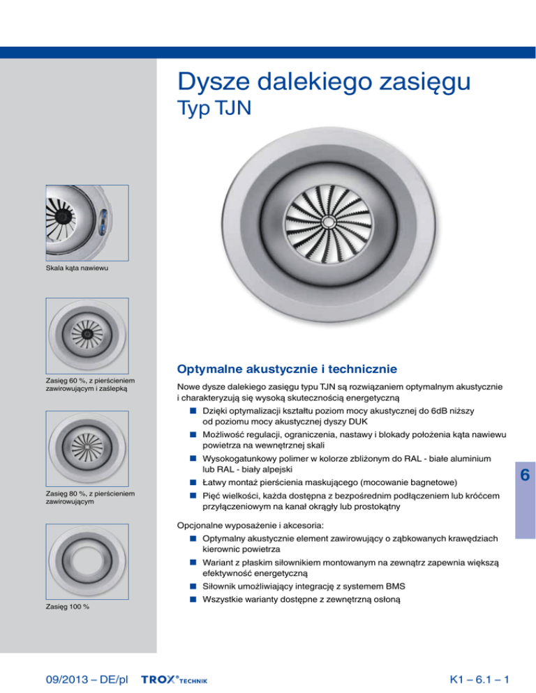 TJN 6.1 – X XTJN testregistrierung Dysze dalekiego zasięgu Typ TJN Skala kąta nawiewu Zasięg 60 %, z pierścieniem zawirowującym i zaślepką Optymalne akustycznie i technicznie Nowe dysze dalekiego zasięgu typu TJN są rozwiązaniem optymalnym akustycznie i charakteryzują się wysoką skutecznością energetyczną Dzięki optymalizacji kształtu poziom mocy akustycznej do 6dB niższy od poziomu mocy akustycznej dyszy DUK Możliwość regulacji, ograniczenia, nastawy i blokady położenia kąta nawiewu powietrza na wewnętrznej skali Wysokogatunkowy polimer w kolorze zbliżonym do RAL - białe aluminium lub RAL - biały alpejski Zasięg 80 %, z pierścieniem zawirowującym Łatwy montaż pierścienia maskującego (mocowanie bagnetowe) Pięć wielkości, każda dostępna z bezpośrednim podłączeniem lub króćcem przyłączeniowym na kanał okrągły lub prostokątny Opcjonalne wyposażenie i akcesoria: Optymalny akustycznie element zawirowujący o ząbkowanych krawędziach kierownic powietrza Wariant z płaskim siłownikiem montowanym na zewnątrz zapewnia większą efektywność energetyczną Siłownik umożliwiający integrację z systemem BMS Zasięg 100 % 09/2013 – DE/pl Wszystkie warianty dostępne z zewnętrzną osłoną K1 – 6.1 – 1 6 Dysze dalekiego zasięgu Kod zamówieniowy Kod zamówieniowy TJN TJN TJN – R – E7 / 160 – 315 / C / D / S1 Typ TJN Regulowana dysza dalekiego zasięgu Elementy przyłączne Bez oznaczeń: bez elementów K Króciec przyłączny na kanał prostokątny R Króciec przyłączny na kanał okrągły średnicę kanału należy podać w punkcie 5 Siłownik Bez oznaczeń: bez siłownika E7 Siłownik min-max lub 3-punktowy, 230 V AC E8 Siłownik min-max lub 3-punktowy, 24 V AC E9 Siłownik sterowany sygnałem napięciowym 2 – 10 V DC, 24 V AC Wielkość nominalna [mm] 160 200 250 315 400 Średnica kanału okrągłego [mm] Podać tylko w wariancie -R 315 Tylko przy wielkości dyszy 160 500 Tylko przy wielkości dyszy do 315 630 800 Elementy zewnętrzne Bez oznaczeń: bez elementów C Zewnętrzna osłona Wyposażenie Bez oznaczeń: bez elementów D Pierścień zawirowujący Wariant wykonania powierzchni Bez oznaczeń: zbliżony do RAL 9010, biały alpejski S1 Zbliżony do RAL 9006, białe aluminium 6 K1 – 6.1 – 2 09/2013 – DE/pl Dysze dalekiego zasięgu Tekst do specyfikacji Opis Regulowana dysza dalekiego zasięgu do nawiewu powietrza w pomieszczeniach wielkokubaturowych. Nawiew poziomy lub pod kątem do ± 30°. Możliwość regulacji, blokady położenia nastawy nawiewu powietrza na wewnętrznej skali. Składa się z dyszy nawiewnej , pierścienia maskującego i osłony zewnętrznej. Do montażu w przewodzie okrągłym. Cechy charakterystyczne: – Łatwy montaż pierścienia maskującego (mocowanie bagnetowe) – Optymalny akustycznie element zawirowujący o ząbkowanych krawędziach kierownic powietrza – Możliwość regulacji, ograniczenia, nastawy i blokady położenia kąta nawiewu powietrza na wewnętrznej skali TJN Wykonania – Zbliżony do RAL 9010, biały alpejski – Zbliżony do RAL 9006, białe aluminium Dane techniczne – Wielkości nominalne: 160, 200, 250, 315, 400 mm – Zakres kąta nawiewu: ± 30° – Zakres strumienia objętości powietrza: 20 – 1000 l/s lub 72 – 3600 m³/h Parametry – _______________________________ [m³/h] – Δpt________________________________ [Pa] – LWA_____________________________ [dB(A)] Materiały – Kołnierz, pierścień maskujący i dysza wykonane z tworzywa sztycznego ABS, niepalne zgodnie z UL 94, V-0 – Zewnętrzna osłona z blachy stalowej ocynkowanej – Króćce przyłączeniowe do kanału prostokątnego lub okrągłego z blachy stalowej ocynkowanej Kod zamówieniowy Typ TJN Regulowana dysza dalekiego zasięgu Elementy przyłączne Bez oznaczeń: bez elementów K Króciec przyłączny na kanał prostokątny R Króciec przyłączny na kanał okrągły - średnicę kanału należy podać w punkcie 5 Siłownik Bez oznaczeń: nastawa ręczna E7 Siłownik min-max lub 3-punktowy, 230 V AC E8 Siłownik min-max lub 3-punktowy, 24 V AC E9 Siłownik sterowany sygnałem napięciowym 2 – 10 V DC, 24 V AC Wielkość nominalna [mm] 160 200 250 315 400 09/2013 – DE/pl Średnica kanału okrągłego [mm] Podać tylko dla wariantu R 315 Tylko dla wielkości dyszy 160 500 Tylko dla wielkości dyszy do 315 630 800 Elementy zewnętrzne Bez oznaczeń: brak C Zewnętrzna osłona Wyposażenie Bez oznaczeń: brak wyposażenia D Pierścień zawirowujący Wariant wykonania Bez oznaczeń: zbliżony do RAL 9010, biały alpejski S1 Zbliżony do RAL 9006, białe aluminium K1 – 6.1 – 3 6