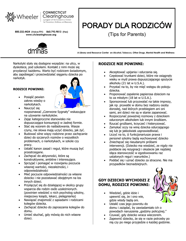 PORADY DLA RODZICÓW 800.232.4424 (Voice/TTY) 860.793.9813 (Fax) www.ctclearinghouse.org (Tips for Parents) A Library and Resource Center on Alcohol, Tobacco, Other Drugs, Mental Health and Wellness Narkotyki stały się dostępne wszędzie: na ulicy, w dyskotece, pod szkołami. Kontakt z nimi może się przydarzyć każdemu. Warto być rodzicem świadomym, aby zapobiegać i przeciwdziałać sięganiu dziecka po narkotyk. RODZICE POWINNI: Posiąść pewien zakres wiedzy o narkotykach. Nauczyć się rozpoznawać „Czerwone Sygnały” wskazujące na używanie narkotyków. Zając kategoryczne stanowisko nie dopuszczające konsumpcji w żadnej formie. Stać się wzorem do naśladowania. Wasze czyny, nie słowa mają uczyć dziecko, jak żyć. Budować silne więzy rodzinne przez zachęcanie dzieci do szczerych rozmów o wszystkich problemach, o narkotykach, w szkole czy pracy. Ustalić kanon zasad i reguł, które muszą być przestrzegane. Zachęcać do aktywności, które są konstruktywne, ambitne i interesujące. Sprzyjać i pomagać w rozwijaniu poczucia własnej wartości, niezależności, i odpowiedzialności Mieć poczucie odpowiedzialności za własne dziecko i nie pozostawać obojętnym na los innych dzieci. Przyłączyć się do działającej w okolicy grupy wsparcia dla rodzin osób uzależnionych. (powinien wiedzieć o nich psycholog szkolny, miejscowy ksiądz, lekarz, pielęgniarka) Nawiązać znajomość z sąsiadami i rodzicami kolegów dziecka. Zachęcać dziecko do zapraszania kolegów do domu. Umieć słuchać, gdy mówią do nich własne dzieci. RODZICE NIE POWINNI: Akceptować upijania i odurzania się. Częstować trunkami dzieci, które nie osiągnęły wieku w myśl prawa dopuszczającego spożycie alkoholu (21 lat w U.S.A.). Przystać na to, by nie mięć wstępu do pokoju dziecka. Proponować zapalenie papierosa dzieciom na to za młodym (18 lat w U.S.A.). Sponsorować lub przyzwalać na takie imprezy, jak np. prywatki w domu bez nadzoru osoby dorosłej, nad których przebiegiem ani oni sami, ani dzieci nie są w stanie zapanować. Rozpoczynać poważnej rozmowy z dzieckiem odurzonym alkoholem lub innym środkiem. Rzucać groźbami, krzyczeć i histeryzować. Zamykać oczy na winę dziecka odurzającego się lub je jakkolwiek usprawiedliwiać. Liczyć na to, iż funkcjonariusze prawa i personel szkolny będą wychowywać dziecko Zniechęcać się nieudanymi próbami interwencji. (Dziecko ma wiedzieć, ze nigdy nie poddacie się rezygnacji i okażecie jak najdalej idąca stanowczość w egzekwowaniu raz ustalonych reguł i warunków.) Poddać się i uznać dziecko za stracone. Nie ma przypadków beznadziejnych. GDY DZIECKO WYCHODZI Z DOMU, RODZICE POWINNI: Wiedzieć, gdzie idzie i upewnić się, że i ono wie, gdzie wtedy będą oni. Ustalić czas jego powrotu do domu i zażądać, by zawiadamiało ich o powodach naruszenia „godziny policyjnej.” Czuwać, gdy dziecko wraca wieczorem. Zapewnić dziecko, że się w razie potrzeby po nią czy po niego przyjedzie o każdej godzinie. Skontaktować się, dla pewności, z rodzicami patronującymi imprezie i zapytać, czy na pewno będzie nadzór osoby dorosłej. GDY DZIECKO URZĄDZA PRYWATKĘ U SIEBIE, RODZICE POWINNI: Ustalić z nim podstawowe sprawy, jak czas trwania przyjęcia, liczbę gości, wybór miejsca, jedzenia, napojów, wykluczenie alkoholu i narkotyków. Nie dopuszczać do nazbyt liczebnego Zapewnić odpowiednią ilość jedzenia i warunki do zabawy. Położyć nacisk na trzymanie się zasady „wyłącznie dla zaproszonych gości.” Zapobiegać tendencji do „wychodzenia na krótko.” Zdecydować z góry, co robić z gośćmi, którzy przynieśli alkohol czy inne środki odurzające lub już są pod ich działaniem. Nie dopuścić w żadnym wypadku, by osoba nietrzeźwa czy odurzona prowadziła samochód lub samotnie opuszczała przyjęcie. Być w domu i do dyspozycji, ale trzymać się na uboczu. Zaprosić innych rodziców, by pomogli w nadzorowaniu prywatki i dotrzymywali towarzystwa gospodarzom. CZERWONE SYGNALY Zauważone oznaki używania alkoholu i innych narkotyków: zapach alkoholu w oddechu, wymiocinach okresy utraty pamięci; wykonywanie czynności, których potem się nie przypomina niepewny krok, zataczanie się trudności ze skupieniem wzroku mówienie w sposób rozwlekły, powtarzanie się blizny (heroina) rozszerzone źrenice (kokaina) zwężone źrenice (heroina) „szklane” oczy (alkohol lub marihuana) doniesienia innych osób o używaniu środków odurzających przedawkowanie (stan śpiączki po użyciu) ataki śmiechu bez powodu, wzrost apetytu (marihuana) chroniczne zaczerwienienie oczu (marihuana) słodki, mdły zapach marihuany na ubraniu lub w pokoju dreszcze/drgawki zatkany nos; krwotoki z nosa napięcie, podenerwowanie, ekscytacja stan krańcowej paniki nadmierne zmniejszenie lub zwiększenie wagi ubytki w domowym zapasie alkoholu znikanie domowych środków uspokajających lub innych lęków małe celofanowe torebki z pozostałościami listków, łodyg i nasion podobnych do przyprawy oregano puszki po piwie, butelki od wina czy wódki w pokoju żyletka o prostych ostrzach (do ułożenia „działki” kokainy), maleńka łyżeczka, często noszona na szyi (do wdychania kokainy) mały słoiczek lub fiołka z kolorowym, plastykowym korkiem (crack) fajka z podwójną główką (dolna cześć na wodę, górna na crack) małe fajki z porcelany (marihuana) wysoka, często kolorowa fajka wodna z plastyku lub mosiądzu do palenia marihuany lub haszyszu bibułki do papierosów (do robienia skrętów z marihuany) szczypczyki do przytrzymywania skręta z marihuany kadzidełka (by przysłonić zapach marihuany) środki odświeżające oddech –guma do żucia, pigułki różnych kształtów, rozmiarów, kolorów szarobiałe, przypominające mydło cząstki wielkości ziarenka grochu (crack) strzykawka (do wstrzykiwania kokainy, heroiny lub obu naraz) aluminiowa puszka, taka jak po coka-c