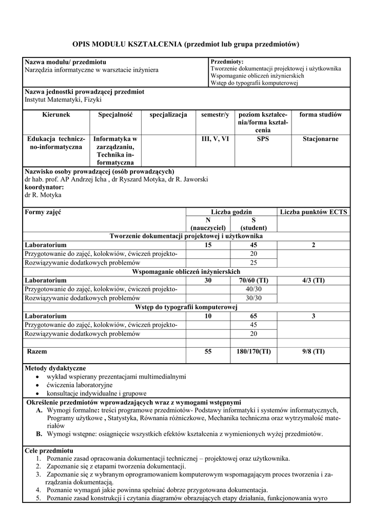 OPIS MODUŁU KSZTAŁCENIA (przedmiot lub grupa przedmiotów) Nazwa modułu/ przedmiotu Narzędzia informatyczne w warsztacie inżyniera Przedmioty: Tworzenie dokumentacji projektowej i użytkownika Wspomaganie obliczeń inżynierskich Wstęp do typografii komputerowej Nazwa jednostki prowadzącej przedmiot Instytut Matematyki, Fizyki Kierunek Specjalność specjalizacja semestr/y Edukacja techniczno-informatyczna Informatyka w III, V, VI zarządzaniu, Technika informatyczna Nazwisko osoby prowadzącej (osób prowadzących) dr hab. prof. AP Andrzej Icha , dr Ryszard Motyka, dr R. Jaworski koordynator: dr R. Motyka poziom kształcenia/forma kształcenia SPS Formy zajęć Liczba godzin N S (nauczyciel) (student) Tworzenie dokumentacji projektowej i użytkownika Laboratorium 15 45 Przygotowanie do zajęć, kolokwiów, ćwiczeń projekto20 wych Rozwiązywanie dodatkowych problemów 25 Wspomaganie obliczeń inżynierskich Laboratorium 30 70/60 (TI) Przygotowanie do zajęć, kolokwiów, ćwiczeń projekto40/30 wych Rozwiązywanie dodatkowych problemów 30/30 Wstęp do typografii komputerowej Laboratorium 10 65 Przygotowanie do zajęć, kolokwiów, ćwiczeń projekto45 wych Rozwiązywanie dodatkowych problemów 20 Razem 55 180/170(TI) forma studiów Stacjonarne Liczba punktów ECTS 2 4/3 (TI) 3 9/8 (TI) Metody dydaktyczne wykład wspierany prezentacjami multimedialnymi ćwiczenia laboratoryjne konsultacje indywidualne i grupowe Określenie przedmiotów wprowadzających wraz z wymogami wstępnymi A. Wymogi formalne: treści programowe przedmiotów- Podstawy informatyki i systemów informatycznych, Programy użytkowe , Statystyka, Równania różniczkowe, Mechanika techniczna oraz wytrzymałość materiałów B. Wymogi wstępne: osiągnięcie wszystkich efektów kształcenia z wymienionych wyżej przedmiotów. Cele przedmiotu 1. Poznanie zasad opracowania dokumentacji technicznej – projektowej oraz użytkownika. 2. Zapoznanie się z etapami tworzenia dokumentacji. 3. Zapoznanie się z wybranym oprogramowaniem komputerowym wspomagającym proces tworzenia i zarządzania dokumentacją. 4. Poznanie wymagań jakie powinna spełniać dobrze przygotowana dokumentacja. 5. Poznanie zasad konstrukcji i czytania diagramów obrazujących etapy działania, funkcjonowania wyro 6. 7. 8. 9. 10. 11. bu/procesu poddawanego dokumentowaniu. Zapoznanie z możliwościami wykorzystania pakietów matematycznych i innych środowisk do obliczeń inży nierskich. Zapoznanie z możliwościami modelowania stochastycznego. Zapoznanie studentów z zagadnieniami związanymi z wykorzystywaniem komputerów i stosownego oprogramowania do przygotowywania publikacji naukowych, prac licencjackich, magisterskich, doktorskich itp. Dostarczenie studentom wiedzy i stosownych pakietów makr pozwalających na realizację prac licencjackich (magisterskich) w systemie składu LATEX2ε. Treści programowe 1. Zasady tworzenia dokumentacji projektowej i użytkownika. Infrastruktura dokumentacyjna. a. Tworzenie instrukcji stanowiskowych, kart zadań stanowisk pracy, kart obiegu wybranych dokumentów. b. Projektowanie formularzy. c. Strona merytoryczna i edycyjna dokumentacji 2. Rodzaje dokumentacji użytkownika. 3. Narzędzia do wspomagania tworzenia dokumentacji technicznej. 4. Narzędzia informatyczne zarządzania dokumentacją techniczną i pracą grupową. 5. Tworzenie dokumentacji elektronicznej oraz z przeznaczeniem do wydruku 6. Przykładowa dokumentacja projektowa i użytkownika – studium przypadku. Analiza wybranych instrukcji obsługi i plików pomocy do programów komputerowych. 7. Opracowanie instrukcji obsługi 8. Graficzny język diagramów a. podstawowe informacje o języku UML b. diagramy przepływy danych – DFD c. diagram zmiany stanów –STD 9. Mathcad jako narzędzie do obliczeń numerycznych. Podstawy posługiwania się Mathcadem: wyrażenie – identfikatory, instrukcja podstawienia, instrukcja ujawnienia wyniku, macierze - indeksy macierzowe, zmienne zakresowe, operacje na macierzach, funkcje - tworzenie funkcji prostych i złożonych, przegląd funkcji wbudowanych. 10. Wykresy 2D i 3D - tworzenie i formatowanie wykresów, analiza danych - funkcje wbudowane i algorytmy użytkownika, obliczenia symboliczne 12. Mathcad jako narzędzie do obliczeń inżynierskich. Zagadnienia sprowadzające się do równania bądź układ równań algebraicznych z dziedziny mechaniki płynów i ruchu ciepła. Przegląd integratorów Mathcada. Zagad nienia początkowe i brzegowe. Dwupunktowe zagadnienie brzegowe 13. Rozwiązywanie równań różniczkowych cząstkowych typu parabolicznego metodą linii. 14. Zagadnienia różniczkowania i całkowania danych surowych oraz danych wygładzonych 15. Aproksymacja danych funkcją określonego modelu: a) Model funkcji hiperbolicznej, b) Modele funkcji logarytmicznej, c) Modele funkcji ekspotencjalnej d) Modele funkcji potęgowej i wykładniczej e) Modele funkcji logistycznej f) Model funkcji parabolicznej, g) Modele wielomianu: algebraicznego pierwszego stopnia i n-tego stopnia, trygonometrycznego – szereg Fouriera 16. Modelowanie stochastyczne i programowanie w Mathcadzie. 17. Elementy syntezy, analizy i filtrowania sygnałów cyfrowych. 18. Klasyczne metody prognozowania szeregów czasowych w Statistice. Analiza i prognozowanie na podstawie klasycznych modeli trendu w Statistice. Analiza i prognozowanie na podstawie szeregów czasowych z wahaniami sezonowymi. Modele regresji w prognozowaniu. Prognozowanie na podstawie modeli adaptacyjnych.Prognozowanie zmiennych jakościowych . Predykcja na podstawie modeli autoregresyjnych (procesy ARMA, ARIMA) .Modele prognozowania wariancji procesu - wielowymiarowe procesy stochastyczne modele klasy GARCH 19. Prognozowanie finansowych szeregów czasowych. Modele prognozowania wariancji procesu. Estymacja i prognozowanie miar ryzyka. 20. Wprowadzenie do systemu TEX 21. Elementy typografii 22. Formy źródłowe dokumentu; 23. Matematyka w TEX-u; 24. Podstawy 