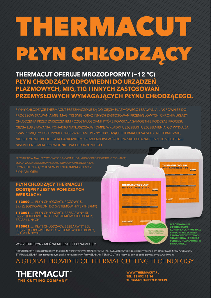 Thermacut PŁYN CHŁODZĄCY Thermacut oferuje mrozodporny (−12 °C) płyn chłodzący odpowiedni do urządzeń plazmowych, MIG, TIG i innych zastosowań przemysłowych wymagających płynu chłodzącego. PŁYNY CHŁODZĄCE THERMACUT PRZEZNACZONE SĄ DO CIĘCIA PLAZMOWEGO I SPAWANIA, JAK RÓWNIEŻ DO PROCESÓW SPAWANIA MIG, MAG, TIG (WIG) ORAZ INNYCH ZASTOSOWAŃ PRZEMYSŁOWYCH. CHRONIĄ UKŁADY CHŁODZENIA PRZED ZNISZCZENIEM POZOSTAŁOŚCIAMI, KTÓRE POWSTAJĄ SAMOISTNIE PODCZAS PROCESU CIĘCIA LUB SPAWANIA. PONADTO NATŁUSZCZAJĄ POMPĘ, WKŁADKI, USZCZELKI I USZCZELNIENIA, CO WYDŁUŻA CZAS POMIĘDZY KOLEJNYMI KONSERWACJAMI. PŁYNY CHŁODZĄCE THERMACUT SĄ STABILNE TERMICZNIE, NIETOKSYCZNE, PODLEGAJĄ CAŁKOWITEMU ROZKŁADOWI W ŚRODOWISKU I CHARAKTERYZUJE SIĘ BARDZO NISKIM POZIOMEM PRZEWODNICTWA ELEKTRYCZNEGO. SpecYFIKACJA: max. PRZEWODNOŚĆ:10 µS/cm, PH 6-8, MROZOODPORNOŚĆ DO −12 °C (+10 °f). SKŁAD: WODA DEJONIZOWANA70%, GLIKOL PROPYLENOWY 30%. PŁYN CHŁODZĄCY JEST W PEŁNI KOMPATYBILNY Z PŁYNAMI OEM. PŁYN CHŁODZĄCY Thermacut DOSTĘPNY JEST W PONIŻSZYCH WERSJACH: T-13000 ..... PŁYN CHŁODZĄCY, RÓŻOWY, 5L 89,- zł (odpowiedni do systemów HYPERTHERM®) T-13001 ..... PŁYN CHŁODZĄCY, BEZBARWNY, 5L 89,- zł (odpowiedni do SYSTEMÓW kJELLBERG®, ESAB® I nnych) W PORÓWNANIU Z PRODUKTAMI KONKURENCYJNYMI, NASZ PRODUKT NIE ZAWIERA ŻADNYCH TOKSYCZNYCH SKŁADNIKÓW I PODLEGA PEŁNEMU ROZKŁADOWI W ŚRODOWISKU. T-13002 ..... PŁYN CHŁODZĄCY, BEZBARWNY 20L 335,- zł (odpowiedni do SYSTEMÓW kJELLBERG®, ESAB® I nnych) WSZYSTKIE PŁYNY MOŻNA MIESZAĆ Z PŁYNAMI OEM. HYPERTHERM® jest zastrzeżonym znakiem towarowym firmy HYPERTHERM, Inc. KJELLBERG® jest zastrzeżonym znakiem towarowym firmy KJELLBERG STIFTUNG. ESAB® jest zastrzeżonym znakiem towarowym firmy ESAB AB. TERMACUT nie jest w żaden sposób powiązany z w/w firmami. A GLOBAL PROVIDER OF THERMAL CUTTING TECHNOLOGY www.thermacut.PL tel: 33 852 13 34 [email protected]