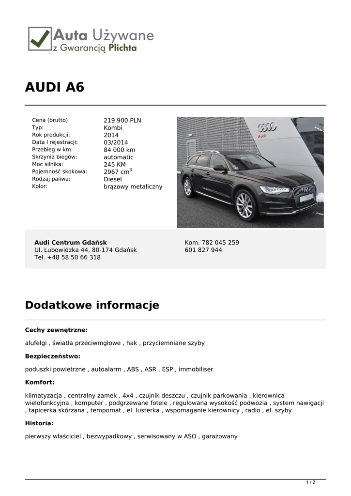 AUDI A6 Cena (brutto) Typ: Rok produkcji: Data I rejestracji: Przebieg w km: Skrzynia biegów: Moc silnika: Pojemność skokowa: Rodzaj paliwa: Kolor: 219 900 PLN Kombi 2014 03/2014 84 000 km automatic 245 KM 2967 cm3 Diesel brązowy metaliczny Audi Centrum Gdańsk Ul. Lubowidzka 44, 80-174 Gdańsk Tel. +48 58 50 66 318 Kom. 782 045 259 601 827 944 Dodatkowe informacje Cechy zewnętrzne: alufelgi , światła przeciwmgłowe , hak , przyciemniane szyby Bezpieczeństwo: poduszki powietrzne , autoalarm , ABS , ASR , ESP , immobiliser Komfort: klimatyzacja , centralny zamek , 4x4 , czujnik deszczu , czujnik parkowania , kierownica wielofunkcyjna , komputer , podgrzewane fotele , regulowana wysokość podwozia , system nawigacji , tapicerka skórzana , tempomat , el. lusterka , wspomaganie kierownicy , radio , el. szyby Historia: pierwszy właściciel , bezwypadkowy , serwisowany w ASO , garażowany 1/2 Gwarancja Szanowni Państwo, Pragniemy Państwa poinformować, iż firma Plichta – Autoryzowany Dealer Škoda Auto prowadzi skup oraz sprzedaż samochodów używanych wszystkich marek, oferując także samochody używane z gwarancją objęte programem „Auta używane z Gwarancją Plichta”. W ramach programu „Auta Używane z Gwarancją Plichta ” każdy Klient otrzymuje atrakcyjny pakiet zniżek pozwalający zoptymalizować koszty eksploatacji samochodu: -50% na serwis klimatyzacji -50% na ustawienie zbieżności -50% na kosmetykę auta -50% na ścieżkę diagnostyczną -25% na wymiany oleju -25% na zakup opon + 5zł na sezon za hotelowanie opon -15% na części i akcesoria Oferujemy również kompleksową obsługę w zakresie finansowania i ubezpieczenia: - kredyty już od 4,99% - leasingi i kredyty bez zaświadczeń - uproszczone procedury – decyzja już od 30 min. - atrakcyjne pakiety AC/OC/NW/ASS wiodących firm ubezpieczeniowych Możliwość pozostawienia dotychczas użytkowanego auta w rozliczeniu – BEZPŁATNA WYCENA!!! Zapraszamy wszystkich Klientów na jazdę próbną wybranym autem. Numer oferty: xx14 Informacja nie stanowi oferty w rozumieniu art. 66 KC. Podane dane mają charakter wyłącznie informacyjny. 2/2 Powered by TCPDF (www.tcpdf.org)