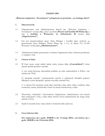 ZASADY GRY „Welcome inspiration – Everydayme” („Inspiracja na powitanie – ja, każdego dnia”) 1. ORGANIZATOR 1.1 Organizatorem oraz administratorem danych gry „Welcome inspiration – Everydayme” (zwanej dalej „Grą”) jest firma Procter and Gamble DS Polska Sp. z o.o. z siedzibą w Warszawie, ul. Zabraniecka 20 (zwana dalej „Organizatorem”). 1.2 Gra jest przeprowadzana przez firmę Pelargos i wszelkie dane osobowe są przetwarzane przez Pelargos, Promo Direct Sp. z o.o., ul. Bema 57a, 01-244 Warszawa (zwaną dalej „Administratorem”). 1.3 Administrator będzie przetwarzać w imieniu Organizatora dane osobowe przekazane w związku z Grą. 2. UDZIAŁ W GRZE 2.1 W Grze może wziąć udział każda osoba (zwana dalej „Uczestnikiem”), która łącznie spełnia poniższe warunki: a/ jest osobą fizyczną, obywatelem polskim, na stałe zamieszkałym w Polsce i ma ukończone 18 lat; b/ akceptuje warunki i postanowienia zawarte w niniejszych Zasadach poprzez kliknięcie w polu akceptacji i spełnia wszystkie warunki Gry; c/ w okresie Gry rejestruje swoje dane (nazwisko, imię, adres, adres e-mailowy, datę urodzenia), nazwę użytkownika i hasło na stronie internetowej; a także 2.2 Pracownicy, właściciele i kierownictwo Organizatora, Administratora oraz innych firm związanych z Grą, a także bliscy krewni wyżej wymienionych nie mogą wziąć udziału w Grze. 2.3 Każdy Uczestnik może wziąć udział w konkursie tylko jeden raz. 3. CZAS TRWANIA GRY Gra rozpoczyna się o godz. 10:00:00 w dn. 11 lutego 2013r., zaś kończy się o godz. 10:00:00 w dn. 8 kwietnia 2013r. 4. PROCEDURA GRY 4.1 Osoby, które chcą uczestniczyć w Grze muszą zarejestrować się na stronie internetowej zgodnie z punktem 2.1 Zasad Gry, a następnie wziąć udział oraz odnieść sukces w Grze o nazwie „Welcome inspiration – Everydayme”, przedstawionej na tej stronie. Po rejestracji Uczestnicy będą identyfikowani na podstawie nazwy użytkownika i hasła, które podali podczas rejestracji. Zgodnie z wymogiem uczestnictwa w Grze, gracz zarejestrowany na stronie http://www.everydayme.pl/ musi odpowiedzieć na 3 pytania z kwestionariusza, korzystając z formularza dostępnego na tej stronie http://www.everydayme.pl/. 4.2. Zwycięzca Gry (zwany dalej „Zwycięzcą”) zostanie wybrany przez Jury z bazy danych zarejestrowanych użytkowników, którzy podczas Gry odpowiedzieli w formularzu ze strony http://www.everydayme.pl/ na wszystkie pytania z kwestionariusza „Welcome inspiration – Everydayme”, zgodnie z przedstawionymi Zasadami. W skład Jury wchodzą managerowie ds. marketingu i PR Organizatora. Będą oni wybierać 7 zwycięzców nagrody codziennej i 1 zwycięzcę nagrody cotygodniowej w każdym tygodniu trwania konkursu. Kryterium wyboru zwycięzców stanowią najbardziej kreatywne i inspirujące odpowiedzi. Nie powinny one zawierać wypełniaczy, ani tekstów typu „lorem ipsum”. Nie powinny składać się wyłącznie z liter, które nie przekazują żadnego znaczenia. Zwycięzca będzie miał prawo do otrzymania Nagrody, jaką wybrał podczas rejestracji na stronie internetowej. Uczestnik nie może później modyfikować wybranej nagrody. 4.3. Jury wybierze 2 dodatkowych zwycięzców. Zwycięzca udowodni, że spełnia wszystkie wymogi przedstawione w Zasadach Gry. Dodatkowy zwycięzca będzie miał prawo do wybranej przez siebie Nagrody, jeżeli Zwycięzca nie spełni każdego z wymogów zawartych w Zasadach Gry. 4.4. Uczestnik oświadcza, że odpowiedzi udzielone przez niego w konkursie nie naruszają praw żadnej osoby trzeciej, w szczególności praw własności intelektualnej. Uczestnik udziela Organizatorowi licencji niewyłącznej w celu umożliwienia publikacji tychże odpowiedzi na stronie www.everydayme.pl. Uczestnik oświadcza, że bierze na siebie pełną odpowiedzialność w przypadku zgłoszenia jakichkolwiek roszczeń osób trzecich w zakresie naruszenia praw autorskich czy innych praw osób trzecich w związku z publikacją ww. odpowiedzi, a w szczególności zobowiązuje się że wstąpi jako pozwany w miejsce Organizatora lub przystąpi po stronie Organiarza do postępowań toczących się przeciwko niemu z tego tytułu.. 5. NAGRODY 5.1 Dla Uczestników dostępne są następujące nagrody (zwane dalej „Nagrodami”): 56 nagród codziennych: Jedna nagroda codzienna składa się z: 2-minutowej Maski Intensywnie Odżywiającej Pantene Odżywki Pantene Pro-V INTENSYWNA REGENERACJA, 200ml Szamponu Pantene Pro-V INTENSYWNA REGENERACJA, 250ml Maszynki dla kobiet Venus Pro Skin Sensitive +1 WKŁAD Kremu do twarzy na dzień Olay Total Effects UV SPF15, 50ml 8 nagród cotygodniowych: Jedna nagroda cotygodniowa składa się z: Kapsułek piorących ARIEL Liquid Tabs Regular, 32x35gr Kapsułek piorących ARIEL Liquid Tabs Reg, 16x35gr Odplamiacza w płynie Ariel Professional, 2l Koncentratu Lenor Summer, butelka 2l Kwota w gotówce 64 PLN, która zostanie wykorzystana do pokrycia zobowiązań podatkowych (PIT) Całkowita wartość nagrody przyznawanej codziennie to 125 PLN (wliczając podatek VAT).* Całkowita wartość nagród codziennych wynosi 7.000 PLN (wliczając podatek VAT).* Całkowita wartość nagrody przyznawanej co tydzień to 579 PLN (wliczając podatek VAT) * Całkowita wartość nagród cotygodniowych wynosi 4.632 PLN (wliczając podatek VAT)* Wszelkie inne koszty zostaną poniesione przez Zwycięzcę. * Rekomendowane ceny detaliczne 5.2 Administrator powiadomi Zwycięzcę w ciągu 5 dni roboczych od zakończenia danego losowania zwycięzców, korzystając z adresu e-mailowego podanego przez Zwycięzcę przy rejestracji. Administrator spróbuje skontaktować się ze Zwycięzcą drogą e-mailową, jednorazowo nie więcej niż 3 razy. Jeżeli Zwycięzca nie odpowie na wspomnianą wyżej próbę kontaktu ze strony Administratora w ciągu 5 dni roboczych od momentu wysłania ostatniego e-maila, straci prawo do odebrania Nagrody. Administrator nie da