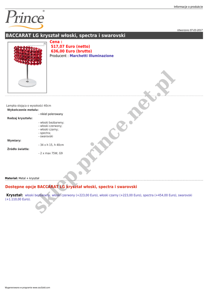 Informacje o produkcie Utworzono 07-03-2017 BACCARAT LG kryształ włoski, spectra i swarovski Cena : 517,07 Euro (netto) 636,00 Euro (brutto) Materiał: Metal + kryształ e. pr in c p. Lampka stojąca o wysokości 40cm Wykończenie metalu: - nikiel polerowany Rodzaj kryształu: - włoski bezbarwny; - włoski czerwony; - włoski czarny; - spectra; - swarovski Wymiary: - 34 x h 15, h 40cm Źródło światła: - 2 x max 75W, G9 ne t. pl Producent : Marchetti Illuminazione sk le Dostępne opcje BACCARAT LG kryształ włoski, spectra i swarovski Kryształ: włoski bezbarwny, włoski czerwony (+223,00 Euro), włoski czarny (+223,00 Euro), spectra (+454,00 Euro), swarovski (+1.110,00 Euro). Wygenerowano w programie www.oscGold.com