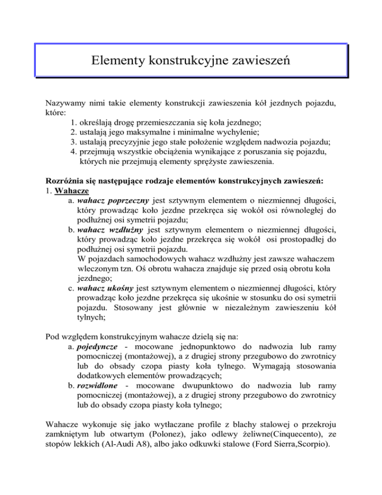 Elementy konstrukcyjne zawieszeń Nazywamy nimi takie elementy konstrukcji zawieszenia kół jezdnych pojazdu, które: 1. określają drogę przemieszczania się koła jezdnego; 2. ustalają jego maksymalne i minimalne wychylenie; 3. ustalają precyzyjnie jego stałe położenie względem nadwozia pojazdu; 4. przejmują wszystkie obciążenia wynikające z poruszania się pojazdu, których nie przejmują elementy sprężyste zawieszenia. Rozróżnia się następujące rodzaje elementów konstrukcyjnych zawieszeń: 1. Wahacze a. wahacz poprzeczny jest sztywnym elementem o niezmiennej długości, który prowadząc koło jezdne przekręca się wokół osi równoległej do podłużnej osi symetrii pojazdu; b. wahacz wzdłużny jest sztywnym elementem o niezmiennej długości, który prowadząc koło jezdne przekręca się wokół osi prostopadłej do podłużnej osi symetrii pojazdu. W pojazdach samochodowych wahacz wzdłużny jest zawsze wahaczem wleczonym tzn. Oś obrotu wahacza znajduje się przed osią obrotu koła jezdnego; c. wahacz ukośny jest sztywnym elementem o niezmiennej długości, który prowadząc koło jezdne przekręca się ukośnie w stosunku do osi symetrii pojazdu. Stosowany jest głównie w niezależnym zawieszeniu kół tylnych; Pod względem konstrukcyjnym wahacze dzielą się na: a. pojedyncze - mocowane jednopunktowo do nadwozia lub ramy pomocniczej (montażowej), a z drugiej strony przegubowo do zwrotnicy lub do obsady czopa piasty koła tylnego. Wymagają stosowania dodatkowych elementów prowadzących; b. rozwidlone - mocowane dwupunktowo do nadwozia lub ramy pomocniczej (montażowej), a z drugiej strony przegubowo do zwrotnicy lub do obsady czopa piasty koła tylnego; Wahacze wykonuje się jako wytłaczane profile z blachy stalowej o przekroju zamkniętym lub otwartym (Polonez), jako odlewy żeliwne(Cinquecento), ze stopów lekkich (Al-Audi A8), albo jako odkuwki stalowe (Ford Sierra,Scorpio). 2. Drążki reakcyjne i ustalające a. drążek reakcyjny ogranicza wzdłużne przemieszczenia wzajemne ramy lub nadwozia pojazdu i jego osi lub mostu napędowego albo zawieszonego niezależnie koła jezdnego powstające w wyniku działania siły napędowej lub siły hamowania; b. drążek ustalający ogranicza poprzeczne lub skośne przemieszczenia ramy lub nadwozia pojazdu i jego osi lub mostu napędowego albo zawieszonego niezależnie koła jezdnego powstające w wyniku działania sił bocznych; Typowe drążki ustalające stosuje się wówczas, gdy elementy zawieszenia nie nadają się do przenoszenia obciążeń bocznych lub gdy boczne obciążenia zewnętrzne mogą spowodować niepożądane odkształcenia elementów sprężystych. Drążki reakcyjne i ustalające wykonuje się jako pręty lub rury o przekroju kołowym albo owalnym ze stali konstrukcyjnej, zakończone uchami z tulejami metalowo-gumowymi lub końcówkami gwintowanymi z podkładkami gumowymi i nakrętką mocowane do wahacza z możliwością regulacji geometrii zawieszenia. Drążek Panharda - drążek ustalający w zawieszeniu kół tylnych ograniczający przemieszczenia poprzeczne osi tylnej. Jego maksymalną długość ogranicza tylko szerokość pojazdu i sposób jego zamocowania. 2. Stabilizatory przechyłów. Stabilizator uzależnia wychylenia kół jezdnych tej samej osi przez częściowe wyrównywanie niejednakowych obciążeń ich elementów sprężystych. Może być wykonywany jako zespół zaworów poziomujących zawieszenia ze sprężynami pneumatycznymi lub w postaci odpowiednio ukształtowanego drążka skrętnego ze stali sprężynowej połączonego końcami z elementami zawieszenia kół tej samej osi, a w części centralnej przymocowanego do nadwozia lub ramy przy pomocy tulei gumowych. Skręcenie drążka jest proporcjonalne do różnicy ugięć prawego i lewego koła jezdnego (jazda w łuku drogi, omijanie przeszkody, nierówny teren). Powoduje on wzrost sztywności zawieszenia po stronie bardziej obciążonej oraz zmniejszenie sztywności zawieszenia po stronie mniej obciążonej.