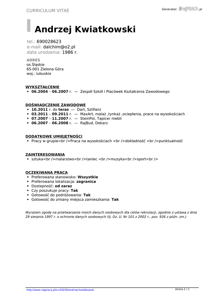 CURRICULUM VITAE Generator: I Andrzej Kwiatkowski tel.: 690028623 e-mail: [email protected] data urodzenia: 1986 r. ADRES os.Śląskie 65-001 Zielona Góra woj.: lubuskie WYKSZTAŁCENIE • 06.2004 – 06.2007 r. — Zespół Szkół i Placówek Kształcenia Zawodowego DOŚWIADCZENIE ZAWODOWE • 10.2011 r. do teraz — Dart, Szlifierz • 03.2011 – 09.2011 r. — MaxArt, malaż ,tynkaż ,ocieplenia, prace na wysokościach • 07.2007 – 11.2007 r. — SteinPol, Tapicer mebli • 06.2007 – 06.2008 r. — RajBud, Dekarz DODATKOWE UMIEJĘTNOŚCI • Pracy w grupie<br />Praca na wysokościach <br />dokładność <br />punktualność ZAINTERESOWANIA • sztuka<br />malarstwo<br />taniec <br />muzyka<br />sport<br /> OCZEKIWANA PRACA • Preferowana stanowisko: Wszystkie • Preferowana lokalizacja: zagranica • Dostepność: od zaraz • Czy poszukuje pracy: Tak • Gotowość do podróżowania: Tak • Gotowość do zmiany miejsca zamieszkania: Tak Wyrażam zgodę na przetwarzanie moich danych osobowych dla celów rekrutacji, zgodnie z ustawą z dnia 29 sierpnia 1997 r. o ochronie danych osobowych (tj. Dz. U. Nr 101 z 2002 r., poz. 926 z późn. zm.) http://www.najpraca.pl/cv/10230/andrzej-kwiatkowski strona 1 / 1 .pl