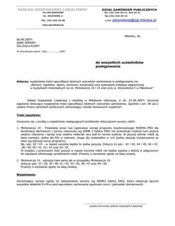 ZAKŁAD GOSPODARKI LOKALOWEJ 43-190 MIKOŁÓW UL. KOLEJOWA 2 TEL. (32) 324-26-00 DZIAŁ ZAMÓWIEŃ PUBLICZNYCH tel. (32) 324-26-11, 324-26 31 fax (32) 324-26-12 e-mail: [email protected] www.zgl.mikolow.pl Mikołów, dn. 06.06.2007r. ZNAK SPRAWY ZGL/DzZ/14/2007 Nr kancelaryjny pisma: ZGL/................./2007 do wszystkich uczestników postępowania dotyczy: wyjaśnienia treści specyfikacji istotnych warunków zamówienia w postępowaniu na: „Remont kapitalny dachu, wymiana konstrukcji oraz wykonanie instalacji odgromowej w budynkach mieszkalnych na os. Mickiewicza 10 i 14 oraz przy ul. Wyzwolenia 5 w Mikołowie” Zakład Gospodarki Lokalowej z siedzibą w Mikołowie informuje, iŜ dn. 01.06.2007r. otrzymał zapytanie dotyczące wyjaśnienia treści specyfikacji istotnych warunków zamówienia. Zgodnie z art. 38 ust.2 ustawy Prawo zamówień publicznych zamawiający udziela stosownych wyjaśnień. Treść zapytania: Zwracamy się z prośbą o wyjaśnienie następujących problemów dotyczących wyceny robót: 1. Mickiewicza 10 - Posiadana przez nas najnowsza wersja programu kosztorysowego NORMA PRO dla konstrukcji dachowych z tarcicy nasyconej wg KNNR 2 tablica 0402 nie przewiduje rozbicia tych pozycji osobno robocizna i sprzęt oraz osobno materiał, lecz jest to norma scalona. W pozycji obmiar robót są dwie wartości: jedna dla RiS w metrach, druga dla materiałów w rn3 (jedna pozycja kosztorysowa za dwie wg starszej wersji programu). Np. póz. 42 i 43 - w naszej wycenie będzie to jedna pozycja. Dotyczy to póz.: 42 i 42, 44 i 45, 46 i 47, ,48 i 49, 50 i 51, 52 i 53 oraz 54 i 55 W związku z powyŜszym ilość pozycji w naszej wycenie robót nie będzie zgodna z ilością w załączonym do zapytanie ofertowego przedmiarze robót. Prosimy o wyraŜenie zgody na taką zmianę. 2. Mickiewicza 14 - sytuacja taka sama jak w przypadku Mickiewicza 10. Dotyczy póz. 37 i 38, 39 i 40, 41 i 42, 43 i 45, 46 i 47 oraz 49 i 50. Prosimy o wyraŜanie zgody na taką zmianę. Wyjaśnienie: Zamawiający wyraŜa zgodę na zastosowanie wyceny wg KNNR2 tablica 0402, która obejmuje łącznie wszystkie składniki R+M+s pod warunkiem zachowania zgodności norm i jednostek obmiarowych. ....................................................................................... (podpis Kierownika Zakładu Gospodarki Lokalowej) ZAKŁAD GOSPODARKI LOKALOWEJ 43-190 MIKOŁÓW UL. KOLEJOWA 2 TEL. (32) 324-26-00 DZIAŁ ZAMÓWIEŃ PUBLICZNYCH tel. (32) 324-26-11, 324-26 31 fax (32) 324-26-12 e-mail: [email protected] www.zgl.mikolow.pl Mikołów, dn. 06.06.2007r. ZNAK SPRAWY ZGL/DzZ/14/2007 Nr kancelaryjny pisma: ZGL/................./2007 do wszystkich uczestników postępowania dotyczy: wyjaśnienia treści specyfikacji istotnych warunków zamówienia w postępowaniu na: „Remont kapitalny dachu, wymiana konstrukcji oraz wykonanie instalacji odgromowej w budynkach mieszkalnych na os. Mickiewicza 10 i 14 oraz przy ul. Wyzwolenia 5 w Mikołowie” Zakład Gospodarki Lokalowej z siedzibą w Mikołowie informuje, iŜ dn. 06.06.2007r. otrzymał zapytanie dotyczące wyjaśnienia treści specyfikacji istotnych warunków zamówienia. Zgodnie z art. 38 ust.2 ustawy Prawo zamówień publicznych zamawiający udziela stosownych wyjaśnień. Treść zapytania: Zwracamy się z prośbą o wyjaśnienie następujących problemów dotyczących wyceny robót : Budynek, Mikołów ul. Mickiewicza 10 - poz. 23 Budynek, Mikołów ul. Mickiewicza 14 - poz. 18 Przemurowanie kominów ponad połacią dachu z cegły klinkierowej na zaprawie ATLAS - przyjęty w przedmiarze katalog KNR 4-01 03 10-02 przewiduje przemurowanie kominów przy uŜyciu zwykłej zaprawy. W związku z załoŜeniem murowania na zaprawie ATLAS prosimy o podanie normy zuŜycia tej zaprawy na przemurowanie 1 m3 kominów. Budynek, Mikołów ul. Wyzwolenia 5 - poz. 26 Przemurowanie kominów ponad połacią dachu z cegły klinkierowej na zaprawie TERCA – przyjęty w przedmiarze katalog KNR 4-01 0310-02 przewiduje przemurowanie kominów przy uŜyciu zwykłej zaprawy. W związku z załoŜeniem murowania na zaprawie TERCA prosimy o podanie normy zuŜycia tej zaprawy na przemurowanie 1 m3 kominów. Wyjaśnienie: W obydwu przypadkach naleŜy przyjąć normę zuŜycia na 1m3 muru = 280 kg. ....................................................................................... (podpis Kierownika Zakładu Gospodarki Lokalowej)