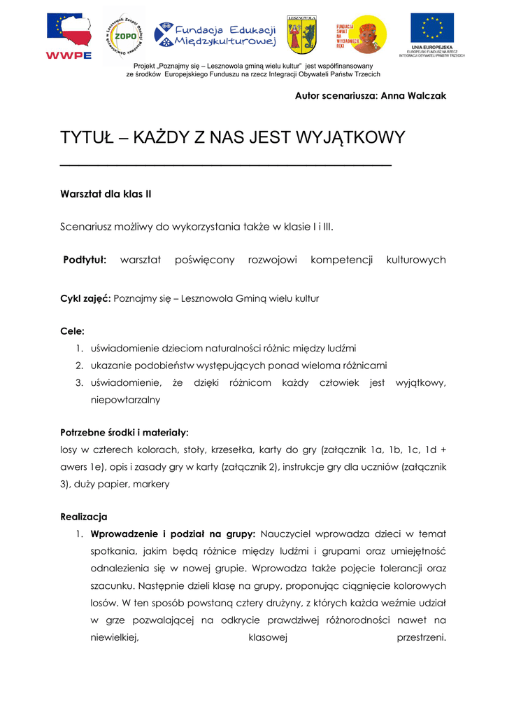 Projekt „Poznajmy się – Lesznowola gminą wielu kultur” jest współfinansowany ze środków Europejskiego Funduszu na rzecz Integracji Obywateli Państw Trzecich Autor scenariusza: Anna Walczak TYTUŁ – KAŻDY Z NAS JEST WYJĄTKOWY ___________________________________ Warsztat dla klas II Scenariusz możliwy do wykorzystania także w klasie I i III. Podtytuł: warsztat poświęcony rozwojowi kompetencji kulturowych Cykl zajęć: Poznajmy się – Lesznowola Gminą wielu kultur Cele: 1. uświadomienie dzieciom naturalności różnic między ludźmi 2. ukazanie podobieństw występujących ponad wieloma różnicami 3. uświadomienie, że dzięki różnicom każdy człowiek jest wyjątkowy, niepowtarzalny Potrzebne środki i materiały: losy w czterech kolorach, stoły, krzesełka, karty do gry (załącznik 1a, 1b, 1c, 1d + awers 1e), opis i zasady gry w karty (załącznik 2), instrukcje gry dla uczniów (załącznik 3), duży papier, markery Realizacja 1. Wprowadzenie i podział na grupy: Nauczyciel wprowadza dzieci w temat spotkania, jakim będą różnice między ludźmi i grupami oraz umiejętność odnalezienia się w nowej grupie. Wprowadza także pojęcie tolerancji oraz szacunku. Następnie dzieli klasę na grupy, proponując ciągnięcie kolorowych losów. W ten sposób powstaną cztery drużyny, z których każda weźmie udział w grze pozwalającej na odkrycie prawdziwej różnorodności nawet na niewielkiej, klasowej przestrzeni. Projekt „Poznajmy się – Lesznowola gminą wielu kultur” jest współfinansowany ze środków Europejskiego Funduszu na rzecz Integracji Obywateli Państw Trzecich 2. Karciany zawrót głowy: Nauczyciel zaprasza uczestników do nietuzinkowej gry w karty (opis i zasady gry w załączniku 2). Rozdaje grupom talie kart (załącznik 1) oraz instrukcje (załącznik 3). To karciane doświadczenie zamknie rozmowa podsumowująca (pytania do rozmowy również znajdują się w załączniku 2), która będzie wstępem do klasowej burzy mózgów i dalszych wniosków. Aby w pełni wykorzystać potencjał gry dobrze jest przeprowadzić III rundy. 3. Wyjątkowa układanka: Nauczyciel poprosi grupę, by po zakończonej grze odwróciła swoje karty i zgodnie z numerkami widniejącymi na każdej z nich ułożyła obrazek. Będą się na niego składać wszystkie 4 talie, więc potrzebna jest współpraca wszystkich 4 drużyn dla pełnego wykonania tego zadania. Obrazek przedstawia świat z zarysem kontynentów. Nauczyciel podsumuje krótko wcześniejszą rozmowę i nawiązuje do obrazka mówiąc, że tak, jak różniły się zasady gry dla każdej z drużyn, tak i my – mieszkańcy świata różnimy się między sobą. Różnią się mieszkańcy kontynentów, które widnieją na obrazku; mieszkańcy miast i miasteczek, uczniowie szkół i poszczególne klasy; ale też różnią się między sobą indywidualni uczniowie. Wszyscy jesteśmy różni. Każdy z nas jest wyjątkowy – jak głosi napis na naszym karcianym obrazku. 4. Podsumowanie: Nauczyciel przypomina, że na początku lekcji omówione zostały takie pojęcia, jak tolerancja i szacunek oraz pyta, dlaczego są one ważne oraz co zrobić, by odnaleźć się w nowej, zróżnicowanej grupie. Warto też zastanowić się wspólnie, co może zrobić grupa, by nowa osoba dobrze się w niej poczuła i miała szansę poczuć się jej członkiem. Odpowiedzi dzieci warto zapisać na dużym papierze tak, aby mogły pozostać w sali widoczne, na co dzień dla wszystkich uczniów. Projekt „Poznajmy się – Lesznowola gminą wielu kultur” jest współfinansowany ze środków Europejskiego Funduszu na rzecz Integracji Obywateli Państw Trzecich Załącznik 2 Karty: W talii powinny znajdować się 24 karty. Po jednej stronie każda z kart jest elementem układanki, na której widnieje napis Wszyscy jesteśmy różni. Każdy z nas jest wyjątkowy. Każdy z elementów powinien posiadać numer ułatwiający złożenie 4taliowej układanki w jedną całość. Do właściwej gry służy jednak druga strona kart. Na każdej z nich widnieje zarys postaci, która ma na głowie inne nakrycie głowy (beret, pióropusz, cylinder, sombrero, kapelusz kowboja, turban). Nakrycia są kolorowe, jednak zarys dziecka jest pokolorowany jednolicie na żółto, pomarańczowo, zielono lub niebiesko. W ten sposób talia zawiera dokładnie: - 4 karty z beretem (1 żółta, 1 pomarańczowa, 1 zielona, 1 niebieska) - 4 karty z pióropuszem (1 żółta, 1 pomarańczowa, 1 zielona, 1 niebieska) - 4 karty z cylindrem (1 żółta, 1 pomarańczowa, 1 zielona, 1 niebieska) - 4 karty z sombrero (1 żółta, 1 pomarańczowa, 1 zielona, 1 niebieska) - 4 karty z kapeluszem kowboja (1 żółta, 1 pomarańczowa, 1 zielona, 1 niebieska) - 4 karty z turbanem (1 żółta, 1 pomarańczowa, 1 zielona, 1 niebieska) Do gry potrzebne będą 4 talie kart – po jednej dla każdej z grup. Zasady: Każda z grup dostanie inne zasady gry. Celem zabawy jest ukazanie świata różnic i wprowadzenie do rozmowy o różnicach między ludźmi oraz o wyjątkowości każdego z nas. Opiera się ona na metodzie kolby -doświadczeniu, refleksji i wyciągnięciu wniosków (podział gry zgodnie z metodą poniżej w „etapach gry – podsumowaniu”). Przebieg gry: 1. Nauczyciel wręcza każdej z 4 grup dostaje talię kart. Dzieci tasują je i rozdają między graczy. 2. Gra polega na pozbyciu się wszystkich kart w jak najkrótszym czasie. Warto jednak nałożyć limit czasu na etap przygotowania oraz każdą z rund, aby zabawa przebiegała sprawnie. 3. Każda z grup powinna zdecydować, od kogo zacznie. Projekt „Poznajmy się – Lesznowola gminą wielu kultur” jest współfinansowany ze środków Europejskiego Funduszu na rzecz Integracji Obywateli Państw Trzecich 4. Każdy z uczestników po kolei kładzie na środku stołu jedną z kart. Robi to zgodnie z wręczonymi grupie zasadami. I GRUPA INSTRUKCJA GRY: - kładziemy karty zgodnie z kolorem i nakryciem głowy
