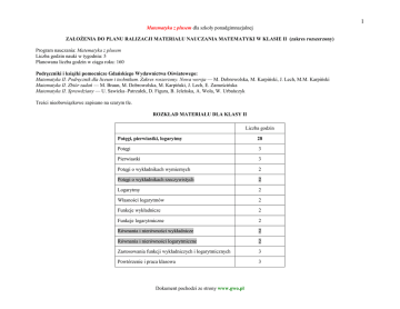1 Matematyka z plusem dla szkoły ponadgimnazjalnej ZAŁOŻENIA DO PLANU RALIZACJI MATERIAŁU NAUCZANIA MATEMATYKI W KLASIE II (zakres rozszerzony) Program nauczania: Matematyka z plusem Liczba godzin nauki w tygodniu: 5 Planowana liczba godzin w ciągu roku: 160 Podręczniki i książki pomocnicze Gdańskiego Wydawnictwa Oświatowego: Matematyka II. Podręcznik dla liceum i technikum. Zakres roszerzony. Nowa wersja — M. Dobrowolska, M. Karpiński, J. Lech, M.M. Karpiński Matematyka II. Zbiór zadań — M. Braun, M. Dobrowolska, M. Karpiński, J. Lech, E. Zamościńska Matematyka II. Sprawdziany — U. Sawicka–Patrzałek, D. Figura, B. Jeleńska, A. Wola, W. Urbańczyk Treści nieobowiązkowe zapisano na szarym tle. ROZKŁAD MATERIAŁU DLA KLASY II Liczba godzin Potęgi, pierwiastki, logarytmy 28 Potęgi 3 Pierwiastki 3 Potęgi o wykładnikach wymiernych 2 Potęgi o wykładnikach rzeczywistych 2 Logarytmy 2 Własności logarytmów 2 Funkcje wykładnicze 2 Funkcje logarytmiczne 2 Równania i nierówności wykładnicze 2 Równania i nierówności logarytmiczne 2 Zastosowania funkcji wykładniczych i logarytmicznych 3 Powtórzenie i praca klasowa 3 Dokument pochodzi ze strony www.gwo.pl 2 Matematyka z plusem dla szkoły ponadgimnazjalnej Wielomiany 23 Przykłady wielomianów 2 Rozkład wielomianu na czynniki 2 Równania wielomianowe 3 Dzielenie wielomianów 2 Twierdzenie Bezout 1 Równania wielomianowe (cd.) 2 Rozwiązania wymierne równań wielomianowych 2 Nierówności wielomianowe 2 Funkcje wielomianowe 2 Nierówności wielomianowe (cd.) 2 Powtórzenie i praca klasowa 3 Figury i przekształcenia 24 Przekształcenia geometryczne. Symetrie 2 Przesunięcie 2 Działania na wektorach 2 Przekształcenia w układzie współrzędnych 2 Równanie prostej 3 Długość odcinka. Równanie okręgu. 3 Proste i okręgi 3 Wektory w układzie współrzędnych 2 Działania na wektorach (cd.) 2 Powtórzenie i praca klasowa 3 Dokument pochodzi ze strony www.gwo.pl 3 Matematyka z plusem dla szkoły ponadgimnazjalnej Trygonometria 38 Funkcje trygonometryczne kąta ostrego 1 Kąty o miarach dodatnich i ujemnych 1 Funkcje trygonometryczne dowolnego kąta 3 Podstawowe związki między funkcjami trygonometrycznymi 2 Wykres funkcji y=sin α 3 Wykres funkcji y=cos α 3 Wykresy funkcji y=tg α 3 Miara łukowa kąta 2 Funkcje trygonometryczne zmiennej rzeczywistej 2 Powtórzenie i praca klasowa 3 Funkcje y=asinx, y=sinax … 2 Przekształcanie wykresów funkcji 2 Równania trygonometryczne 4 Sinus i cosinus sumy i różnicy kątów 2 Suma i różnica sinusów i cosinusów kątów 2 Powtórzenie i sprawdzian 3 Ciągi 20 Przykłady ciągów 2 Ciągi arytmetyczne 3 Ciągi geometryczne 3 Procent składany 3 Dokument pochodzi ze strony www.gwo.pl 4 Matematyka z plusem dla szkoły ponadgimnazjalnej Granice ciągów 2 Obliczanie granic 2 Szeregi geometryczne 2 Powtórzenie i praca klasowa 3 Figury podobne 12 Wielokąty podobne 2 Jednokładność 2 Cechy podobieństwa trójkątów. Twierdzenie Talesa 3 Pola figur podobnych 2 Powtórzenie i praca klasowa 3 Statystyka 10 Przybliżenia 1 Średnia arytmetyczna, mediana, dominanta 2 Średnia ważona 2 Odchylenie standardowe 2 Powtórzenie i praca klasowa 3 RAZEM W CIĄGU ROKU 155 Dokument pochodzi ze strony www.gwo.pl 5 Matematyka z plusem dla szkoły ponadgimnazjalnej PLAN REALIZACJI MATERIAŁU NAUCZANIA MATEMATYKI W KLASIE II WRAZ Z PLANEM WYNIKOWYM (ZAKRES ROZSZERZONY) JEDNOSTKA LEKCYJNA DZIAŁ PROGRAMOWY Kategorie celów nauczania: A — zapamiętanie wiadomości B — rozumienie wiadomości C — stosowanie wiadomości w sytuacjach typowych D — stosowanie wiadomości w sytuacjach problemowych 1 Potęgi, pierwiastki, logarytmy 28 h 2–4 Poziomy wymagań edukacyjnych: K — konieczny — ocena dopuszczająca (2) P— podstawowy — ocena dostateczna (3) R — rozszerzający — ocena dobra (4) D — dopełniający — ocena bardzo dobra (5) W — wykraczający — ocena celująca (6) CELE KSZTAŁCENIA W UJĘCIU OPERACYJNYM WRAZ Z OKREŚLENIEM WYMAGAŃ JEDNOSTKA TEMATYCZNA podstawowe KATEGORIA A Uczeń zna: ponadpodstawowe KATEGORIA B Uczeń rozumie: KATEGORIA C Uczeń potrafi: KATEGORIA D Uczeń potrafi: Lekcja organizacyjna. Potęgi. • definicję potęgi o wykładniku naturalnym i całkowitym ujemnym (K) • pojęcie notacji wykładniczej (P) • prawa działań na potęgach (K) • potrzebę stosowania notacji wykładniczej w praktyce (P) • obliczać potęgi o wykładnikach naturalnych i całkowitych ujemnych (K–P) • zapisywać liczby w postaci potęg (P) • zapisywać liczby w postaci iloczynu potęg (P) • zapisywać liczby w notacji wykładniczej (P) • mnożyć i dzielić potęgi o jednakowych podstawach (K) • mnożyć i dzielić potęgi o jednakowych wykładnikach (K) • przedstawiać potęgi w postaci iloczynu i ilorazu potęg o jednakowych podstawach (P) • przedstawiać potęgi w postaci iloczynu i ilorazu potęg o jednakowych wykładnikach (P) • potęgować potęgi (K) • przedstawiać potęgi jako potęgi potęg (P) • porównywać potęgi (P-R) Dokument pochodzi ze strony www.gwo.pl • rozwiązywać nietypowe zadania z zastosowaniem działań na potęgach (D–W) • porównywać ilorazowo i różnicowo liczby podane w notacji wykładniczej (R) 6 Matematyka z plusem dla szkoły ponadgimnazjalnej 5–7 Pierwiastki. • definicję pierwiastka arytmetycznego n–tego stopnia (n∈N i n > 1) (K) • prawa działań na pierwiastkach; w tym wzór na obliczanie pierwiastka n– tego stopnia z n–tej potęgi oraz wzór na obliczanie n– tej potęgi pierwiastka n– tego stopnia (K) • definicję pierwiastka arytmetycznego n–tego stopnia (n∈N i n > 1) (K) • jak oblicza się pierwiastek n–tego stopnia z n–tej potęgi oraz jak oblicza się n–tą potęgę pierwiastka n–tego stopnia z liczby nieujemnej (K) 8–9 Potęgi o wykładnikach wymiernych. • definicję potęgi o wykładniku wymiernym (K) • prawa działań na potęgach o