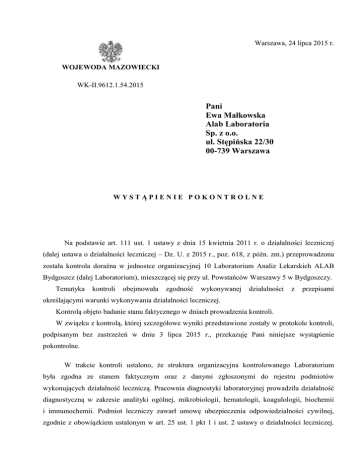 Warszawa, 24 lipca 2015 r. WOJEWODA MAZOWIECKI WK-II.9612.1.54.2015 Pani Ewa Małkowska Alab Laboratoria Sp. z o.o. ul. Stępińska 22/30 00-739 Warszawa WYSTĄPIENIE POKONTROLNE Na podstawie art. 111 ust. 1 ustawy z dnia 15 kwietnia 2011 r. o działalności leczniczej (dalej ustawa o działalności leczniczej – Dz. U. z 2015 r., poz. 618, z późn. zm.) przeprowadzona została kontrola doraźna w jednostce organizacyjnej 10 Laboratorium Analiz Lekarskich ALAB Bydgoszcz (dalej Laboratorium), mieszczącej się przy ul. Powstańców Warszawy 5 w Bydgoszczy. Tematyka kontroli obejmowała zgodność wykonywanej działalności z przepisami określającymi warunki wykonywania działalności leczniczej. Kontrolą objęto badanie stanu faktycznego w dniach prowadzenia kontroli. W związku z kontrolą, której szczegółowe wyniki przedstawione zostały w protokole kontroli, podpisanym bez zastrzeżeń w dniu 3 lipca 2015 r., przekazuję Pani niniejsze wystąpienie pokontrolne. W trakcie kontroli ustalono, że struktura organizacyjna kontrolowanego Laboratorium była zgodna ze stanem faktycznym oraz z danymi zgłoszonymi do rejestru podmiotów wykonujących działalność leczniczą. Pracownia diagnostyki laboratoryjnej prowadziła działalność diagnostyczną w zakresie analityki ogólnej, mikrobiologii, hematologii, koagulologii, biochemii i immunochemii. Podmiot leczniczy zawarł umowę ubezpieczenia odpowiedzialności cywilnej, zgodnie z obowiązkiem ustalonym w art. 25 ust. 1 pkt 1 i ust. 2 ustawy o działalności leczniczej. Pomieszczenia placówki spełniały wymagania określone dla laboratorium w rozporządzeniu Ministra Zdrowia z dnia 3 marca 2004 r. w sprawie wymagań, jakim powinno odpowiadać medyczne laboratorium diagnostyczne (dalej rozporządzenie w sprawie wymagań, jakim powinno odpowiadać medyczne laboratorium diagnostyczne – Dz. U. z 2004 r. Nr 43, poz. 408, z późn. zm.). Kierownik Laboratorium spełniał kryteria określone w § 6 ww. rozporządzenia – posiadał tytuł specjalisty w dziedzinie diagnostyki laboratoryjnej. W kontrolowanej placówce badania diagnostyczne wykonywane były przez 30 pracowników laboratoryjnych, w tym 17 posiadających tytuł diagnosty laboratoryjnego oraz co najmniej 3-letni staż pracy. Dwóch diagnostów laboratoryjnych dysponowało tytułem specjalisty w dziedzinie diagnostyki laboratoryjnej, w tym jeden jednocześnie posiadał I0 specjalizacji z analityki klinicznej. Ponadto 1 diagnosta dysonował tytułem specjalisty w dziedzinie mikrobiologii i 1 ukończył specjalizację I0 z analityki klinicznej. Siedmiu pracowników posiadało tytuł zawodowy technika analityki medycznej, w tym jeden zatrudniony był na stanowisku kierownika zespołu techników, a pozostali na stanowisku technika analityki medycznej. Czterej pracownicy posiadający tytuł zawodowy technika chemika zatrudnieni byli na stanowisku technika chemii. Ponadto 1 osoba dysponowała tytułem technika farmacji i była zatrudniona na stanowisku technika farmacji. W punkcie pobrań materiał do badań pobierany był przez pielęgniarkę. W dokumentacji Laboratorium zgromadzono dokumenty potwierdzające prawo wykonywania zawodu aktualnie zatrudnionych diagnostów laboratoryjnych oraz pielęgniarki. Podmiot dysponował dokumentacją potwierdzającą sprawność techniczną aparatury pomiarowo-badawczej: analizatorów immunochemicznych (3), koagulologicznych (2), biochemicznych (2), hematologicznych (2), parametrów krytycznych (2), mikrobiologicznych (2), analizatora immunoserologicznego, do elektroforezy białek, pasków do moczu, aparatu do oznaczania OB, stacji roboczej do analizy pasożytów w kale, podajnika próbek, oraz sprzętu pomocniczego wykorzystywanego przy udzielaniu świadczeń medycznych: mikroskopów, wirówek, pipet automatycznych, termometrów elektronicznych, zamrażarek, chłodziarkozamrażarek, lodówek, stacji uzdatniania wody oraz cytowirówki, cieplarki i termohigrometru, do której posiadania i okazania organowi kontroli podmiot jest zobowiązany na podstawie § 5 ust. 4 rozporządzenia w sprawie wymagań, jakim powinno odpowiadać medyczne laboratorium diagnostyczne oraz art. 90 ust. 6, 7 i 9 ustawy z dnia 20 maja 2010 r. o wyrobach medycznych (Dz. U. z 2015 r., poz. 876). 2 Podsumowując powyższe ustalenia pragnę poinformować Panią, że w zakresie stanowiącym przedmiot kontroli nie stwierdzono nieprawidłowości. z up. WOJEWODY MAZOWICKIEGO Edyta Ostrowska Dyrektor Wydziału Kontroli 3