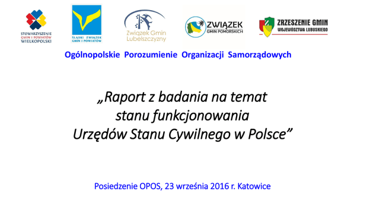 Ogólnopolskie Porozumienie Organizacji Samorządowych „Raport z badania na temat stanu funkcjonowania Urzędów Stanu Cywilnego w Polsce” Posiedzenie OPOS, 23 września 2016 r. Katowice Ogólnopolskie Porozumienie Organizacji Samorządowych Obszar badawczy: - 5 województw w ramach OPOS: lubelskie, lubuskie, pomorskie, śląskie, wielkopolskie - badanie objęło 31,8 % powierzchni kraju, - forma badania: badanie ankietowe (kwestionariusz ankietowy – 45 pytań) - grupa docelowa – 750 urzędu stanów cywilnego (na 2 257 funkcjonujących w Polsce) - udział w badaniu – zwrot 482 ankiet uwzględnionych do obliczeń (64 % badanej próby, 21% populacji ogólnopolskiej) Ogólnopolskie Porozumienie Organizacji Samorządowych Główny cel badania: Zdiagnozowanie aktualnej sytuacji USC w 3 wymiarach: - organizacyjny, - kadrowy, - finansowy, Po wdrożeniu nowych przepisów Ustawy Prawo o aktach stanu cywilnego, obowiązujących od 1 marca 2015 r. Efekt funkcjonowania nowych przepisów: - zmiana sposobu realizacji zadań, - zwiększenie ilości realizowanych zadań, - pełna informatyzacja USC, - zmiana sposobu obsługi klientów. Ogólnopolskie Porozumienie Organizacji Samorządowych Wnioski – w zakresie kadrowym: ● weryfikacja podziału ilości zadań wykonywanych przez osoby z USC w gm. wiejskich ● weryfikacja zasadności prowadzenia funkcji kierownika usc przez organ gminy ● weryfikacja stanu zatrudnienia w usc, będących w gminach miejskich ● zwiększenie działań dotyczących podnoszenia kwalifikacji zawodowych pracowników usc Ogólnopolskie Porozumienie Organizacji Samorządowych Wnioski – w zakresie organizacyjnym: ● ● ● weryfikacja stanu wyposażenia pomieszczeń biurowych oraz sal ślubów weryfikacja stanu infrastruktury teleinformatycznej weryfikacja elektronicznego obiegu dokumentów – podpis elektroniczny - w 91,5 % badanych USC stosowany jest tradycyjna (papierowa) forma obiegu dokumentów, - w 31 % badanych gmin nie ma dedykowanej sali ślubów, - w 81 % USC sala ślubów przechodziła ostatni remont do 2000 roku - konieczność doposażenia stanowisk pracy w łączność internetową Ogólnopolskie Porozumienie Organizacji Samorządowych Wnioski – w zakresie finansowym: ● ● ● ● ● ● ● ● 280 gmin (59%)w okresie od stycznia 2013 go grudnia 2015 przeprowadzało inwestycje w USC, (infrastruktury teleinformatycznej, remontów pomieszczeń biurowych, wymiany sprzętu biurowego) realizowane inwestycje w 74 % finansowane były w całości z dochodów własnych gminy, pełne pokrycie kosztów z dotacji celowych nastąpiło w 12,5% przypadków. potrzebne są nowe inwestycje (remonty, doposażenie stanowisk pracy, zwiększenie zatrudnienia) katalog zadań nie uwzględnia wszystkich zadań i czynności realizowanych przez USC, oraz nie uwzględnia kosztów inwestycji kwota roboczogodziny (24,16 zł) nie odpowiada rzeczywistym kosztom funkcjonowania usc ( około 35 zł) średnia wysokość dotacji celowej na zadania zlecone w 2015 roku wynosiła 21 zł za 1 roboczogodzinę, w 2015 r. gminy dopłaciły do zadań wykonywanych przez usc średnią kwotę 23 273 213 zł (na wszystkie 2.257 USC w Polsce) Ogólnopolskie Porozumienie Organizacji Samorządowych Propozycje dalszych działań w zakresie USC: 1) Dystrybucja Raportu poprzez Organizacje Regionalne: - wszystkie USC w danym regionie, Instytucja Wojewody, Parlamentarzyści, …. publikacja Raportu na stronie www Organizacji Regionalnej, media. Ogólnopolskie Porozumienie Organizacji Samorządowych Propozycje dalszych działań w zakresie USC: 2) Ustalenie składu delegacji przedstawicieli OPOS do reprezentowania Raportu: - Reprezentacja - Lubuskie: … Reprezentacja - Lubelskie: …. Reprezentacja - Pomorskie: …. Reprezentacja – Śląskie: … Reprezentacja – Wielkopolskie: … Ogólnopolskie Porozumienie Organizacji Samorządowych Propozycje dalszych działań w zakresie USC: 3). Ustalenie grup docelowych - odbiorców prezentacji/ terminów / miejsc/ : - Ministerstwa : wspólne spotkanie OPOS, MSWiA, MC i MF w celu podjęcia wspólnych działań na rzecz opracowania nowych rozwiązań prawnych, organizacyjnych i finansowych (2 połowa października 2016). - Strona Samorządowa i Rządowa: prezentacja raportu na posiedzeniu KWRiST (termin? delegacja?) - Parlamentarzyści: prezentacja wyników raportu Komisjom parlamentarnym (Sejm, Senat) (termin? delegacja?) - Środowisko naukowe; Kierownicy USC : publikacja raportu w czasopiśmie „Metryka”, - nawiązanie współpracy z NIST w ramach dalszych analiz oraz opracowywania koncepcji zmian prawnych, organizacyjnych i informatycznych dotyczących USC. Dziękuję za uwagę. Sławomir Wojciechowski Kierownik USC w Nowej Soli