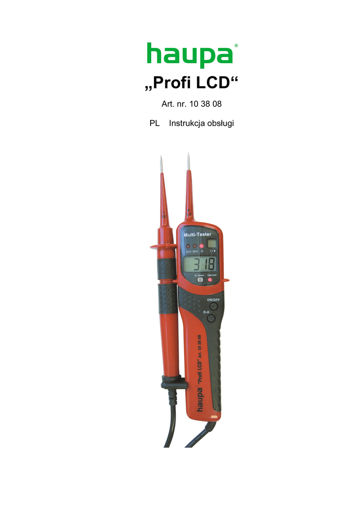 „Profi LCD“ Art. nr. 10 38 08 PL Instrukcja obsługi Dwubiegunowy wskaźnik napięcia Bardzo dziękujemy, że zdecydowali się Państwo na zakup dwubiegunowego wskaźnika napięcia haupa „Profi LCD” z wyświetlaczem ciekłokrystalicznym. Służy on do badania napięcia prądu stałego i zmiennego w zakresie od 12 do 690 V, polaryzacji, kierunku wirowania pola i przepływów do 2 kΩ oraz testów FI/RCD. Dzięki wysokiemu rodzajowi ochrony (IP65) haupa „Profi LCD” może być używany także w trudnych warunkach. Zalecenia odnośnie bezpieczeństwa Zdecydowali się Państwo na urządzenie gwarantujące wysoki stopień bezpieczeństwa. Odpowiada ono normom DIN VDE 0682-401, IEC/EN 61243-3. Aby zapewnić bezpieczne i właściwe użytkowanie konieczne jest, aby przed pierwszym użyciem dokładnie zapoznać się z niniejszą instrukcją obsługi. Należy przestrzegać poniższych wskazań odnośnie bezpieczeństwa: • • • • Na krótko przed użyciem sprawdzić, czy wskaźnik napięcia działa (wytyczna VDE 0105, część 1). Należy to zrobić na jakimś znanym źródle napięcia, np. gniazdku 230 V. Jeśli nie działa wskazanie jednej lub kilku funkcji, urządzenia nie należy używać i zlecić jego sprawdzenie fachowcowi. Urządzenie chwytać tylko za rączki, unikać dotykania końcówek kontrolnych! Badanie braku napięcia przeprowadzać wyłącznie na dwóch biegunach! o o Bezbłędny odczyt zagwarantowany jest jedynie w zakresie temperatur od -10 C do +50 C. Urządzenie musi być zawsze suche i czyste. Obudowę można czyścić za pomocą wilgotnej szmatki. końcówki kontrolne wyświetlacz ciekłokrystaliczny czujnik podświetlenia zestyk palcowy (na tylnej ściance) przycisk wł./wył. przycisk Data Hold (zapis danych) Uwagi ogólne Napięcia mają pierwszeństwo. Jeśli na końcówkach pomiarowych brak jest napięcia (< 3,0V), to znaczy, że urządzenie jest w trybie badania przepływu. 1.) Działanie Aby włączyć lub wyłączyć urządzenie należy nacisnąć przycisk „ON/OFF” (patrz rysunek). Po około 7 minutach urządzenie wyłącza się automatycznie dzięki funkcji „Auto Power Off”. 2.) Test funkcjonowania W celu przeprowadzenia testu przytknąć do siebie obie końcówki kontrolne. Brzęczyk powinien wydać wyraźny dźwięk, a na wyświetlaczu powinny pojawić się „000”. Jeśli wyświetlacz nic nie pokaże lub znaki będą słabo widoczne, należy wymienić baterie. 3.) Badanie napięcia stałego Gdy przyłożymy końcówki wskaźnika do napięcia stałego w zakresie napięcia znamionowego na wyświetlaczu pokaże się napięcie w woltach i dodatkowo zapali się dioda „DCV”. Jeśli na końcówce kontrolnej „L1” mamy napięcie ujemne, to przed wartością pokaże się znak „-„ (minus). 4.) Badanie napięcia zmiennego Gdy przyłożymy końcówki do napięcia zmiennego w zakresie napięcia znamionowego na wyświetlaczu pokaże się napięcie w woltach i dodatkowo zapali się dioda „ACV”. 5.) Funkcja Data Hold Poprzez uruchomienie przycisku „Data Hold” (zapis danych) możliwe jest zapisanie wartości na wyświetlaczu. Funkcja „Data Hold” jest wskazywana za pomocą czerwonej diody na polu wyświetlacza i może zostać wyłączona przez ponowne naciśnięcie tego samego przycisku. 6.) Badanie faz Jedną końcówkę kontrolną przyłożyć do przewodu i równocześnie dotknąć zestyk palcowy umieszczony po drugiej stronie urządzenia. Jeśli wystąpi faza, minimum 100V~, to na małym wyświetlaczu pojawi się „L1”. 7.) Badanie pola wirowania Według pkt. 6 określić przewód fazowy. Następnie przyłożyć dwa przewody fazowe do końcówek kontrolnych i dotknąć zestyku palcowego. Jeśli faza na końcówce L2 następuje po fazie na końcówce L1, to mamy prawoskrętne położenie faz. Na małym wyświetlaczu pojawia się „L1”. Jeśli taki przypadek nie występuje, to mamy pole lewoskrętne. Wskazanie napięcia powinno wynosić ok. 400V. Jeśli w małym okienku wyświetlacza pojawi się „L1” i wyświetlone jest 230V, to mamy do czynienia z przewodem jednofazowym. 8.) Badanie przepływu Przyłożyć końcówki kontrolne do badanego przewodu, bezpiecznika itp. W przypadku oporności 0…2 kΩ wartość oporu pojawi się na wyświetlaczu i da się słyszeć sygnał dźwiękowy. Jeśli wartość pomiaru jest > 2kΩ, na wyświetlaczu pojawi się wskazanie nadmiaru „1”. 9.) Test mechanizmu wyłączającego FI/RCD, PE (test przewodu zerowego) Haupa „Profi LCD” posiada automatyczne obciążenie, które umożliwia badanie wyłącznika ochronnego FI/RCD bez jego rozłączania. W tym celu należy najpierw przeprowadzić test pomiędzy L (przewód fazowy) i N (przewód zerowy) (ok. 5 s). Bezpośrednio po tym można skontrolować L w stosunku do PE (przewód ochronny). Wskazane zostanie napięcie sieciowe. Jeśli postąpimy inaczej, wyłącznik ochronny FI/RCD zostanie rozłączony (maks. 30mA). 10.) Podświetlenie Podczas pracy przy słabym świetle otoczenia, czujnik podświetlenia (back light sensor) przełącza się na pracę z automatycznym oświetleniem, aby zapewnić właściwe odczytanie wartości pomiarowych także przy całkowitej ciemności. 11.) Wymiana baterii W celu wymiany baterii należy odkręcić śrubkę znajdującą się na dole obudowy, aby móc wysunąć do dołu pokrywkę przegródki na baterie. Podczas wymiany baterii zwrócić uwagę na właściwą polaryzację. Uwaga: baterii nie wyrzucać do kosza na śmieci. Również w pobliżu Państwa domu znajduje się pojemnik na zużyte baterie! 12.) 36 miesięcy gwarancji Urządzenia firmy haupa poddawane są surowej kontroli jakościowej. Jeśli jednak podczas codziennego użytkowania wystąpią usterki w funkcjonowaniu, udzielamy 36-miesięcznej gwarancji (ważna tylko z rachunkiem). Wady fabryczne lub materiałowe zostaną usunięte przez nas bezpłatnie, o ile urządzenie zostanie odesłane do nas bez śladów ingerencji i nie otwarte. Uszkodzen