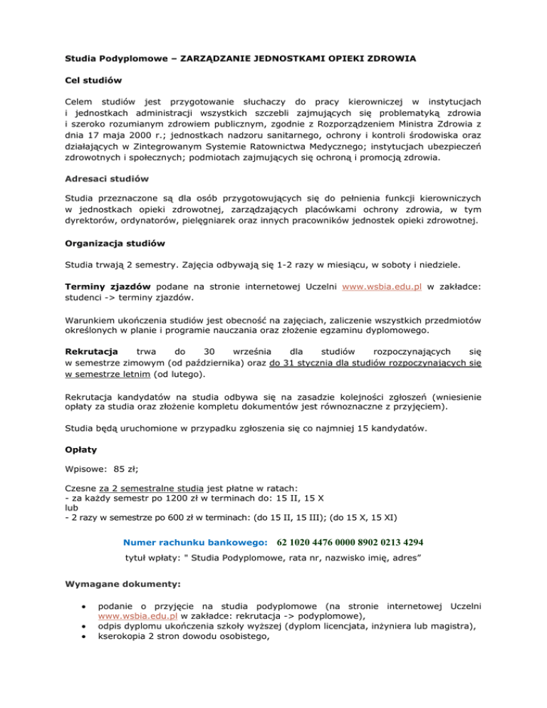 Studia Podyplomowe – ZARZĄDZANIE JEDNOSTKAMI OPIEKI ZDROWIA Cel studiów Celem studiów jest przygotowanie słuchaczy do pracy kierowniczej w instytucjach i jednostkach administracji wszystkich szczebli zajmujących się problematyką zdrowia i szeroko rozumianym zdrowiem publicznym, zgodnie z Rozporządzeniem Ministra Zdrowia z dnia 17 maja 2000 r.; jednostkach nadzoru sanitarnego, ochrony i kontroli środowiska oraz działających w Zintegrowanym Systemie Ratownictwa Medycznego; instytucjach ubezpieczeń zdrowotnych i społecznych; podmiotach zajmujących się ochroną i promocją zdrowia. Adresaci studiów Studia przeznaczone są dla osób przygotowujących się do pełnienia funkcji kierowniczych w jednostkach opieki zdrowotnej, zarządzających placówkami ochrony zdrowia, w tym dyrektorów, ordynatorów, pielęgniarek oraz innych pracowników jednostek opieki zdrowotnej. Organizacja studiów Studia trwają 2 semestry. Zajęcia odbywają się 1-2 razy w miesiącu, w soboty i niedziele. Terminy zjazdów podane na stronie internetowej Uczelni www.wsbia.edu.pl w zakładce: studenci -> terminy zjazdów. Warunkiem ukończenia studiów jest obecność na zajęciach, zaliczenie wszystkich przedmiotów określonych w planie i programie nauczania oraz złożenie egzaminu dyplomowego. Rekrutacja trwa do 30 września dla studiów rozpoczynających się w semestrze zimowym (od października) oraz do 31 stycznia dla studiów rozpoczynających się w semestrze letnim (od lutego). Rekrutacja kandydatów na studia odbywa się na zasadzie kolejności zgłoszeń (wniesienie opłaty za studia oraz złożenie kompletu dokumentów jest równoznaczne z przyjęciem). Studia będą uruchomione w przypadku zgłoszenia się co najmniej 15 kandydatów. Opłaty Wpisowe: 85 zł; Czesne za 2 semestralne studia jest płatne w ratach: - za każdy semestr po 1200 zł w terminach do: 15 II, 15 X lub - 2 razy w semestrze po 600 zł w terminach: (do 15 II, 15 III); (do 15 X, 15 XI) Numer rachunku bankowego: 62 1020 4476 0000 8902 0213 4294 tytuł wpłaty: " Studia Podyplomowe, rata nr, nazwisko imię, adres” Wymagane dokumenty: podanie o przyjęcie na studia podyplomowe (na stronie internetowej Uczelni www.wsbia.edu.pl w zakładce: rekrutacja -> podyplomowe), odpis dyplomu ukończenia szkoły wyższej (dyplom licencjata, inżyniera lub magistra), kserokopia 2 stron dowodu osobistego, dowód wpłaty wpisowego, oświadczenie o zapoznaniu się z Regulaminem Studiów WSBiA (Regulamin znajduje się na stronie www.wsbia.edu.pl w zakładce: uczelnia -> akty prawne), 3 fotografie o wymiarach 37x52 mm. Program studiów STUDIA PODYPLOMOWE - Zarządzanie Jednostkami Opieki Zdrowia 1 Podstawy organizacji i zarządzania 2 Elementy prawa pracy 3 Zarządzanie zasobami ludzkimi, etyka zawodowa 4 Zarządzanie finansami publicznymi, zamówienia publiczne 5 Prawo zdrowia publicznego 6 Zarządzanie ZOZ 7 Organizacja nadzoru sanitarnego 8 Systemy ochrony zdrowia 9 Organizacja ratownictwa medycznego 10 System rehabilitacji w Polsce 11 Ubezpieczenia społeczne i zdrowotne 12 Kontraktowanie i rozliczanie świadczeń zdrowotnych 13 Technologie informacyjne z elementami statystyki 14 Seminarium Razem: 180 godz. 60 pkt. ECTS Wykładowcy Zajęcia prowadzone są przez pracowników Wyższej Szkoły Biznesu i Administracji oraz praktyków opieki zdrowotnej. Kierownik studiów: prof. zw. dr hab. Antoni Bombik
