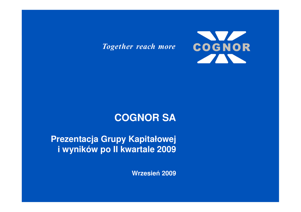 COGNOR SA Prezentacja Grupy Kapitałowej i wyników po II kwartale 2009 Wrzesień 2009 Spis treści Prezentacja Grupy Kapitałowej Restrukturyzacja Działalność operacyjna Wyniki finansowe po II kwartale 2009r. NajbliŜsze plany 2 Działalność Grupa COGNOR jest jednym z liderów dystrybucji produktów stalowych w Polsce i Europie Środkowej Nasza aktywność na rynku stalowym obejmuje: DZIAŁALNOŚĆ SPRZEDAś WYROBÓW HUTNICZYCH Produkty płaskie Pręty zbrojeniowe Rury stalowe Kształtowniki Produkty ze stali specjalnych Inne: siatki, druty, taśmy PRODUKCJA PRZETWÓRSTWO STALI Produkcja zbrojeń Produkcja blach dachowych USŁUGI Cięcie i gięcie produktów stalowych Inne usługi specjalistyczne Konsulting techniczny Akcje Spółki od marca 1997 roku notowane są na GPW w Warszawie Wprowadzona od początku 2009 roku Nowa marka COGNOR jest elementem scalającym naszą działalność zgodnie z hasłem: Together reach more – Razem osiągamy więcej 3 Działalność Działalność handlowa polega na dostarczaniu wyrobów wyprodukowanych przez huty do odbiorcy finalnego TRANZYT SPRZEDAś WYROBÓW HUTNICZYCH SPRZEDAś ZE SKŁADU SprzedaŜ prosto z huty z pominięciem składu Około 25% obrotu spółki MarŜe handlowe 5-8 % MoŜliwość duŜych terminowych kontraktów Około 75% obrotu spółki MarŜe handlowe 8-25 % MoŜliwość sprzedaŜy róŜnorodnych asortymentów SPRZEDAś HURTOWA SPRZEDAś DETALICZNA SprzedaŜ jednostkowa powyŜej 1 tony Około 70% obrotu spółki MarŜe handlowe 8-18 % SprzedaŜ jednostkowa do 1 tony Około 5% obrotu spółki MarŜe handlowe 10-25 % SprzedaŜ tranzytowa rozwijana jest poprzez wykorzystanie podmiotów produkcyjnych naleŜących do Złomrex SA oraz innych producentów SprzedaŜ ze składu rozwijana jest w oparciu o rozległą sieć własnych składów handlowych 4 Akcjonariat Dane ogólne: Liczba akcji 51 187 167 Liczba głosów na WZA 51 187 167 Kapitał akcyjny 102 374 334,00 zł Cena nominalna akcji Pozostali Akcjonariusze 34% 2,00 zł Struktura akcjonariatu: Akcjonariusz Liczba akcji Ilość głosów na WZA Udział % ZŁOMREX SA 33 628 623 33 628 623 65,70 % Pozostali 17 558 544 17 558 544 34,30 % Razem 51 187 167 51 187 167 100,00 % ZŁOMREX SA 66% Z tytułu kapitału warunkowego Złomrex SA posiada jeszcze 15.035.081 szt. warrantów uprawniających do objęcia akcji Cognor SA w stosunku 1:1. Złomrex opłacił je aportem w postaci akcji Złomrex Steel Services SA, posiadającej akcje Cognor Stahlhandel GmbH. Złomrex ma 10 lat na wykonanie warrantów, ma teŜ moŜliwość ich sprzedaŜy. 5 Organy spółki Rada Nadzorcza PRZEMYSŁAW SZTUCZKOWSKI – Przewodniczący Rady Nadzorczej PRZEMYSŁAW GRZESIAK – Członek Rady Nadzorczej Pan Przemysław Grzesiak ma wykształcenie wyŜsze (mgr inŜynier) – ukończył Wydział Metalurgiczny Politechniki Częstochowskiej w specjalności Energetyka Cieplna, Budowa Pieców Przemysłowych. Pan Przemysław Sztuczkowski posiada wykształcenie średnie – ukończył Pomaturalne Studium Obsługi Ruchu Turystycznego, specjalność: Technik obsługi ruchu turystycznego. Kariera zawodowa: od 1990 działalność gospodarcza pod nazwą Przedsiębiorstwo Obrotu Surowcami Wtórnymi Złomrex od 2002 do chwili obecnej w Złomrex SA jako Prezes Zarządu Pan Przemysław Sztuczkowski pełni równieŜ szereg funkcji w organach spółek Grupy Kapitałowej Złomrex SA Kariera zawodowa: 1989-1990 w Piecoexport Gliwice jako mistrz robót od 1990 w POSW Złomrex jako Dyrektor 1998-2002 w Złomrex SA jako Prezes Zarządu od 2002 w Złomrex SA jako Członek Zarządu od 2003 w Ferrostal Łabędy jako Członek Zarządu Pan Przemysław Grzesiak pełni równieŜ szereg funkcji w organach spółek Grupy Kapitałowej Złomrex SA Kariera zawodowa: 1996-2002 w Kredyt Bank SA jako analityk kredytowy od 2002 w Złomrex SA jako Dyrektor Finansowy od 2007 w Złomrex SA jako Członek Zarządu Pan Krzysztof Zoła pełni równieŜ szereg funkcji w organach spółek Grupy Kapitałowej Złomrex SA DOMINIK BARSZCZ – Członek Rady Nadzorczej ANNA KIEŁDANOWICZ – Członek Rady Nadzorczej Pan Dominik Barszcz ma wykształcenie wyŜsze (mgr ekonomii) – ukończył Wydział Finansów i Bankowości Akademii Ekonomicznej w Katowicach w specjalności: Rachunkowość Pani Anna Kiełdanowicz ma wykształcenie wyŜsze (mgr ekonomii) – ukończyła kierunek Zarządzanie i Marketing na Akademii Ekonomicznej we Wrocławiu. Kariera zawodowa: od 1990 w POSW Złomrex jako Specjalista, Zastępca Głównego Księgowego, Główny Księgowy 2003-2006 w Złomrex SA jako Z-ca Głównego Księgowego 2006 do chwili obecnej w Złomrex SA jako Główny Księgowy Pan Dominik Barszcz pełni równieŜ szereg funkcji w organach spółek Grupy Kapitałowej Złomrex SA 6 KRZYSZTOF ZOŁA – Członek Rady Nadzorczej Pan Krzysztof Zoła ma wykształcenie wyŜsze (mgr inŜynier) – ukończył Wydział Zarządzania Politechniki Częstochowskiej w specjalności: Zarządzanie w Przemyśle Maszynowym. Kariera zawodowa: 2001-2002 w Biurze Rachunkowym jako Asystentka 2002 w Gimnazjum nr 23 we Wrocławiu jako Referent 2002-2004 w Biurze Rachunkowym jako Specjalista 2004 w Work Service jako Starszy Specjalista 2002-2007 w Grupie Pronar jako Dyrektor Personalny od 2007 w Złomrex SA jako Dyrektor Personalny Pan Anna Kiełdanowicz pełni równieŜ szereg funkcji w organach spółek Grupy Kapitałowej Złomrex SA Organy spółki Zarząd KRZYSZTOF WALAROWSKI – PREZES ZARZĄDU DARIUSZ MASZCZYK – CZŁONEK ZARZĄDU Pan Krzysztof Walarowski ma wyŜsze wykształcenie (mgr ekonomii), ukończył Wydział Handlu Zagranicznego Szkoły Głównej Planowania i Statystyki (obecnie Szkoła Główna Handlowa) w Warszawie. Pan Dariusz Maszczyk ma wyŜsze wykształcenie (mgr inŜynier), ukończył Wydział Budowy Maszyn Politechniki Częstochowskiej a takŜe WyŜszą Szkołę Przedsiębiorczości i Zarządzania im. Koźmińskiego w Warszawie z tytułem MBA. Kariera zawodowa: Kariera zawodowa: 1979