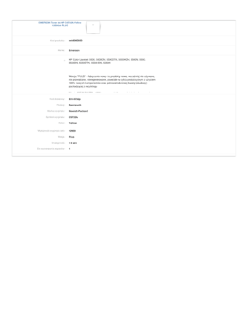 EMERSON Toner do HP C9732A Yellow 12000str PLUS Kod produktu: Marka: xxk6000020 Emerson HP Color Laserjet 5500, 5500DN, 5500DTN, 5500HDN, 5500N, 5550, 5550DN, 5550DTN, 5550HDN, 5550N Wersja "PLUS" - fabrycznie nowy- to produkty nowe, wcześniej nie używane, nie przerabiane, nieregenerowane, powstałe w cyklu produkcyjnym z użyciem 100% nowych komponentów oraz pełnowartościowej kasety(obudowy) pochodzącej z recyklingu Wersja "STANDARD" - 100% nowe- produkty, wcześniej nie używane, nie Kod dostawcy: Rodzaj: Marka oryginału: Symbol oryginału: Kolor: Wydajność (str): Wydajność oryginału (str): Wesja: Dostępność: Do wyczerpania zapasów: Ehl-9732p Zamiennik Hewlett-Packard C9732A Yellow 12000 Plus 1-5 dni 1