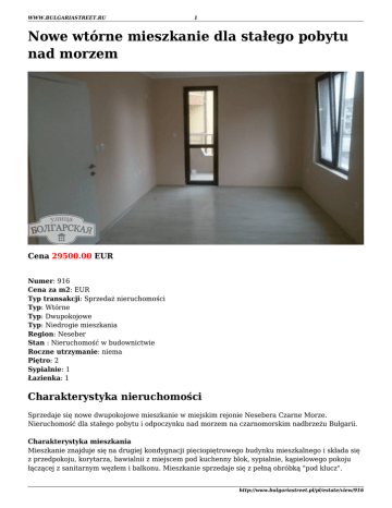 WWW.BULGARIASTREET.RU 1 Nowe wtórne mieszkanie dla stałego pobytu nad morzem Cena 29500.00 EUR Numer: 916 Cena za m2: EUR Typ transakcji: Sprzedaż nieruchomości Typ: Wtórne Typ: Dwupokojowe Typ: Niedrogie mieszkaniа Region: Neseber Stan : Nieruchomość w budownictwie Roczne utrzymanie: niema Piętro: 2 Sypialnie: 1 Łazienka: 1 Charakterystyka nieruchomości Sprzedaje się nowe dwupokojowe mieszkanie w miejskim rejonie Nesebera Czarne Morze. Nieruchomość dla stałego pobytu i odpoczynku nad morzem na czarnomorskim nadbrzeżu Bułgarii. Charakterystyka mieszkania Mieszkanie znajduje się na drugiej kondygnacji pięciopiętrowego budynku mieszkalnego i składa się z przedpokoju, korytarza, bawialnii z miejscem pod kuchenny blok, sypialnie, kąpielowego pokoju łączącej z sanitarnym węzłem i balkonu. Mieszkanie sprzedaje się z pełną obróbką "pod klucz". http://www.bulgariastreet.pl/pl/estate/view/916 WWW.BULGARIASTREET.RU 2 Mieszkanie jest nowe przytulne i światłe. Nowy kwartał Czarne Morze, proponuje współczesną infrastrukturę i komunikacje. Obok domu jest dziecięcy ogród, sklepy, рстораны, zatrzymania się miejskiego transportu. Do plaż 10 min chodu. W 700 m znajduje się popularny kurort Słoneczny Brzeg. Główne akcenty: ● ● ● ● ● Krokowa dostępność do plaż; Nowa budowla i mieszkanie; Młody rejon z rozwiniętą infrastrukturą; Doskonała cena; Bez taksa za obsługę; Wynagrodzenie otrzymujemy od sprzedawcy nieruchomości! Infrastruktura ● ● ● ● Miejsca parkingowe Elektrczność Woda Okna PVC Informacje o regionie Neseber - perła bułgarskiego nadbrzeża! To jedno z najdawniejszych miast Europy, które corocznie jak magnes przyciąga tysiące turystów z całego świata. Miasto dzieli się na dwie części: nową i starą. Miasto jest rozmieszczone do 37 km od Burgasa, 3 km od Słonecznego Brzegu Stary Neseber Dawna część miasta Neseber, co jest prawdziwym muzeum prosto nieba, jest rozmieszczona na skalistym półwyspie długością 850 m i szerokością 300 m. Miasto zjednoczone z lądem wąskim międzymorzem, długość którego składa zaledwie 400 m. Arcydzieło architektury - dawny Neseber jest włączony do spisu światowej kulturalnej spuścizny i z 1983 roku znajduje się pod egidą. Niepowtarzalną atmosferę stwarzają cerkwie, co brukuje się brukowcem przytulne uliczki, na których są rozmieszczone oszałamiające prastare domy z wykuszami. Wszystkiego w mieście 40 cerkwi, każda z których przedstawia prawdziwe dzieło sztuki. Nowy Neseber Nowa część Neseber jest współczesnym miastem, w którym stale mieszka miejscowa ludność. W mieście jest stworzona pierwszorzędna wewnętrzna infrastruktura, co włącza dziecięce przedszkolne instytucje, szkoły, medyczne centra, apteki, sklepy, restauracje, bistro, nocne kluby, kawiarnie, oddziały banków, poczta, policja i inna. Miasto wyróżnia dużą ilość terytoriów, co zadrzewia, ze strefami odpoczynku. Obok znajduje się аква-парк, do którego chodzi bezpłatny autobus. Klimat Klimat w mieście Несебр jest umiarkowany, przechodzący do śródziemnomorskiego. Latem temperatura powietrza osiąga + 28-30 stopniów Celsjusza, a woda nagrzewa się do notatki równą 26 http://www.bulgariastreet.pl/pl/estate/view/916 WWW.BULGARIASTREET.RU 3 stopniów Celsjusza. Plaże Plaże kurortu Neseber nie tylko czyste, ale i mają wygodny pochyły zachód w wodę, że tak ważnie dla dzieci i ludzi, co nie powinny pływać. Na plażach dyżurują ratownicy, ustalone parasole i szezlongi. Tu że opodal pracują kawiarnie, proponują napoje orzeźwiające i lekkie zakąski. http://www.bulgariastreet.pl/pl/estate/view/916 WWW.BULGARIASTREET.RU 4 http://www.bulgariastreet.pl/pl/estate/view/916 WWW.BULGARIASTREET.RU 5 http://www.bulgariastreet.pl/pl/estate/view/916 WWW.BULGARIASTREET.RU 6 http://www.bulgariastreet.pl/pl/estate/view/916 WWW.BULGARIASTREET.RU 7 http://www.bulgariastreet.pl/pl/estate/view/916 WWW.BULGARIASTREET.RU 8 http://www.bulgariastreet.pl/pl/estate/view/916 WWW.BULGARIASTREET.RU 9 http://www.bulgariastreet.pl/pl/estate/view/916 WWW.BULGARIASTREET.RU 10 Kontakty Agencja "Ulica Bułgarska" (Bulgaria Street Ltd) Bułgaria m. Burgas, 8000 ul. Mitropolit Simeon 3 Strona: www.bulgariastreet.ru Tel: + 359 894 51 50 51 Tel: + 48 223 906 334 Mail: [email protected] Mail: [email protected] Skype: bulstreet http://www.bulgariastreet.pl/pl/estate/view/916