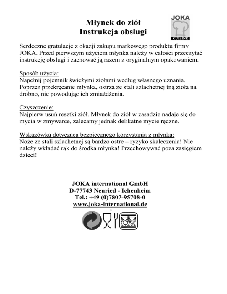 Młynek do ziół Instrukcja obsługi Serdeczne gratulacje z okazji zakupu markowego produktu firmy JOKA. Przed pierwszym użyciem młynka należy w całości przeczytać instrukcję obsługi i zachować ją razem z oryginalnym opakowaniem. Sposób użycia: Napełnij pojemnik świeżymi ziołami według własnego uznania. Poprzez przekręcanie młynka, ostrza ze stali szlachetnej tną zioła na drobno, nie powodując ich zmiażdżenia. Czyszczenie: Najpierw usuń resztki ziół. Młynek do ziół w zasadzie nadaje się do mycia w zmywarce, zalecamy jednak delikatne mycie ręczne. Wskazówka dotycząca bezpiecznego korzystania z młynka: Noże ze stali szlachetnej są bardzo ostre – ryzyko skaleczenia! Nie należy wkładać rąk do środka młynka! Przechowywać poza zasięgiem dzieci! JOKA international GmbH D-77743 Neuried - Ichenheim Tel.: +49 (0)7807-95708-0 www.joka-international.de •