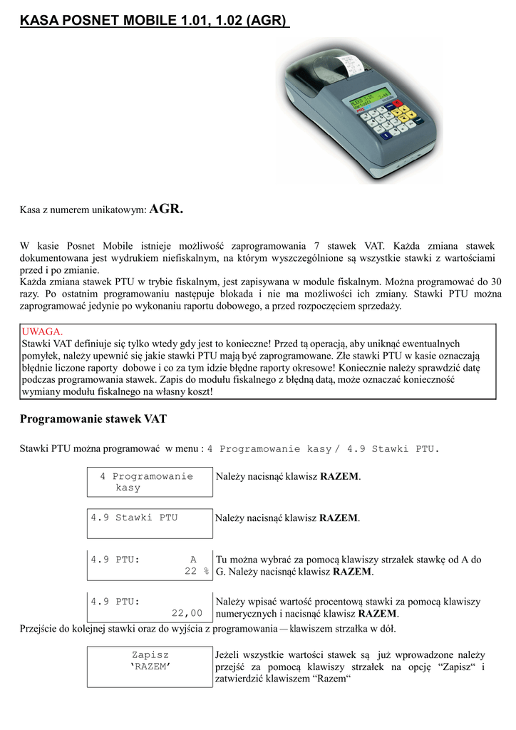KASA POSNET MOBILE 1.01, 1.02 (AGR) Kasa z numerem unikatowym: AGR. W kasie Posnet Mobile istnieje możliwość zaprogramowania 7 stawek VAT. Każda zmiana stawek dokumentowana jest wydrukiem niefiskalnym, na którym wyszczególnione są wszystkie stawki z wartościami przed i po zmianie. Każda zmiana stawek PTU w trybie fiskalnym, jest zapisywana w module fiskalnym. Można programować do 30 razy. Po ostatnim programowaniu następuje blokada i nie ma możliwości ich zmiany. Stawki PTU można zaprogramować jedynie po wykonaniu raportu dobowego, a przed rozpoczęciem sprzedaży. UWAGA. Stawki VAT definiuje siç tylko wtedy gdy jest to konieczne! Przed tą operacją, aby uniknąć ewentualnych pomyłek, należy upewnić się jakie stawki PTU mają być zaprogramowane. Złe stawki PTU w kasie oznaczają błędnie liczone raporty dobowe i co za tym idzie błędne raporty okresowe! Koniecznie należy sprawdzić datę podczas programowania stawek. Zapis do modułu fiskalnego z błędną datą, może oznaczać konieczność wymiany modułu fiskalnego na własny koszt! Programowanie stawek VAT Stawki PTU można programować w menu : 4 Programowanie kasy / 4.9 Stawki PTU. 4 Programowanie kasy 4.9 Stawki PTU Należy nacisnąć klawisz RAZEM. Należy nacisnąć klawisz RAZEM. A Tu można wybrać za pomocą klawiszy strzałek stawkę od A do 22 % G. Należy nacisnąć klawisz RAZEM. 4.9 PTU: Należy wpisać wartość procentową stawki za pomocą klawiszy numerycznych i nacisnąć klawisz RAZEM. Przejście do kolejnej stawki oraz do wyjścia z programowania — klawiszem strzałka w dół. 4.9 PTU: 22,00 Zapisz ‘RAZEM’ Jeżeli wszystkie wartości stawek są już wprowadzone należy przejść za pomocą klawiszy strzałek na opcję “Zapisz“ i zatwierdzić klawiszem “Razem“ Stawki, które należy zaprogramować można wybierać za pomocą klawiszy strzałek lub wpisując jej symbol. Aby zapisać programowane stawki PTU należy zatwierdzić opcję ‘Zapisz’ klawiszem RAZEM. Na wyświetlaczu pojawi siç pytanie o poprawność daty: Czy poprawna: 02/01/2011? Jeśli data na wyświetlaczu jest poprawna naciśnięcie klawisza RAZEM spowoduje zapis stawek do pamięci kasy i wydrukowanie dokumentu niefiskalnego potwierdzającego zmianę stawek. Stawki PTU zostaną zapisane do pamięci kasy TYLKO po wybraniu opcji ,,Zapisz”. 1. 2. 3. 4. 5. 6. 7. POSNET POLSKA S.A. UL. MUNICYPALNA 33 02-281 WARSZAWA Programowanie stawek możliwe jest tylko przy zerowych totalizerach (po NIP 123-456-78-90 raporcie dobowym). 2011-01-02 40 Do wprowadzania danych należy używać klawiszy numerycznych 0...9 Zmiana stawek PTU Zatwierdzenie wprowadzonej wielkości - naciśnięcie klawisza RAZEM. stare PTU: Wprowadzenie wartości 101 oznacza, że wybrana stawka jest PTU A 22% NIEAKTYWNA. PTU B 7% Wprowadzenie wartości 100 oznacza, że stawka jest ZWOLNIONA. PTU C 0% Kasowanie błędnie wprowadzonego znaku - naciśnięcie klawisza C. PTU D --Stawki PTU można zmieniać do 30 razy. Dalsza zmiana stawek jest PTU E --niemożliwa. Można pracować z ostatnio zapisanymi stawkami PTU. PTU F --G SP.ZW. PTU ------------------------------NOWE PTU: PTU A 23% PTU B 8% PTU C 5% PTU D --PTU E --PTU F --G SP.ZW. PTU NIEFISKALNY #1 KIEROW 10:45 Zmiana przypisania stawki VAT do PLU W celu przypisania stawek podatkowych przy pomocy klawiatury kasy należy z menu kierownika wybrać poz. 4 Programowanie kasy / 4.1 Baza PLU. 4 Programowanie kasy 4.1 Baza PLU Należy nacisnąć klawisz RAZEM. Należy nacisnąć klawisz RAZEM. 4.1 PLU: 254 4.1 PLU: Napój 17 Wyświetli się pierwszy wolny numer PLU. Należy nacisnąć klawisz RAZEM. W tym momencie należy wskazać numer pozycji w bazie kasy do edycji. istnieje 4.1 Nazwa: 4.1 PTU: Należy nacisnąć klawisz RAZEM. Należy nacisnąć klawisz RAZEM. Należy naciskać klawisz RAZEM do pozycji Napój przypisania stawki PTU. A Za pomocą klawiszy strzałek, wybieramy stawki 22% zdefiniowane w kasie. Po wybraniu właściwej, należy zatwierdzić klawiszem RAZEM. Za pomocą klawisza RAZEM należy przejść przez pozostałe parametry programowania PLU, do napisu: Zapisz RAZEM Należy nacisnąć klawisz RAZEM. Zatwierdzenie programowania potwierdzone jest wydrukiem niefiskalnym. Wyjście z programowania — klawiszem C.