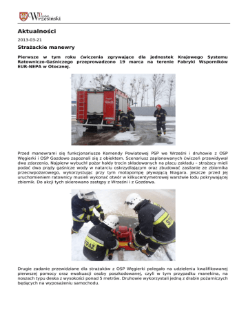 Aktualności 2013-03-21 Strażackie manewry Pierwsze w tym roku ćwiczenia zgrywające dla jednostek Krajowego Systemu Ratowniczo-Gaśniczego przeprowadzono 19 marca na terenie Fabryki Wsporników EUR-NEPA w Otocznej. Przed manewrami się funkcjonariusze Komendy Powiatowej PSP we Wrześni i druhowie z OSP Węgierki i OSP Gozdowo zapoznali się z obiektem. Scenariusz zaplanowanych ćwiczeń przewidywał dwa zdarzenia. Najpierw wybuchł pożar hałdy trocin składowanych na placu zakładu – strażacy mieli podać dwa prądy gaśnicze wody w natarciu oskrzydlającym oraz zbudować zasilanie ze zbiornika przeciwpożarowego, wykorzystując przy tym motopompę pływającą Niagara. Jeszcze przed jej uruchomieniem ratownicy musieli wykonać otwór w kilkucentymetrowej warstwie lodu pokrywającej zbiornik. Do akcji tych skierowano zastępy z Wrześni i z Gozdowa. Drugie zadanie przewidziane dla strażaków z OSP Węgierki polegało na udzieleniu kwalifikowanej pierwszej pomocy oraz ewakuacji osoby poszkodowanej, czyli w tym przypadku manekina, na noszach typu deska z wysokości ponad 5 metrów. Druhowie wykorzystali jedną z drabin pożarniczych będących na wyposażeniu samochodu. Podczas ćwiczeń sprawdzono przygotowanie ratowników do wyznaczenia miejsca do lądowania dla śmigłowca lotniczego pogotowia ratunkowego oraz umiejętność prawidłowej obsługi pilarki do drewna. Oceniano również sprawność w podejmowaniu decyzji. Podsumowanie manewrów odbyło się w remizie jednostki OSP w Węgierkach. st. kpt. Marek Mikołajczak Zdjęcia: st. kpt. Rafał Zasada