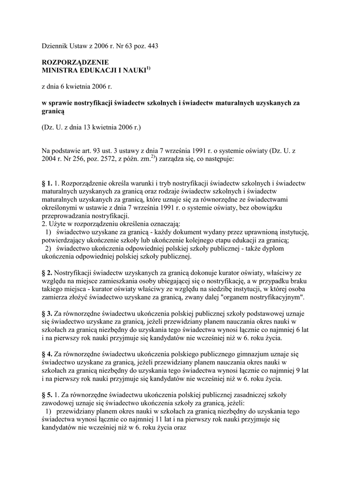 Dziennik Ustaw z 2006 r. Nr 63 poz. 443 ROZPORZĄDZENIE MINISTRA EDUKACJI I NAUKI1) z dnia 6 kwietnia 2006 r. w sprawie nostryfikacji świadectw szkolnych i świadectw maturalnych uzyskanych za granicą (Dz. U. z dnia 13 kwietnia 2006 r.) Na podstawie art. 93 ust. 3 ustawy z dnia 7 września 1991 r. o systemie oświaty (Dz. U. z 2004 r. Nr 256, poz. 2572, z późn. zm.2)) zarządza się, co następuje: § 1. 1. Rozporządzenie określa warunki i tryb nostryfikacji świadectw szkolnych i świadectw maturalnych uzyskanych za granicą oraz rodzaje świadectw szkolnych i świadectw maturalnych uzyskanych za granicą, które uznaje się za równorzędne ze świadectwami określonymi w ustawie z dnia 7 września 1991 r. o systemie oświaty, bez obowiązku przeprowadzania nostryfikacji. 2. UŜyte w rozporządzeniu określenia oznaczają: 1) świadectwo uzyskane za granicą - kaŜdy dokument wydany przez uprawnioną instytucję, potwierdzający ukończenie szkoły lub ukończenie kolejnego etapu edukacji za granicą; 2) świadectwo ukończenia odpowiedniej polskiej szkoły publicznej - takŜe dyplom ukończenia odpowiedniej polskiej szkoły publicznej. § 2. Nostryfikacji świadectw uzyskanych za granicą dokonuje kurator oświaty, właściwy ze względu na miejsce zamieszkania osoby ubiegającej się o nostryfikację, a w przypadku braku takiego miejsca - kurator oświaty właściwy ze względu na siedzibę instytucji, w której osoba zamierza złoŜyć świadectwo uzyskane za granicą, zwany dalej "organem nostryfikacyjnym". § 3. Za równorzędne świadectwu ukończenia polskiej publicznej szkoły podstawowej uznaje się świadectwo uzyskane za granicą, jeŜeli przewidziany planem nauczania okres nauki w szkołach za granicą niezbędny do uzyskania tego świadectwa wynosi łącznie co najmniej 6 lat i na pierwszy rok nauki przyjmuje się kandydatów nie wcześniej niŜ w 6. roku Ŝycia. § 4. Za równorzędne świadectwu ukończenia polskiego publicznego gimnazjum uznaje się świadectwo uzyskane za granicą, jeŜeli przewidziany planem nauczania okres nauki w szkołach za granicą niezbędny do uzyskania tego świadectwa wynosi łącznie co najmniej 9 lat i na pierwszy rok nauki przyjmuje się kandydatów nie wcześniej niŜ w 6. roku Ŝycia. § 5. 1. Za równorzędne świadectwu ukończenia polskiej publicznej zasadniczej szkoły zawodowej uznaje się świadectwo ukończenia szkoły za granicą, jeŜeli: 1) przewidziany planem okres nauki w szkołach za granicą niezbędny do uzyskania tego świadectwa wynosi łącznie co najmniej 11 lat i na pierwszy rok nauki przyjmuje się kandydatów nie wcześniej niŜ w 6. roku Ŝycia oraz 2) zajęcia edukacyjne zrealizowane w szkole za granicą odpowiadają wiodącym zajęciom edukacyjnym kształcenia ogólnego i kształcenia zawodowego odpowiedniej polskiej publicznej zasadniczej szkoły zawodowej. 2. JeŜeli warunki, o których mowa w ust. 1 pkt 2, nie zostały spełnione, świadectwo ukończenia szkoły za granicą, o którym mowa w ust. 1, uznaje się za równorzędne świadectwu ukończenia odpowiedniej polskiej publicznej zasadniczej szkoły zawodowej po zdaniu, określonych przez organ nostryfikacyjny, egzaminów z zajęć edukacyjnych kształcenia ogólnego lub kształcenia zawodowego. § 6. 1. Za równorzędne świadectwu ukończenia polskiego publicznego liceum ogólnokształcącego uznaje się świadectwo ukończenia szkoły za granicą, jeŜeli: 1) przewidziany planem okres nauki w szkołach za granicą niezbędny do uzyskania tego świadectwa wynosi łącznie co najmniej 11 lat i na pierwszy rok nauki przyjmuje się kandydatów nie wcześniej niŜ w 6. roku Ŝycia oraz 2) zajęcia edukacyjne zrealizowane w szkole za granicą odpowiadają wiodącym zajęciom edukacyjnym kształcenia ogólnego odpowiedniego polskiego publicznego liceum ogólnokształcącego. 2. JeŜeli warunki, o których mowa w ust. 1 pkt 2, nie zostały spełnione, świadectwo ukończenia szkoły za granicą, o którym mowa w ust. 1, uznaje się za równorzędne świadectwu ukończenia odpowiedniego polskiego publicznego liceum ogólnokształcącego po zdaniu, określonych przez organ nostryfikacyjny, egzaminów z zajęć edukacyjnych kształcenia ogólnego. § 7. 1. Za równorzędne świadectwu ukończenia polskiego publicznego liceum profilowanego uznaje się świadectwo ukończenia szkoły za granicą, jeŜeli: 1) przewidziany planem okres nauki w szkołach za granicą niezbędny do uzyskania tego świadectwa wynosi łącznie co najmniej 11 lat i na pierwszy rok nauki przyjmuje się kandydatów nie wcześniej niŜ w 6. roku Ŝycia oraz 2) zajęcia edukacyjne zrealizowane w szkole za granicą odpowiadają wiodącym zajęciom edukacyjnym kształcenia ogólnego i zajęciom edukacyjnym w danym profilu kształcenia ogólnozawodowego odpowiedniego polskiego publicznego liceum profilowanego. 2. JeŜeli warunki, o których mowa w ust. 1 pkt 2, nie zostały spełnione, świadectwo ukończenia szkoły za granicą, o którym mowa w ust. 1, uznaje się za równorzędne świadectwu ukończenia odpowiedniego polskiego publicznego liceum profilowanego po zdaniu, określonych przez organ nostryfikacyjny, egzaminów z zajęć edukacyjnych kształcenia ogólnego lub zajęć edukacyjnych w danym profilu kształcenia ogólnozawodowego. § 8. 1. Za równorzędne świadectwu ukończenia polskiego publicznego technikum uznaje się świadectwo ukończenia szkoły za granicą, jeŜeli: 1) przewidziany planem okres nauki w szkołach za granicą niezbędny do uzyskania tego świadectwa wynosi łącznie co najmniej 12 lat i na pierwszy rok nauki przyjmuje się kandydatów nie wcześniej niŜ w 6. roku Ŝycia oraz 2) zajęcia edukacyjne zrealizowane w szkole za granicą odpowiadają wiodącym zajęciom edukacyjnym kształcenia ogólnego i kształcenia zawodowego odpowiedniego polskiego publicznego technikum. 2. JeŜeli warunki, o których mowa w ust. 1 pkt 2, nie zostały spełnione, świadectw