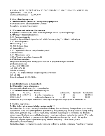 KA RTA B EZP IECZ EŃ S TWA W ZG OD N OŚ CI Z 1907/2006/EC(A N EK S II) opracowana: 27.08.2008 ostatnia aktualizacja: 02.09.2010 1 Identyfikacja preparatu 1.1 Dane odnośnie produktu. Identyfikacja preparatu Nazwa handlowa: Sekundenkleber Contact Receptura - nr: nie dysponujemy 1.2 Zastosowanie substancji/preparatu Klej jednoskładnikowy na bazie estru akrylowego kwasu cyjanoakrylowego 1.3 Dane producenta/importera 1.3.1 Adres producenta: Omnident Dental-Handelsgesellschaft mbH Gutenbergring 7 – 9 D-63110 Rodgau 1.3.2 Adres importera: Marrodent sp. z o.o. 43-300 Bielsko-Biała ul. Krasińskiego 31 1.3.3 Odpowiedzialny za kartę charakterystyki: Artur Podolski 1.3.4 Aktualizacja karty ABRA Toruń; mgr Adam Karczewski 1.4 Telefon awaryjny: Miejsce udzielania porad awaryjnych - telefon w przypadku objaw zatrucia producent/dostawca tel/fax: 033/ 827 83 13 tel: 801 36 36 99 Telefon alarmowy: 042/ 631 47 24 (informacja toksykologiczna w Polsce) 999 lub 112 Data aktualizacji 02.09.2010 r. 2 Skład i informacja o składnikach 2.1 Charakteryzacja chemiczna: Zawiera polietakrylan metylu i cyjanoakrylan 2.2 Zawartość materiałów niebezpiecznych: CAS Nr EWG, Nazwa Zakres m% Symbole Symbole R 007085-85-0 230-391-5 2-etylo cyjanoakrylan > 85 Xi 36/37/38 009011-14-7 polimetakrylan metylu <= 15 Xi 20/22 Pełna treść przytoczonych wskazówek dotyczących zagrożeń znajduje się w rozdziale 16. 3 Możliwe zagrożenia 3.1 Dla ludzi: (dane uzupełniające patrz punkt 11) : Produkt działa drażniąco na drogi oddechowe i skórę, jest wchłaniany do organizmu przez drogi oddechowe, skórę oraz przez przewód pokarmowy. Wdychane pary drażnią śluzówkę jamy ustnej, oczu, nosa, górnych dróg oddechowych. Przy wysokim stężeniu par w powietrzu ma działanie narkotyczne. Działanie przez układ pokarmowy może powodować nudności i wymioty. W wyniku długotrwałego działania preparatu może dojść do uszkodzenia wątroby i nerek. W wyniku hydrolizy preparatu powstaje silnie trujący alkohol metylowy i kwas metakrylowy. Produkt wysoce łatwopalny. Produkt podlega obowiązkowi oznakowania na podstawie metody obliczania "Ogólnej wytycznej klasyfikowania preparatów w UE" w jej ostatnio ważnej wersji. 3.2 Dla środowiska: W dużych ilościach trujący dla organizmów wodnych, może spowodować długotrwałe szkodliwe oddziaływanie w środowiskach wodnych.. 3.3 Dla materiałów: Przed zastosowaniem materiałów należy sprawdzić ich odporność. 4 Pierwsza pomoc – postępowanie 4.1 Przy wdychaniu: Wyprowadzić ze strefy skażonej i zapewnić dostęp świeżego powietrza. W przypadku wystąpienia takiej potrzeby – wykonać sztuczne oddychanie lub podać tlen – najlepiej, jeśli tego dokona osoba przeszkolona. Zapewnić pomoc lekarską. 4.2 Przy kontakcie ze skórą: Zdjąć skażone ubranie. Oczyścić mechanicznie skażoną skórę, przemyć dużą ilością wody z mydłem. W przypadku gdy podrażnienie skóry nie mija, skonsultować się z lekarzem dermatologiem. 4.3 Przy kontakcie z oczami: Przemyć skażone oczy strumieniem letniej wody przez 15-20 minut, przy wywiniętych powiekach. Zapewnić pomoc okulisty. 4.4 W przypadku połknięcia: Natychmiast wezwać lekarza. W razie zatrucia doustnego przepłukać usta wodą. Nie powodować wymiotów u osoby nieprzytomnej. 4.5 Wskazówki dla lekarza: Duszności . W razie podrażnienia płuc pierwsza pomoc przy użyciu deksametazonu w aerozolu. (Dexamethason Dosieraerosol) 4.6 Specjalny materiał przy udzielaniu pierwszej pomocy: nie dysponujemy 5 Postępowanie w przypadku pożaru 5.1 Środki gaśnicze właściwe ze względu na rodzaj substancji: Większe pożary zwalczać pianą odporną na działanie alkoholu lub dużą ilością rozpryskiwanej wody. Małe pożary gasić proszkiem, dwutlenkiem węgla, strumieniem rozpryskiwanej wody. 5.2 Środki gaśnicze, których nie wolno używać ze względów bezpieczeństwa: Woda pełnym strumieniem 5.3 Szczególne zagrożenia spowodowane materiałem, jego produktami spalania i powstające gazy: Przy ogrzewaniu lub w wypadku pożaru możliwe jest tworzenie się trujących gazów – tlenków azotu (NOx), tlenku węgla (CO). 5.4 Wskazówki dodatkowe Akcję gaśniczą i ratunkową oraz porządkowanie miejsca pożaru na terenie znajdującym się w zasięgu gazów pożarowych i wytlewnych można prowadzić wyłącznie przy użyciu ciężkiego sprzętu do ochrony dróg oddechowych. Nie wdychać gazów powstałych w wyniku eksplozji lub pożaru. Produkt nie może się dostać do kanalizacji 5.5 Szczególne wyposażenie ochronne : Używać aparatu oddechowego z niezależnym dopływem powietrza. 5.6 Inne informacje Zużyte środki gaśnicze zebrać i usunąć zgodnie z obowiązującymi przepisami 6 Postępowanie w przypadku niezamierzonego uwolnienia do środowiska 6.1 Indywidualne środki ostrożności: Chronić skórę, oczy i odzież przed stycznością z preparatem. Nosić ubranie ochronne. Zapewnić wystarczającą wentylację. Osoby zagrożone przenieść w bezpieczne miejsce. 6.2 Środki ostrożności dotyczące ochrony środowiska i minimalizowanie skutków: Zapobiec przeniknięciu do kanalizacji, rowów i piwnic. Poczekać aż ulegnie związaniu i usuwać. 6.3 Wskazówki dodatkowe: Wchłaniać przy pomocy materiałów wiążących ciecze (ziemia okrzemkowa, trociny, przy małych ilościach użyć ligniny). Nie zmywać wodą ani wodnymi środkami myjącymi. W odpowiednich pojemnikach dostarczyć do odzysku lub unieszkodliwiania. Informacje na temat osobistego wyposażenia ochronnego patrz rozdział 8. Informacje na temat utylizacji patrz rozdział 13. 7 Postępowanie z preparatem i jego magazynowanie (przepisy krajowe patrz punkt 15.2) 7.1 Postępowanie 7.1.1 Wskazówki do bezpiecznego postępowania: Chronić skórę, oczy i odzież przed kontaktem z preparatem. Zachować ostrożność przy otwieraniu i manipulowaniu pojemnikami. Podczas stosowania preparatu nie jeść, nie pić, unikać kontaktów z ci