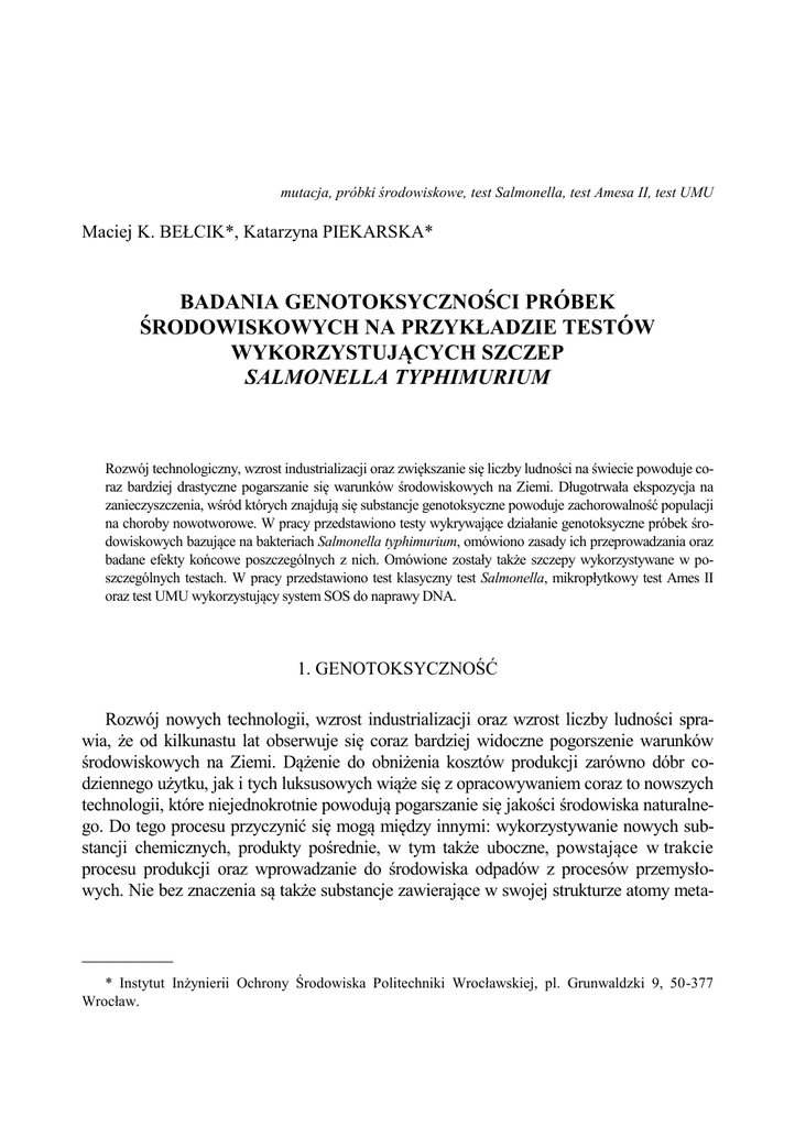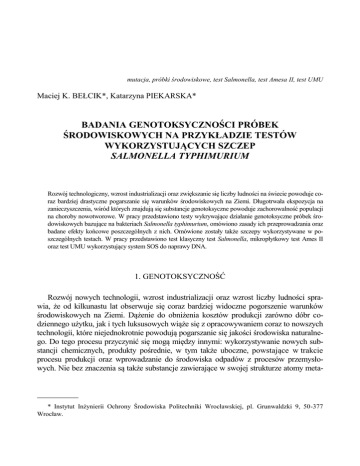 mutacja, próbki środowiskowe, test Salmonella, test Amesa II, test UMU Maciej K. BEŁCIK*, Katarzyna PIEKARSKA* BADANIA GENOTOKSYCZNOŚCI PRÓBEK ŚRODOWISKOWYCH NA PRZYKŁADZIE TESTÓW WYKORZYSTUJĄCYCH SZCZEP SALMONELLA TYPHIMURIUM Rozwój technologiczny, wzrost industrializacji oraz zwiększanie się liczby ludności na świecie powoduje coraz bardziej drastyczne pogarszanie się warunków środowiskowych na Ziemi. Długotrwała ekspozycja na zanieczyszczenia, wśród których znajdują się substancje genotoksyczne powoduje zachorowalność populacji na choroby nowotworowe. W pracy przedstawiono testy wykrywające działanie genotoksyczne próbek środowiskowych bazujące na bakteriach Salmonella typhimurium, omówiono zasady ich przeprowadzania oraz badane efekty końcowe poszczególnych z nich. Omówione zostały także szczepy wykorzystywane w poszczególnych testach. W pracy przedstawiono test klasyczny test Salmonella, mikropłytkowy test Ames II oraz test UMU wykorzystujący system SOS do naprawy DNA. 1. GENOTOKSYCZNOŚĆ Rozwój nowych technologii, wzrost industrializacji oraz wzrost liczby ludności sprawia, że od kilkunastu lat obserwuje się coraz bardziej widoczne pogorszenie warunków środowiskowych na Ziemi. Dążenie do obniżenia kosztów produkcji zarówno dóbr codziennego użytku, jak i tych luksusowych wiąże się z opracowywaniem coraz to nowszych technologii, które niejednokrotnie powodują pogarszanie się jakości środowiska naturalnego. Do tego procesu przyczynić się mogą między innymi: wykorzystywanie nowych substancji chemicznych, produkty pośrednie, w tym także uboczne, powstające w trakcie procesu produkcji oraz wprowadzanie do środowiska odpadów z procesów przemysłowych. Nie bez znaczenia są także substancje zawierające w swojej strukturze atomy meta- __________ * Instytut Inżynierii Ochrony Środowiska Politechniki Wrocławskiej, pl. Grunwaldzki 9, 50-377 Wrocław. 38 M.K. BEŁCIK, K. PIEKARSKA li. Wszystkie te czynniki oddziałując na środowisko powodują także niekorzystny wpływ na zwierzęta oraz ludzi [1]. Szacuje się, że dorosły człowiek pobiera w ciągu doby od 12 do 15 m3 powietrza, a zapotrzebowanie na wodę u dorosłego człowieka, w zależności od warunków atmosferycznych oraz trybu życia, waha się od 2 od 5 dm3 wody na dobę. Ponadto, dieta zawiera wiele owoców i warzyw, które pobierają wodę oraz sole mineralne z gleby [1]. Dziś coraz powszechniejsza staje się zachorowalność na choroby nowotworowe. Jednym z podstawowych czynników prowadzących do tego stanu rzeczy jest stosunkowo łatwe narażenie na działanie substancji powodujących uszkodzenia materiału genetycznego. Związki takie nazywamy związkami genotoksycznymi, a genotoksycznością zjawisko wywoływane przez nie, powodujące szkodliwe działanie na materiał genetyczny [2, 3]. Czynniki powodujące trwałe zmiany w materiale genetycznym mogą mieć charakter chemiczny wywoływany przez określone substancje, należące zazwyczaj do grupy substancji organicznych, bądź charakter fizyczny wywoływany przez promieniowanie UV lub promieniowanie X [4]. Najlepiej poznanymi i zidentyfikowanymi związkami o właściwościach genotoksycznych są substancje takie jak: wielopierścieniowe węglowodory aromatyczne, jedno- i dwupierścieniowe węglowodory aromatyczne, węglowodory alifatyczne, cykloalkany, oraz takie, które w swoich strukturach zawierają metale, siarkę, chlor bądź tlen [2, 5]. Analiza chemiczna wszystkich substancji występujących w próbkach środowiskowych jest niemożliwa z wielu względów z których najistotniejszymi są: brak technik analitycznych pozwalających na wykrywanie wszystkich związków, mnogość powstających substancji chemicznych w różnych gałęziach przemysłu, wzajemne oddziaływania między nimi, wysokie koszty analiz oraz konieczność zastosowania specjalistycznych technik analitycznych, obecność poszczególnych związków na poziomie śladowym trudno wykrywalnym w trakcie badań [2]. Wśród badań genotoksyczności próbek środowiskowych najczęściej wykorzystuje się badania przesiewowe. Ich celem jest wyselekcjonowanie poszczególnych substancji, które należałoby poddać dalszej i bardziej starannej obserwacji. Badania przesiewowe opierają się głównie na krótkoterminowych testach bakteryjnych. Wśród testów najczęściej wymienianych w literaturze występują klasyczny test Salmonella, test kometkowy, test SOS Chromotest oraz test UMU [6-9]. Alternatywą do testów bakteryjnych są testy z wykorzystaniem organizmów eukariotycznych takich jak: grzyby, ryby, rośliny, owady [3, 10, 11, 12]. W niniejszej pracy skupiono się na porównaniu testów wykorzystujących szczep bakteryjny Salmonella typhimurium w badaniach genotoksyczności próbek środowiskowych. Badania genotoksyczności próbek środowiskowych na przykładzie testów wykorzystujących… 39 2. KLASYCZNY TEST SALMONELLA (AMESA) Klasyczny test bakteryjny Salmonella opracowany został w latach 70. XX wieku przez Bruca Amesa i nazwany jego nazwiskiem. Niedługo później zyskał powszechne uznanie wśród badaczy zajmujących się mutagennością, a także jest zalecany przez Międzynarodową Agencję Badań nad Rakiem (International Agenccy for Research on Cancer) oraz proponowany do oceny jakości zdrowotnej wody przeznaczonej do spożycia przez Standard Methods for Examination of Water and Wastwater US EPA [2, 4]. Zasada testu polega na badaniu występowania rewersji mutacji u histydynozależnych auksotroficznych szczepów Salmonella typhimurium LT2. Szczepy wykorzystywane do badania zostały zmutowane w taki sposób, aby nie miały możliwości syntezy histydyny. Ponadto, do szczepów wprowadzana została mutacja rfa powodującą zwiększoną przepuszczalność błony komórkowej poprzez zmianę jej składników lipoproteinowych oraz delecja ΔuvrB zmniejszająca zdolność naprawy materiału genetycznego poprzez wycinan