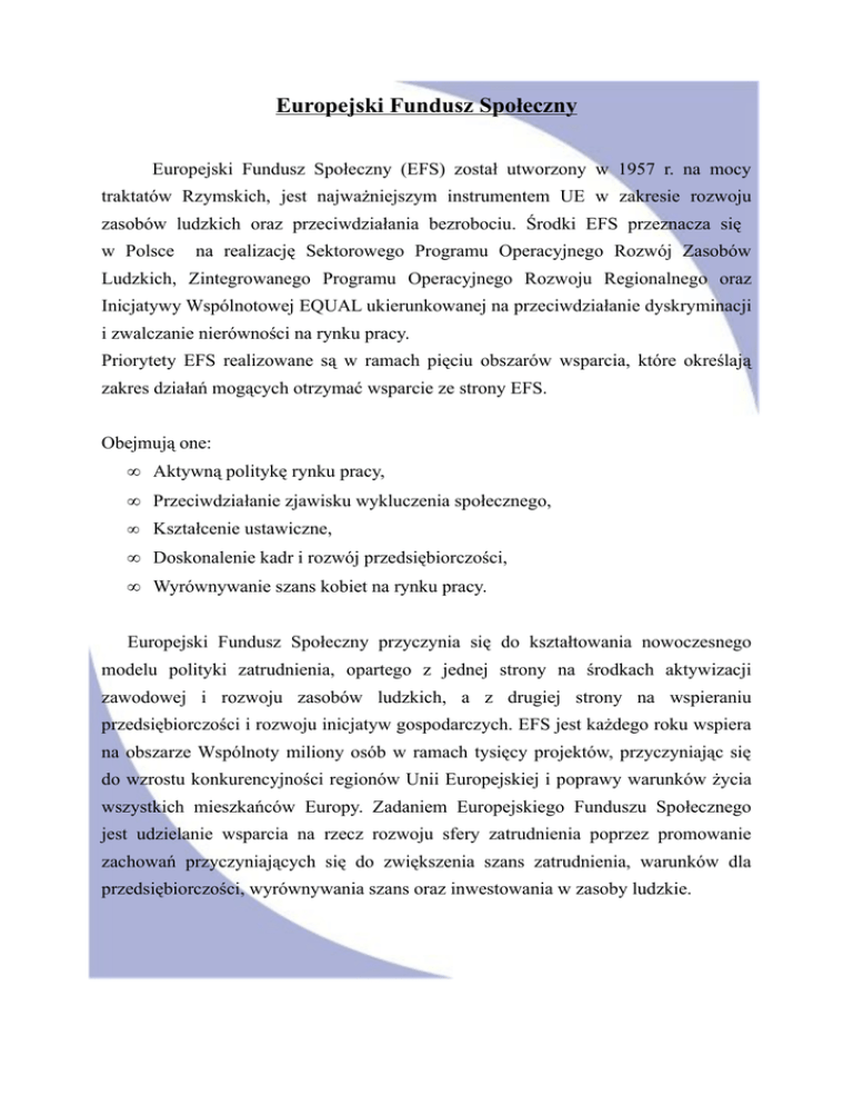 Europejski Fundusz Społeczny Europejski Fundusz Społeczny (EFS) został utworzony w 1957 r. na mocy traktatów Rzymskich, jest najważniejszym instrumentem UE w zakresie rozwoju zasobów ludzkich oraz przeciwdziałania bezrobociu. Środki EFS przeznacza się w Polsce na realizację Sektorowego Programu Operacyjnego Rozwój Zasobów Ludzkich, Zintegrowanego Programu Operacyjnego Rozwoju Regionalnego oraz Inicjatywy Wspólnotowej EQUAL ukierunkowanej na przeciwdziałanie dyskryminacji i zwalczanie nierówności na rynku pracy. Priorytety EFS realizowane są w ramach pięciu obszarów wsparcia, które określają zakres działań mogących otrzymać wsparcie ze strony EFS. Obejmują one: • Aktywną politykę rynku pracy, • Przeciwdziałanie zjawisku wykluczenia społecznego, • Kształcenie ustawiczne, • Doskonalenie kadr i rozwój przedsiębiorczości, • Wyrównywanie szans kobiet na rynku pracy. Europejski Fundusz Społeczny przyczynia się do kształtowania nowoczesnego modelu polityki zatrudnienia, opartego z jednej strony na środkach aktywizacji zawodowej i rozwoju zasobów ludzkich, a z drugiej strony na wspieraniu przedsiębiorczości i rozwoju inicjatyw gospodarczych. EFS jest każdego roku wspiera na obszarze Wspólnoty miliony osób w ramach tysięcy projektów, przyczyniając się do wzrostu konkurencyjności regionów Unii Europejskiej i poprawy warunków życia wszystkich mieszkańców Europy. Zadaniem Europejskiego Funduszu Społecznego jest udzielanie wsparcia na rzecz rozwoju sfery zatrudnienia poprzez promowanie zachowań przyczyniających się do zwiększenia szans zatrudnienia, warunków dla przedsiębiorczości, wyrównywania szans oraz inwestowania w zasoby ludzkie. „Światełko w tunelu EFS” Światełko w tunelu EFS – to projekt współfinansowany ze środków Unii Europejskiej w ramach Europejskiego Funduszu Społecznego. Realizowany przez Zespół Zarządzający w składzie: Kierownik Projektu: Mariusz Krzyżaniak, Asystent Kierownika Projektu Anna Wójcik – Mierzwiak, Koordynator Administracyjno – Księgowy – Anna Majewska, Koordynator Kampanii Informacyjno – Promocyjnej Anna Dembkiewicz. Projekt adresowany jest do 90 osób długotrwale bezrobotnych, powyżej 24 miesięcy, korzystających z pomocy Miejskiego Ośrodka Pomocy Społecznej w Płocku oraz 95 pracowników MOPS Płock. Celem projektu jest przeciwdziałanie zjawisku wykluczenia społecznego i promocja aktywnej polityki społecznej poprzez wsparcie grup szczególnego ryzyka. Osoby długotrwale bezrobotne objęte zostaną wsparciem w ramach: 1) reintegracji społecznej: warsztaty motywacyjne i nauki planowania życia, 2) reintegracji zawodowej: szkolenia zawodowe. Pierwsza grupa beneficjentów ostatecznych, osób długotrwale bezrobotnych, rozpoczęła zajęcia w miesiącu wrześniu 2006r. Są to zajęcia indywidualne, prowadzone przez dwóch doradców zawodowych, a ich uwieńczeniem będzie stworzenie dla każdego uczestnika Indywidualnego Planu Kariery Zawodowej. Do tej pory w zajęciach udział wzięło 78 osób. Kolejnym etapem projektu będzie moduł reintegracji społecznej realizowany poprzez zorganizowanie warsztatów terapeutycznych prowadzonych przez psychologów i doradców zawodowych. Warsztaty te obejmowały będą m.in. zagadnienia z zakresu: komunikacji interpersonalnej, sztuki skutecznego porozumiewania się, treningu zachowań asertywnych, wzmacniania samooceny i poczucia własnej wartości, umiejętności radzenia sobie ze stresem, wzmacniania motywacji do aktywności zawodowej i społecznej. Warsztaty prowadzone będą w grupach 15 osobowych i trwały będą do końca roku 2006r. Od stycznia 2007r realizowany będzie moduł reintegracji zawodowej. 15 beneficjentów ostatecznych zostanie objętych wsparciem w ramach 260 godzinnego szkolenia w zakresie Nowoczesne metody wykończeniowe w budownictwie, 30 osób uczęszczać będzie na 232 godzinne szkolenie z zakresu Opiekun ludzi starszych i dzieci, dla 15 osób zostanie zorganizowane 220 godzinne szkolenie w zakresie Kosmetyczka z elementami wizażu, kolejnych 10 osób będzie uczęszczać na 250 godzinne szkolenie w zakresie Fryzjer, Kucharz Barman z elementami przyjęć okolicznościowych, to 220 godzinne szkolenie dla 10 osób, kolejnych 10 beneficjentów ostatecznych uczestniczyć będzie w 220 godzinnym szkoleniu w zakresie Spawacz z uprawnieniami c.o.2. W/w szkolenia zawierały będą moduł nauki obsługi komputera/Internetu. Według wstępnych planów szkolenia odbywały się będą średnio 3 dni w tygodniu po 6 godzin dziennie. Po ukończeniu szkoleń dla 20 uczestników zorganizowany zostanie 80 godzinny kurs z zakresu przedsiębiorczości – prowadzenia własnej działalności gospodarczej, 5 beneficjentów uczestniczyć będzie w kursie Prawo jazdy kat. C. W trakcie szkoleń zawodowych uczestnicy otrzymają dodatki szkoleniowe oraz wyżywienie. Dodatkowym wsparciem będzie zapewnienie opieki nad dziećmi do lat 7, wychowywanymi przez samotnych beneficjentów ostatecznych. Pracownicy MOPS w Płocku podnoszą swoje kwalifikacje zawodowe w ramach zorganizowanych szkoleń wyjazdowych oraz nauki języków obcych. Od miesiąca czerwca 6 pracowników uczestniczy w szkoleniu z zakresu terapia rodzin, 36 pracowników socjalnych ukończyło już szkolenia, a 12 jedzie w najbliższym czasie na ostatnie w zakresie „Pracownicy socjalni wobec problemu bezdomności”, 6 pracowników podnosi kwalifikacje zawodowe w trakcie szkolenia w zakresie terapii uzależnień, 2 osoby ukończyły szkolenie w zakresie pracy z rodzinami zastępczymi i wychowankami placówek opiekuńczo – wychowawczych, kolejne 4 osoby je kontynuują. Dla 30 pracowników w ramach projektu „Światełko w tunelu EFS” zostały zorganizowane kursy z języka angielskiego i francuskiego. W trakcie realizacji projektu będzie promowana idea wolontariatu jako formy pracy w zakresie integracji z rynkiem pracy osób zagrożonych wykluczeniem społeczn